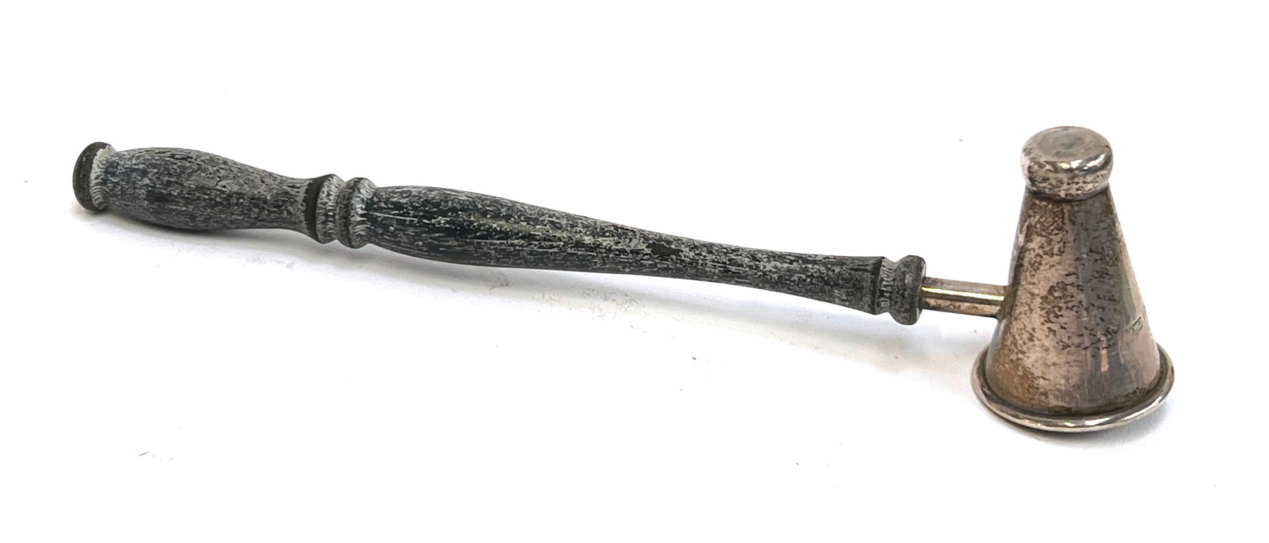 A silver candle snuffer with turned wooden handle, Birmingham 1996