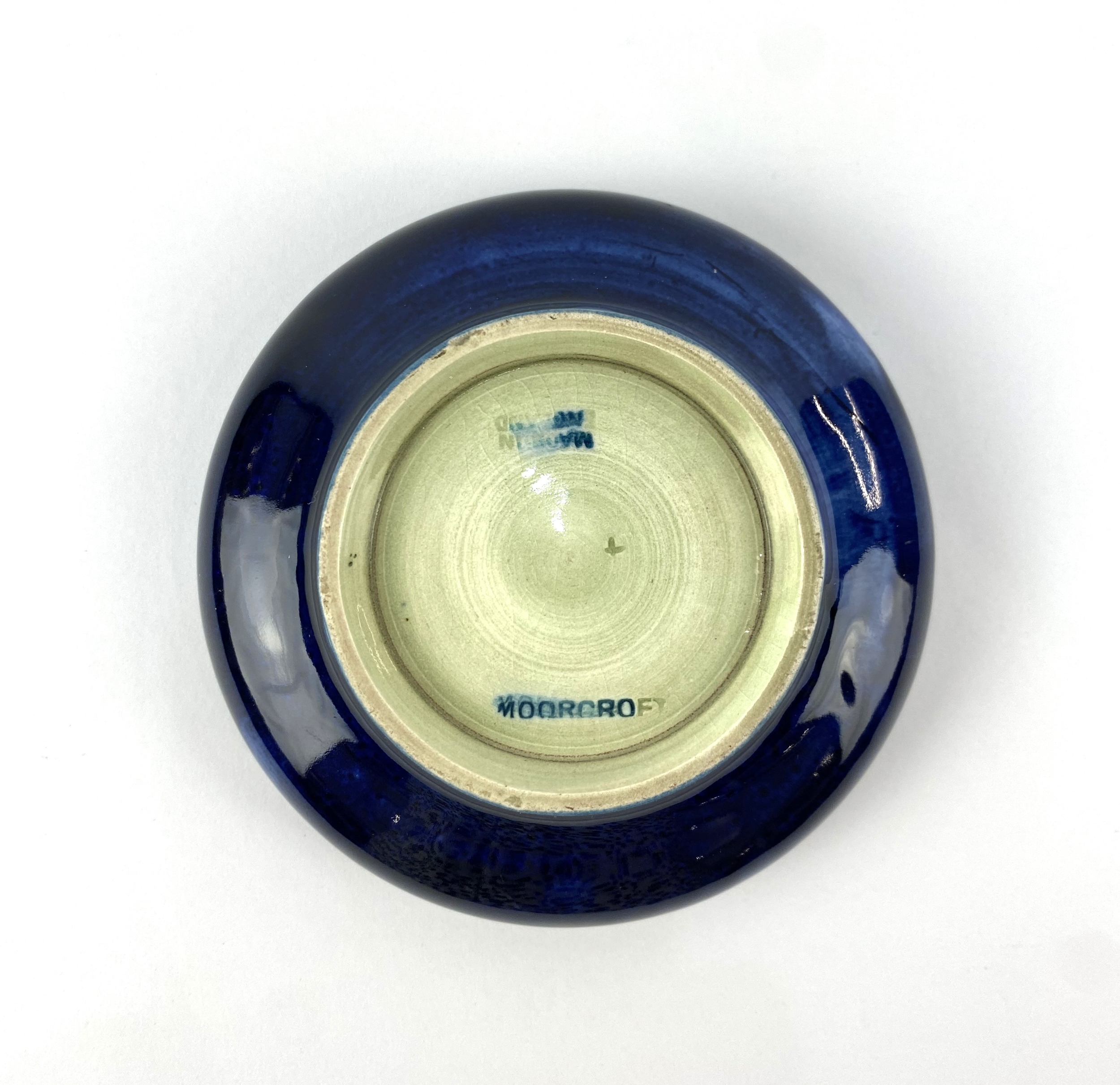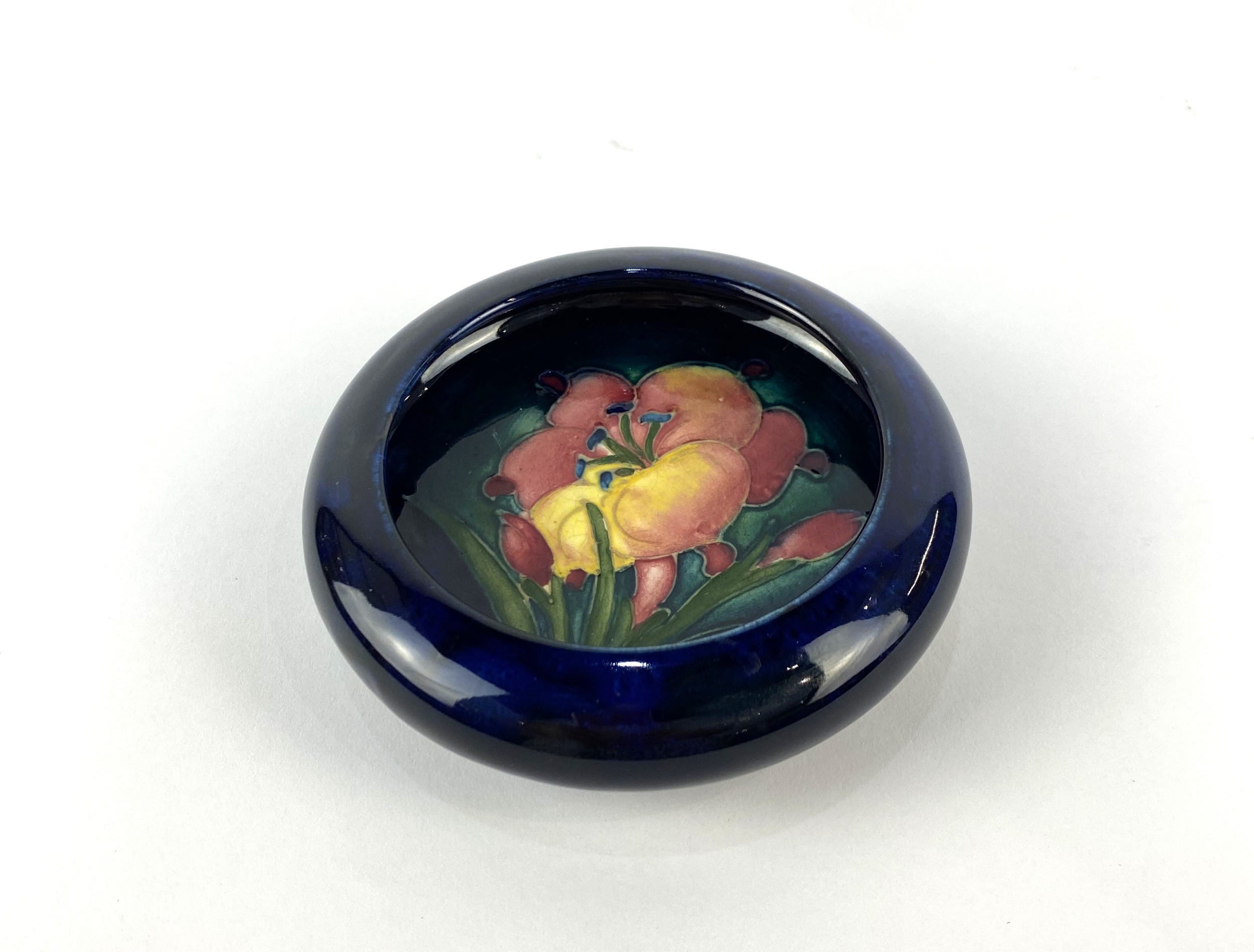 A Moorcroft 'African Lily' patterned dish, decorated against the dark blue ground with tube lined floral motif, impressed marks to base, diameter 11cm