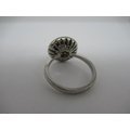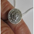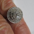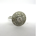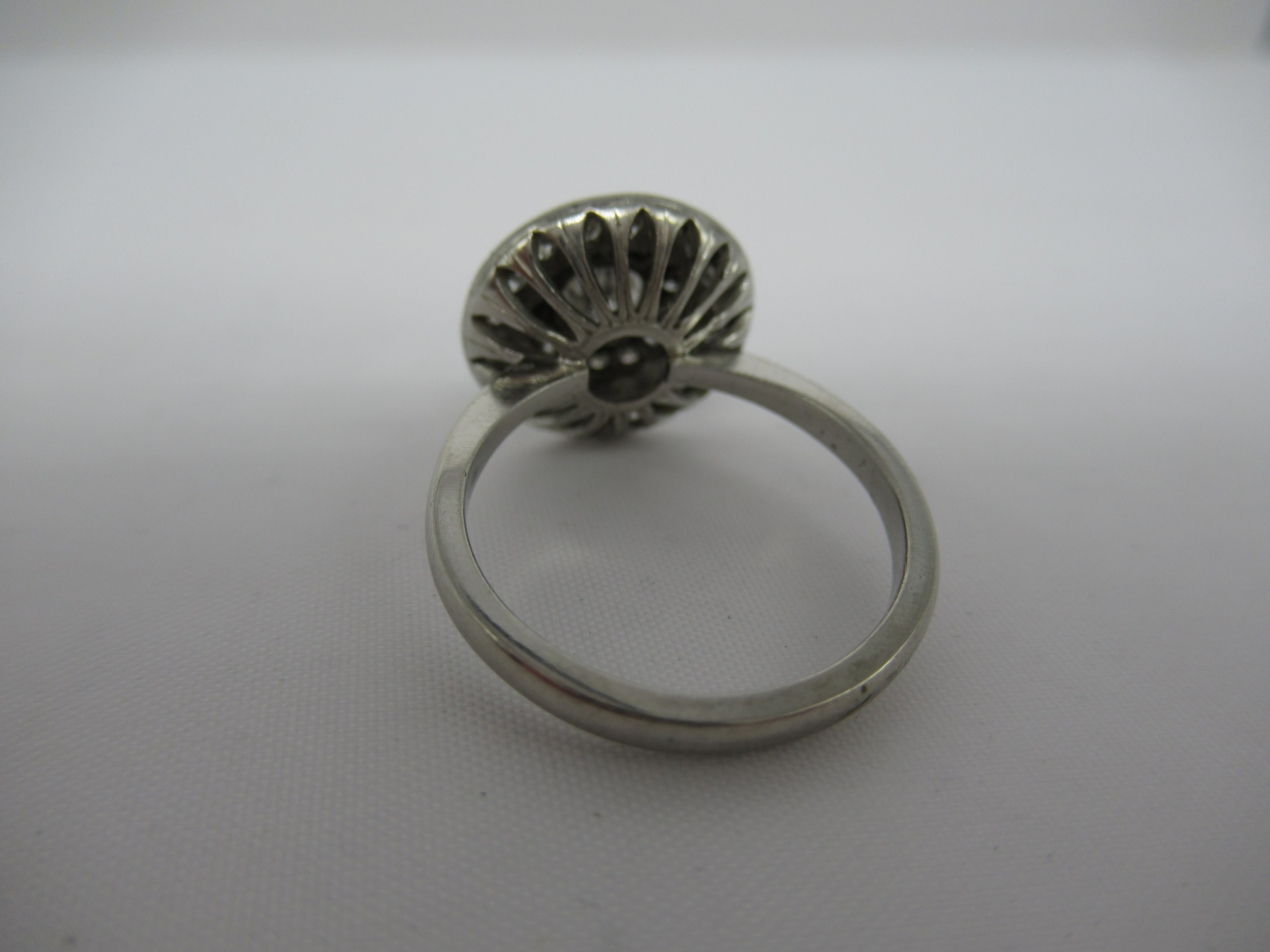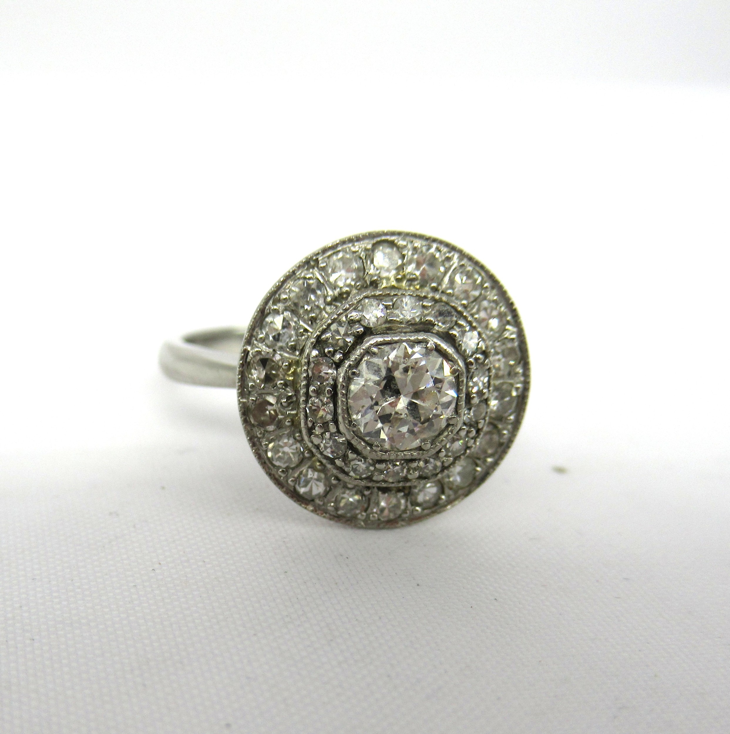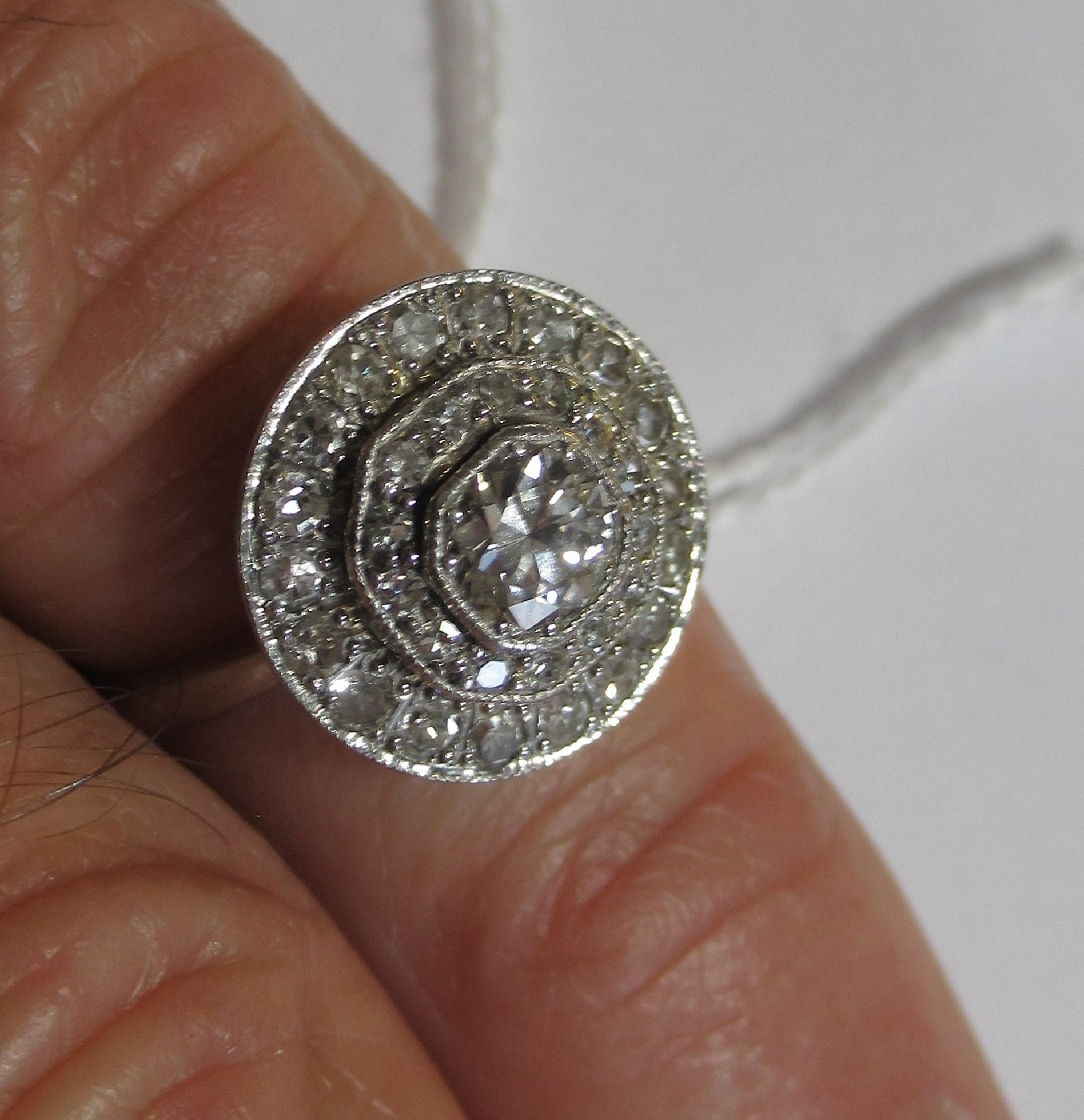 White metal ring of circular pyramid design, the centre old cut diamond surrounded by two bands of old cut diamonds, size L, 5.2g
