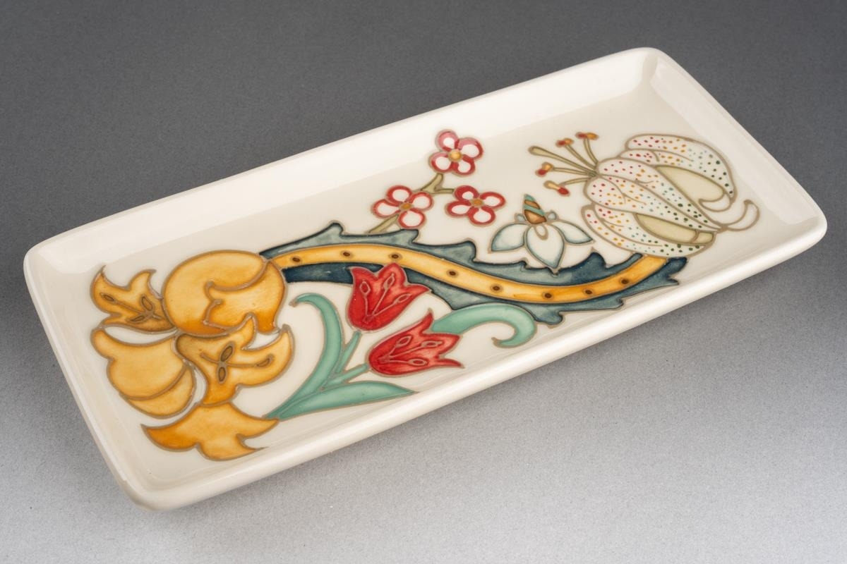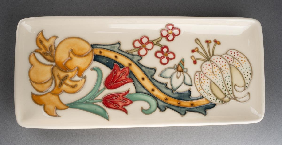 A Moorcroft Golden Lily pen tray, impressed and painted marks, approx 20 x 9cm, boxed [1]