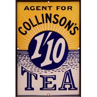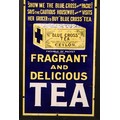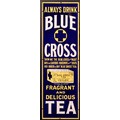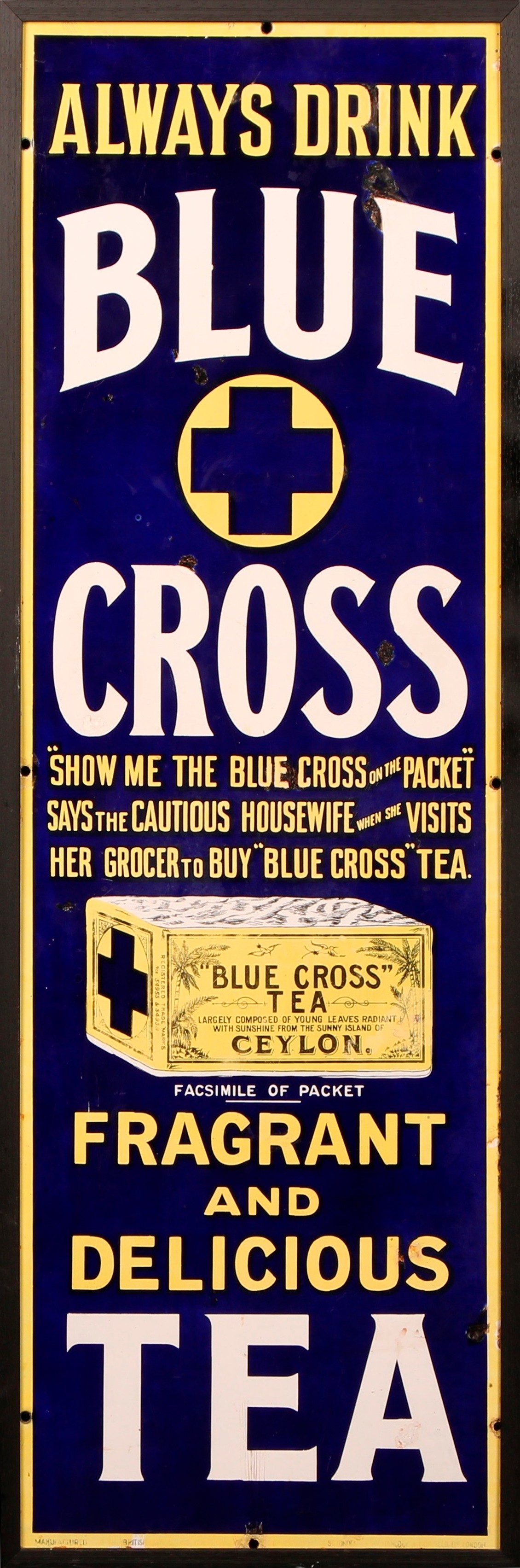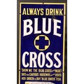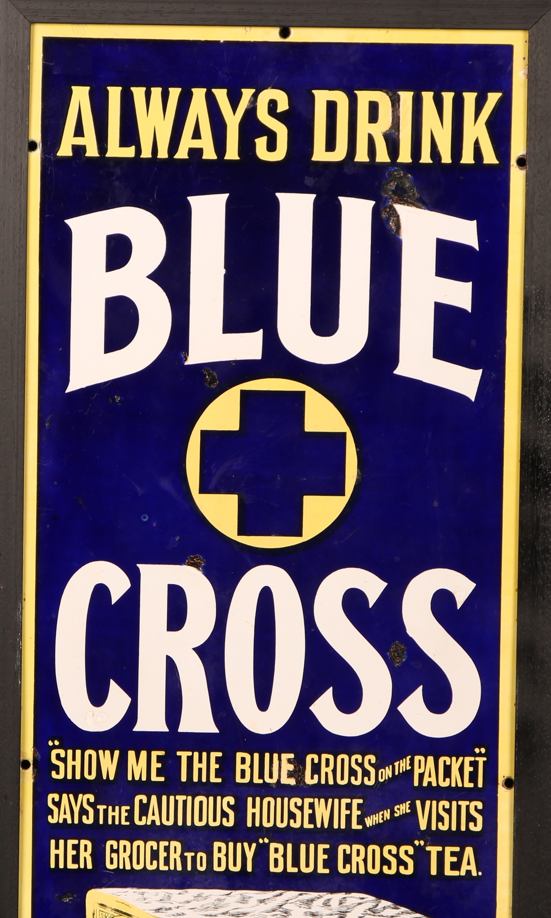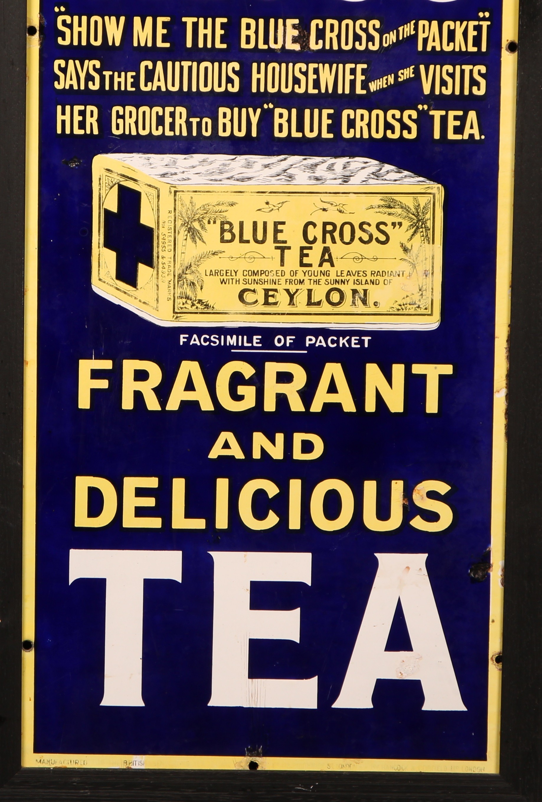 Advertising - an early 20th century rectangular enamel sign, Always Drink Blue Cross, Fragrant and Delicious Tea, illustrated with a labelled packet, in white and yellow on a deep blue ground, 91.5cm x 30.5cm
