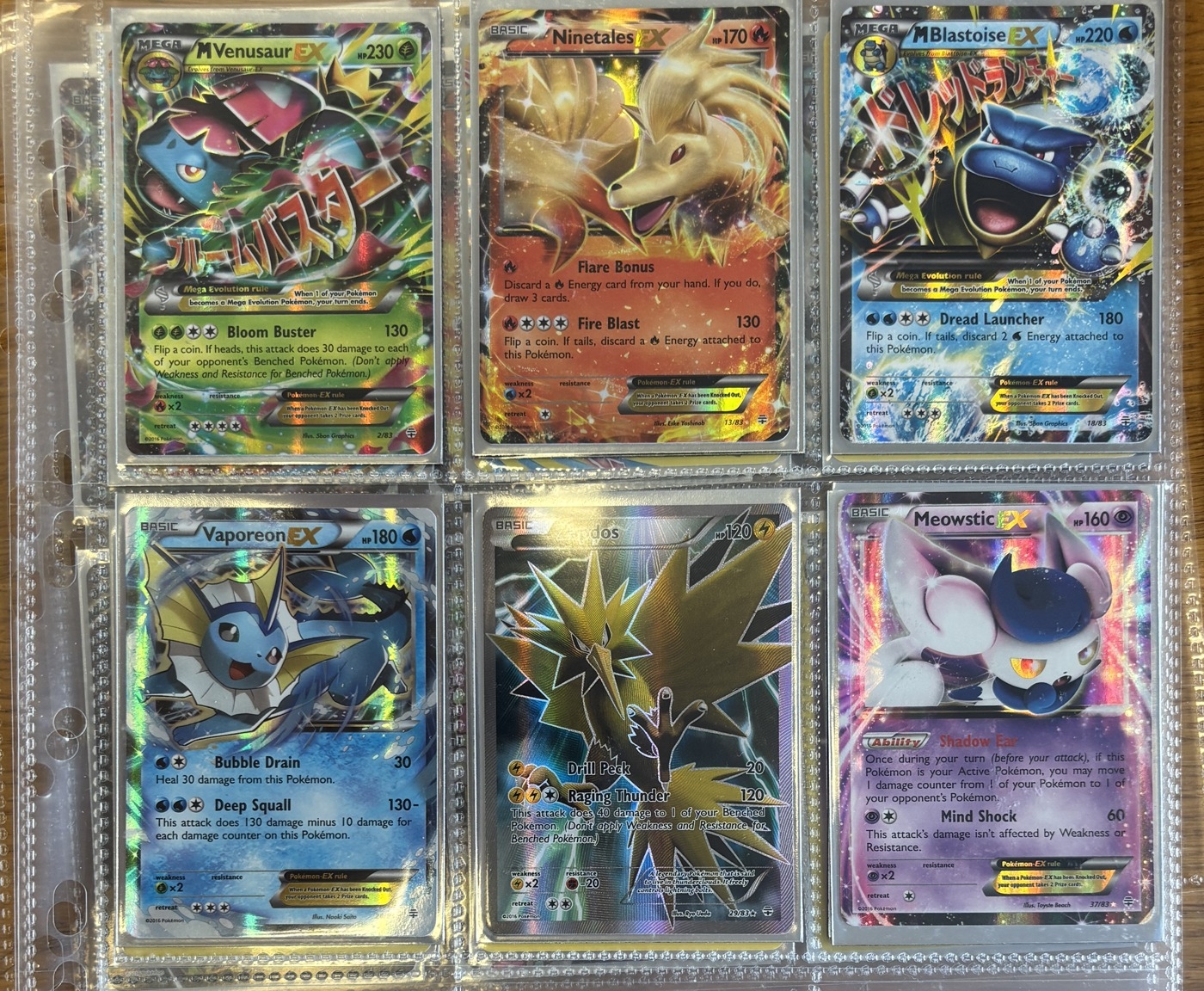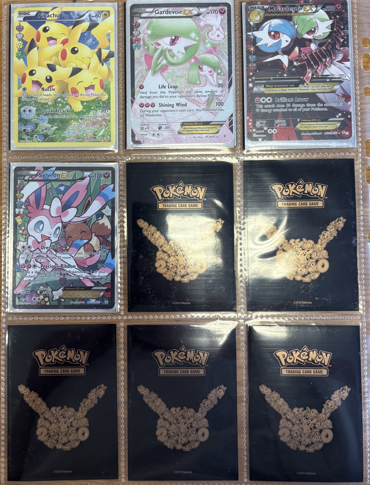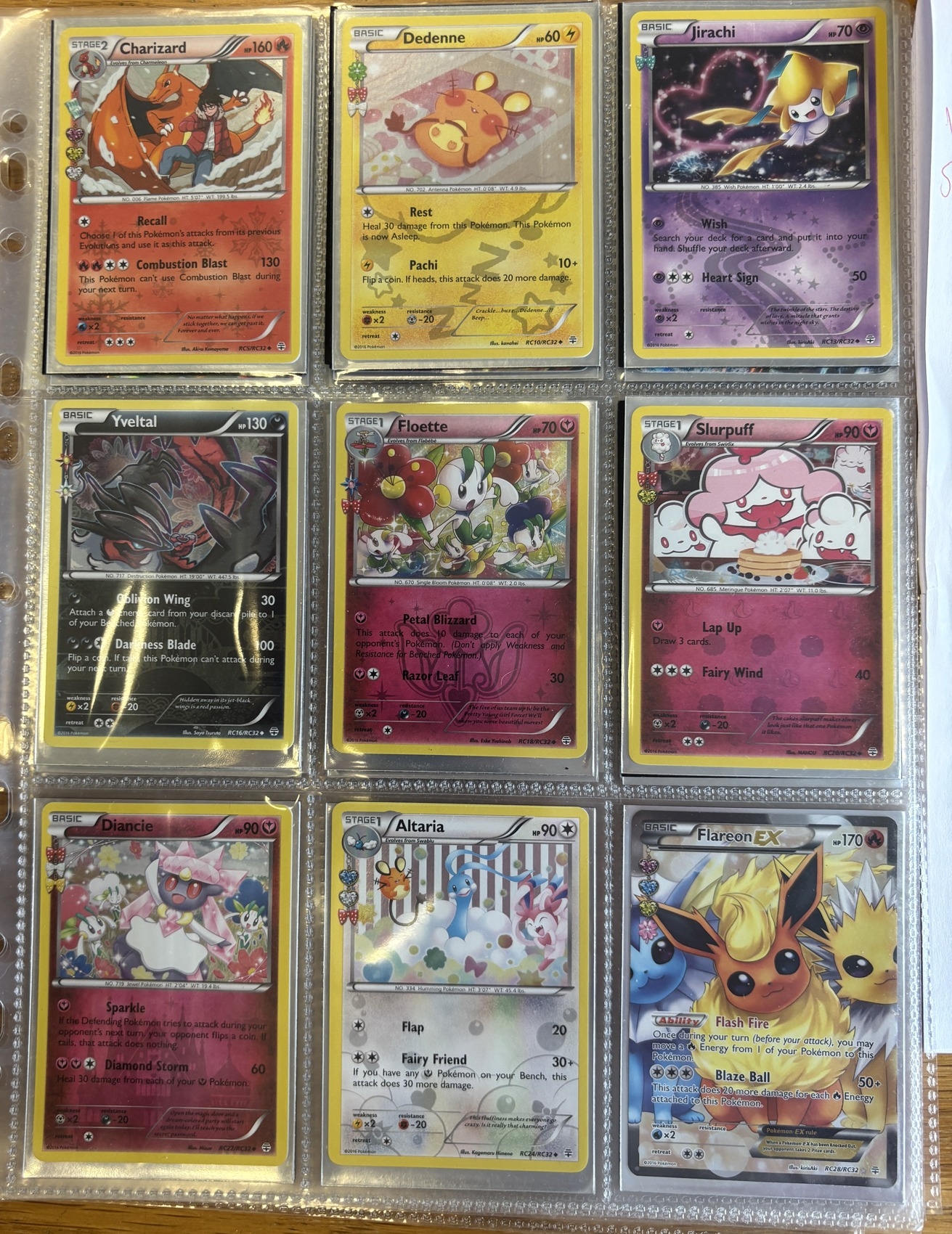 Pokemon. Collection in 3x3 card storage sleeves, generally near mint, including Generations MCharizard EX (13), Generations: Radiant Collection Charizard (RC5), Dedenne (RC10), Jirachi (RC13), Yveltal (RC16), Floette (RC18), Slurpuff (RC20), Diancie (RC22), Altaria (RC24), Flareon EX (RC28), Pikachu (RC29), Gardevoir EX (RC30), MGardevoir EX (RC31), Sylveon EX (RC32), XY Black Star Promos Charizard EX (XY121), Blastoise EX (XY122), Venusaur EX (XY123) and Shaymin EX (XY148). Plus further secret and ultra rare cards from Evolutions, Generations and XY Ancient Origins. Qty 32. (R)