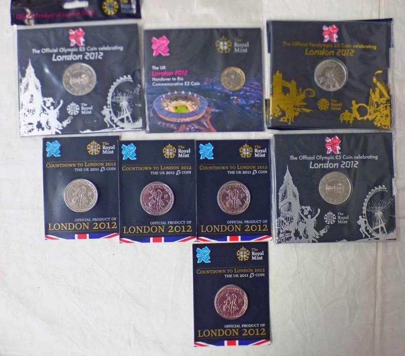 SELECTION OF 2012 OLYMPIC RELATED COINS TO INCLUDE 2012 HAND OVER TO RIO £2, IN SEALED PACKET, TWO OFFICIAL OLYMPIC £5 COINS, BOTH IN SEALED PACKETS, OFFICIAL PARALYMPIC £5 COIN, IN SEALED PACKET AND FOUR 2011 COUNTDOWN TO LONDON 2012 £5 COINS, ALL IN CARD HOLDERS