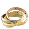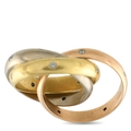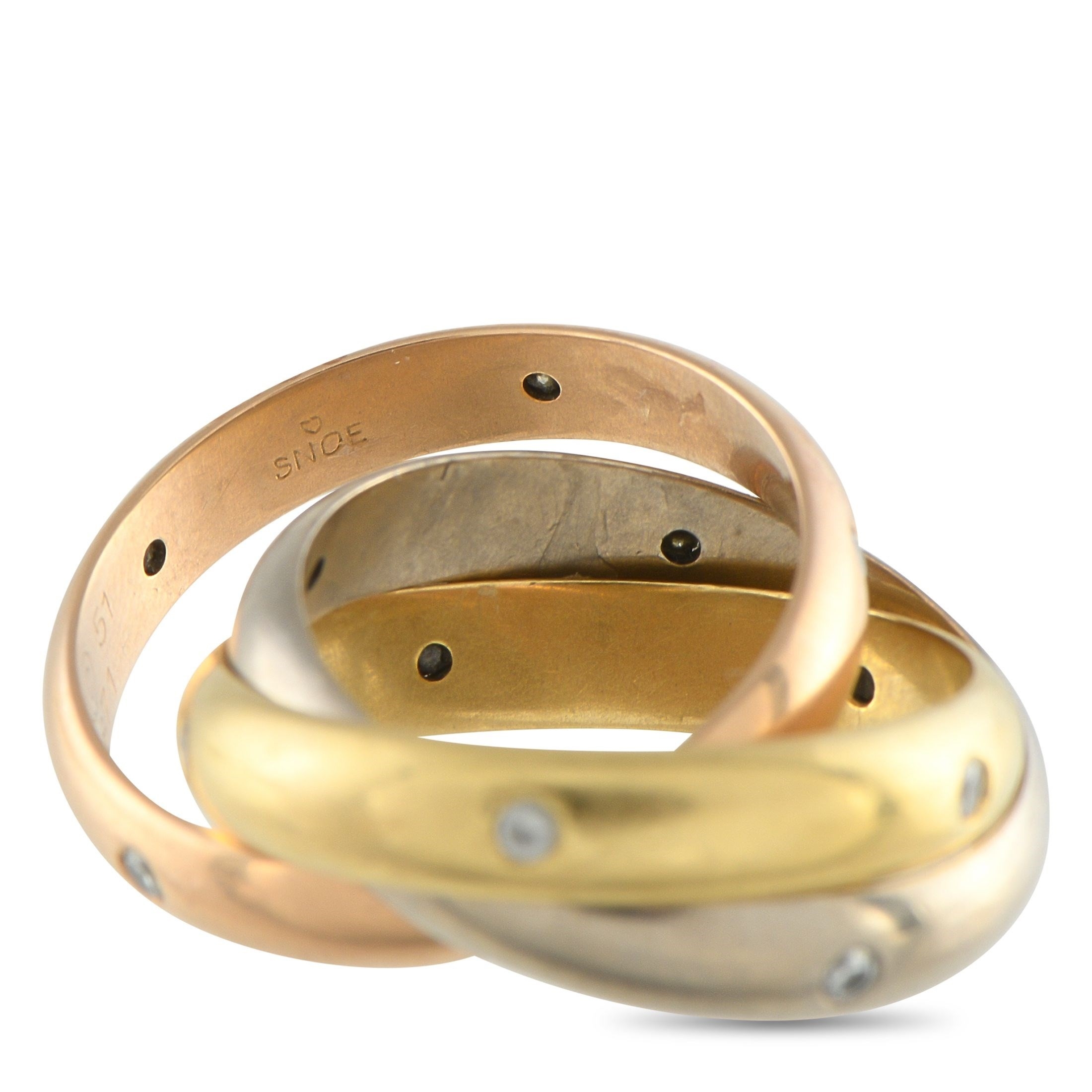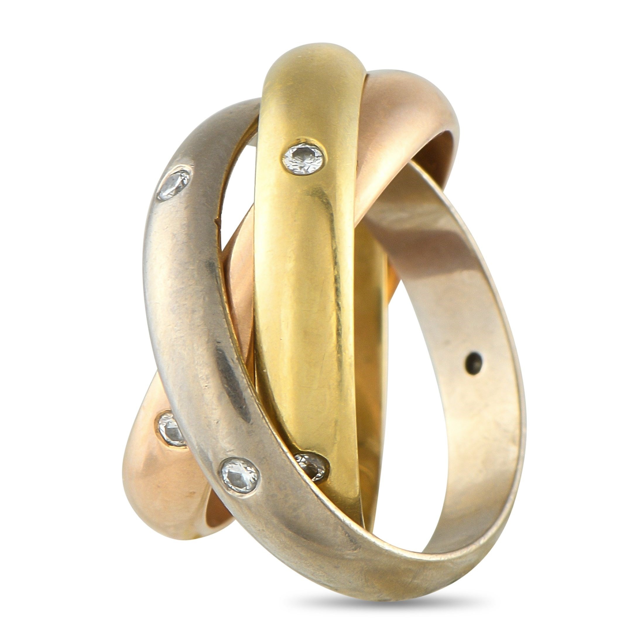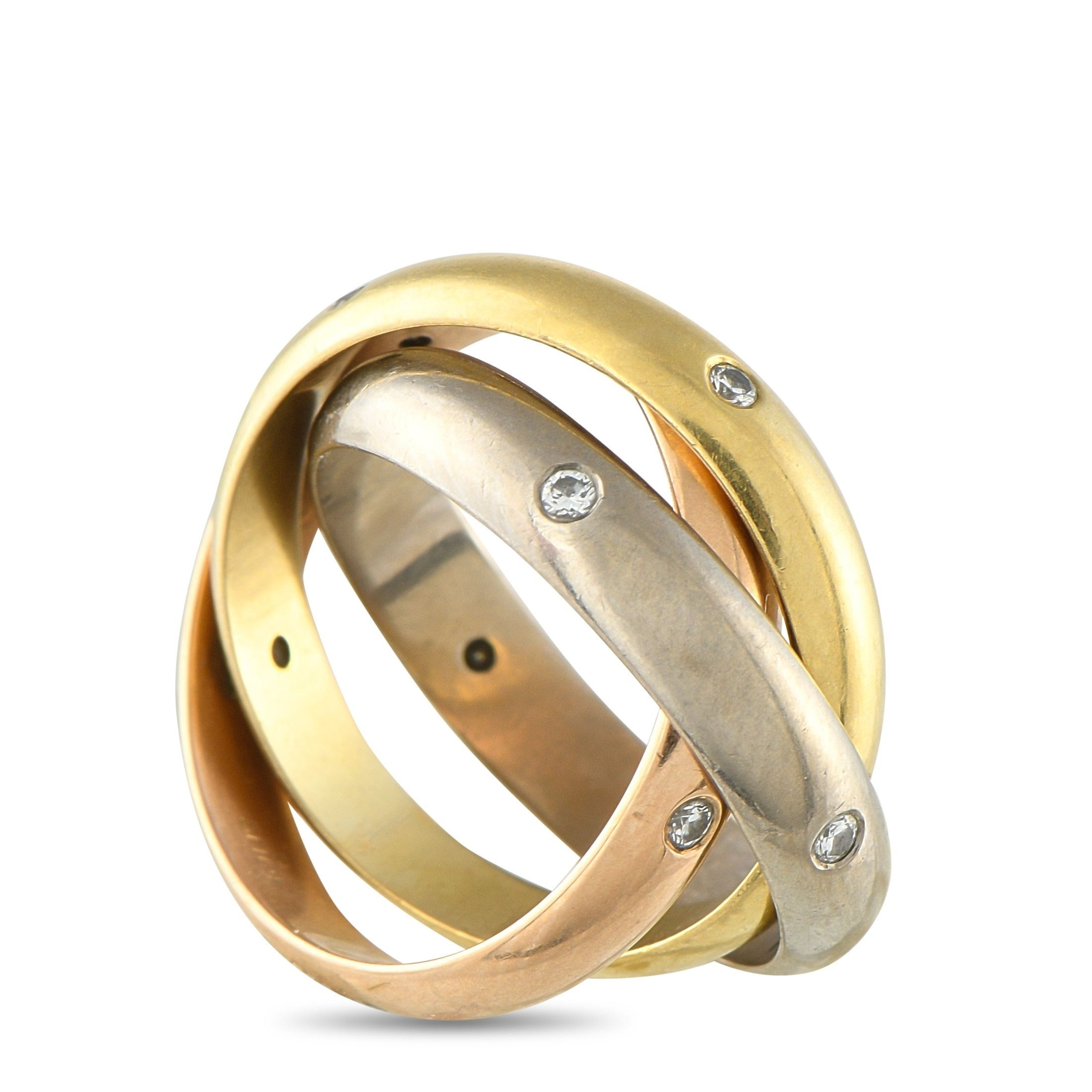 A Cartier Trinity 18K Rose, Yellow and White Gold Diamond Rolling Band Ring. Three bands in yellow, rose, and white gold interlock in the classic Trinity form. Each band is adorned with evenly spaced, flush-set diamonds. In very good condition, presented in a gift box. Ring size: K 1/2.Total weight: 10.9 grams.*This item is held at Cadmore USA Office in Pennsylvania, USA and will be shipped from there. Buyers will be responsible for direct shipping payments.*