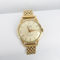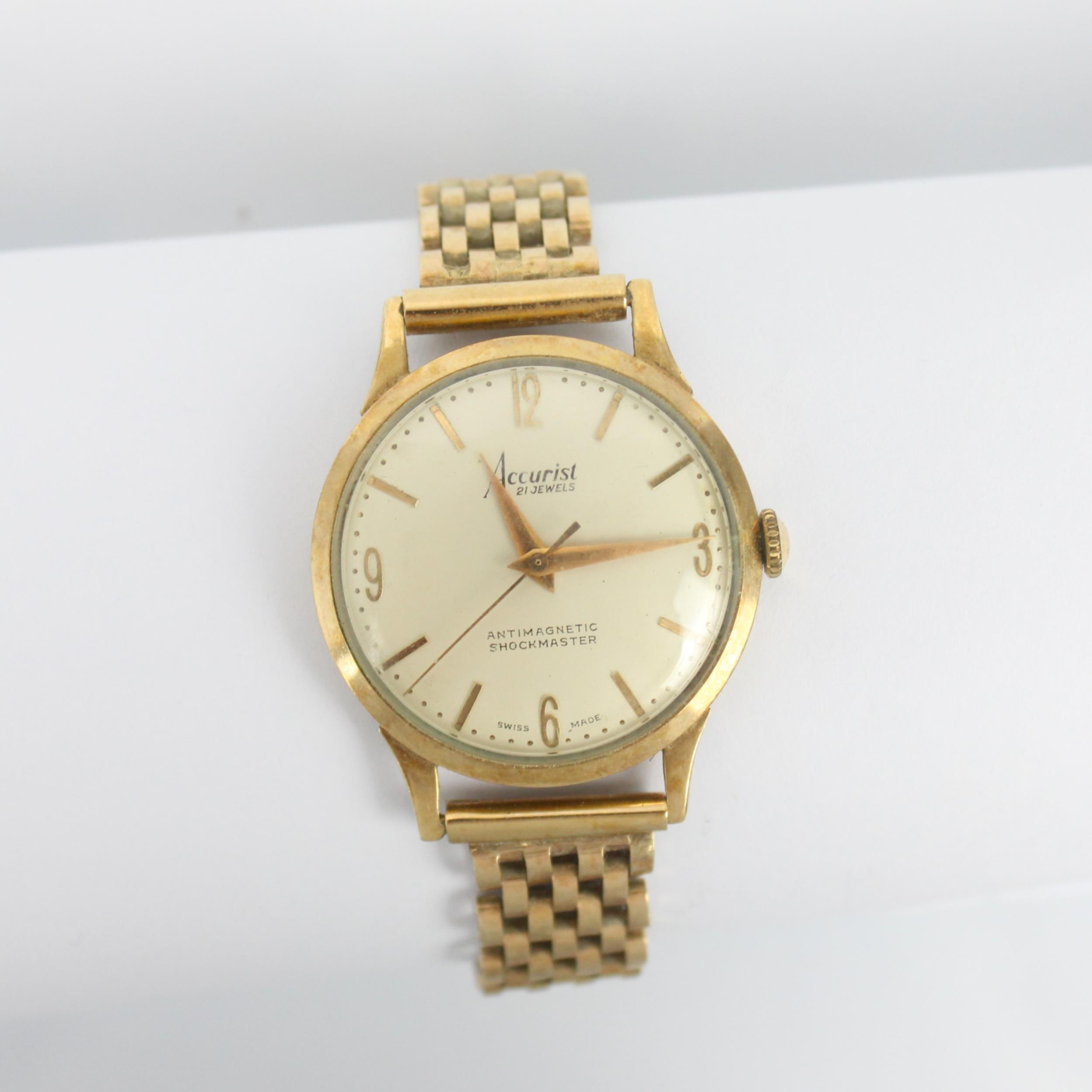 A mid 20th century 9ct gold Accurist antimagnetic shock master wristwatch, the circular white dial with baton markers and Arabic numerals, set to a plain polished case stamped to interior with hallmarks, 3.4cm wide (including crown) upon a 9ct gold brick link bracelet with stamped ladder snap clasp, approx 16.5cm long, gross weight 38gms (including movement)