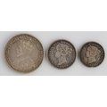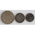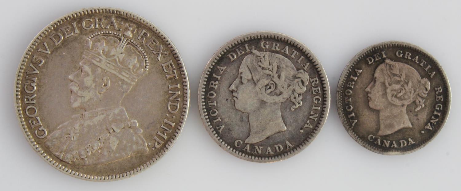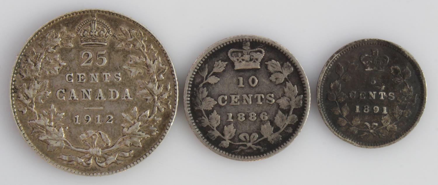 Canada (3) silver minors: 5 Cents 1891 toned GF edge knock, 10 Cents 1886 large 'knobbed 6' Fine, and 25 Cents 1912 VF
