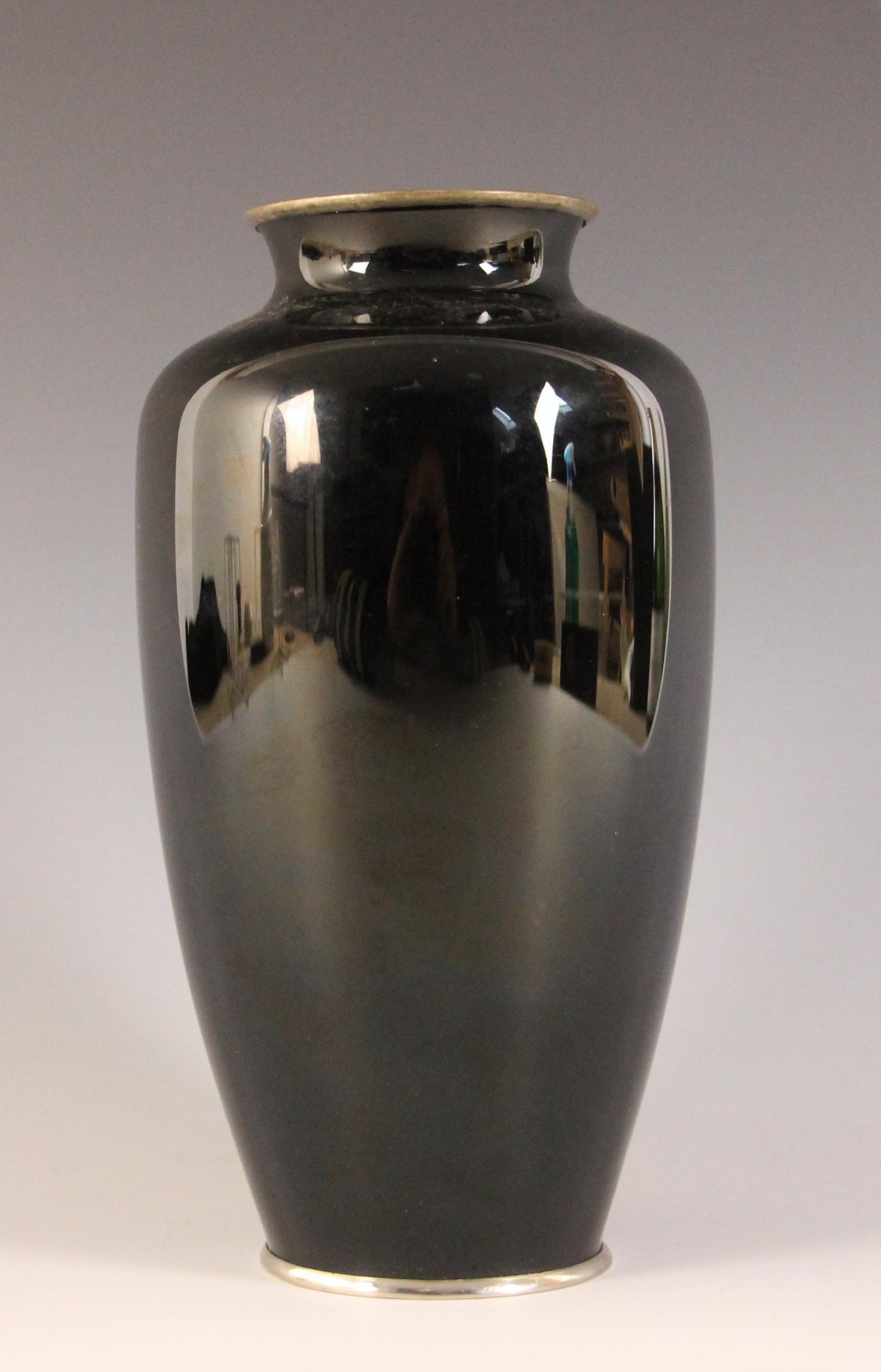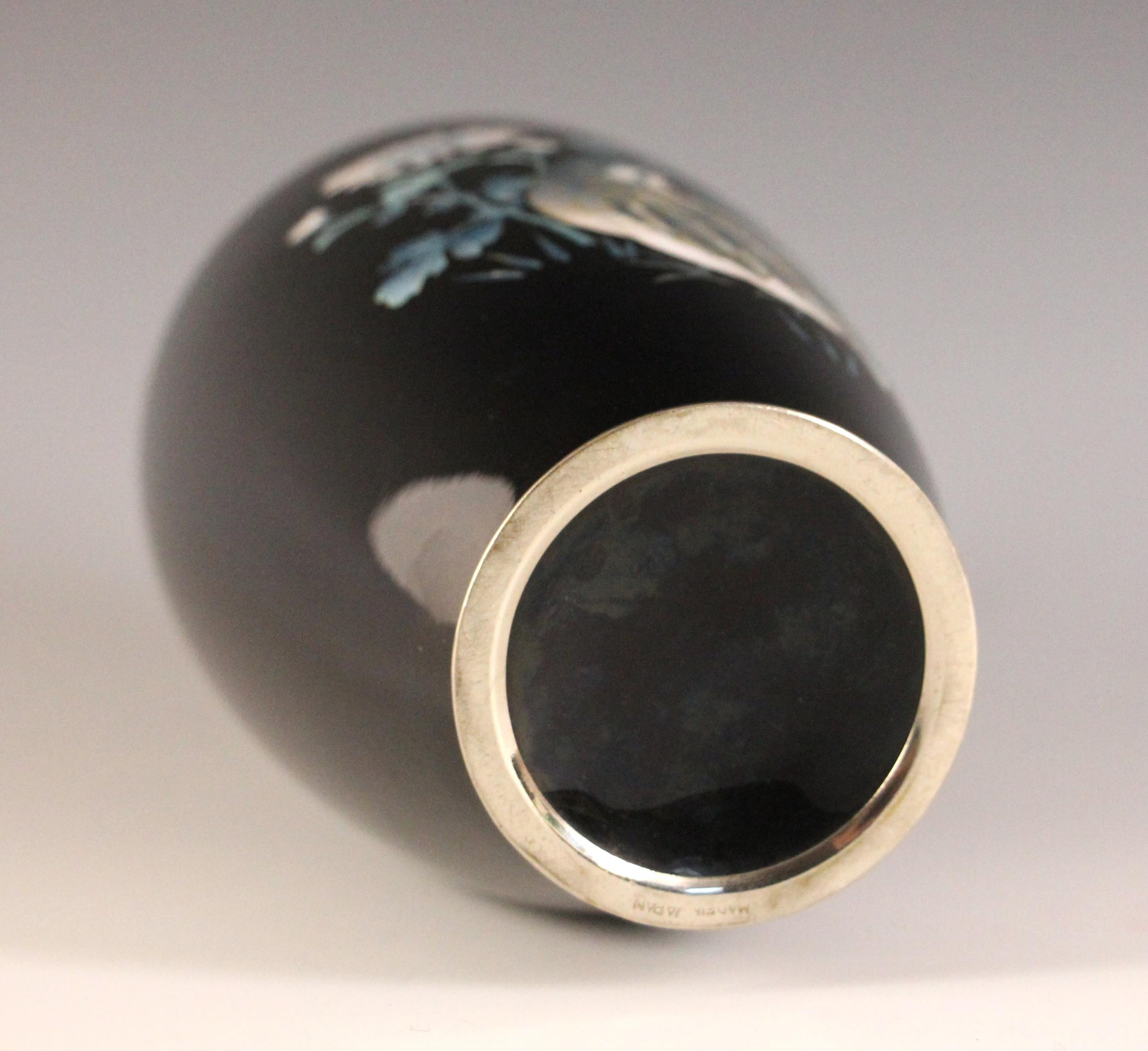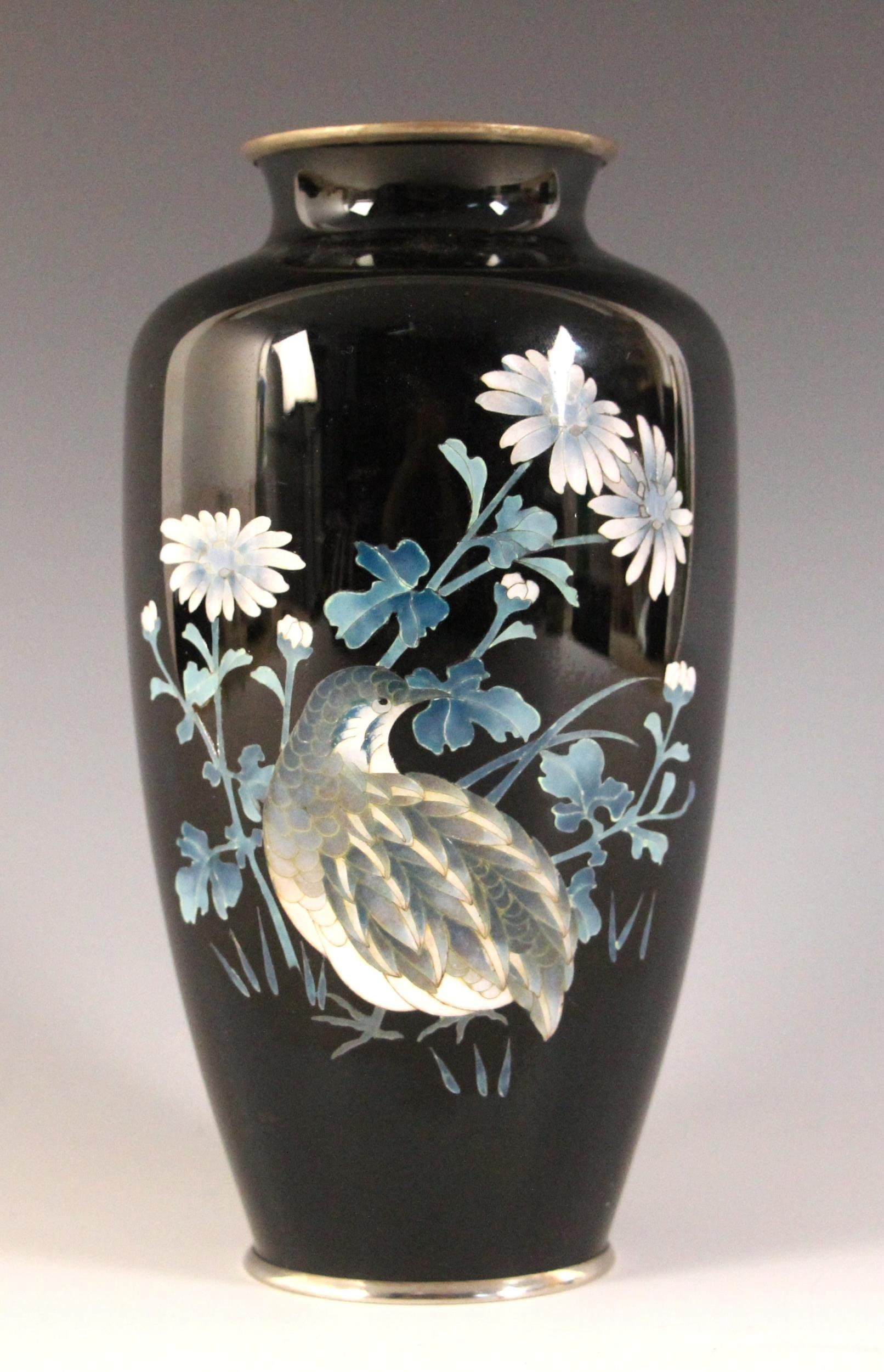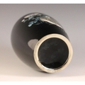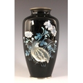 A Japanese cloisonne vase in the manner of Shobido, Osaka, 20th century, the high shouldered vase decorated with a quail against a black ground, 18cm high