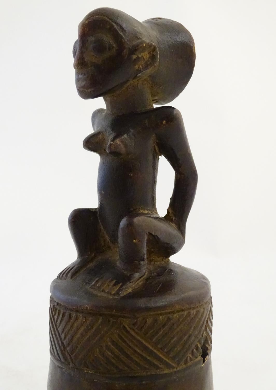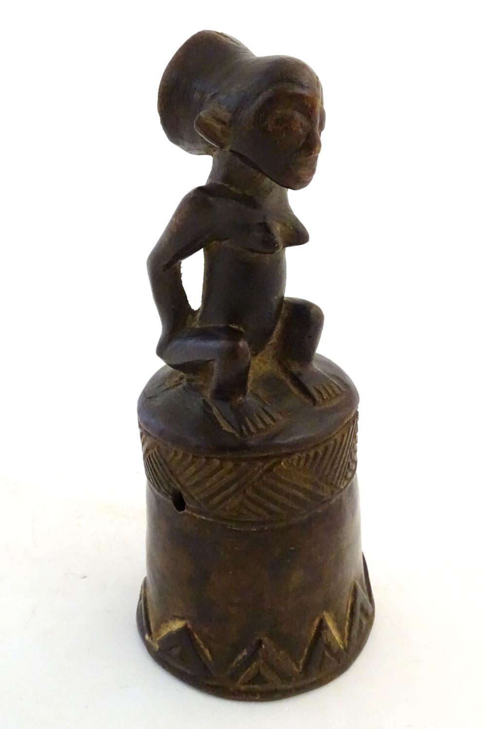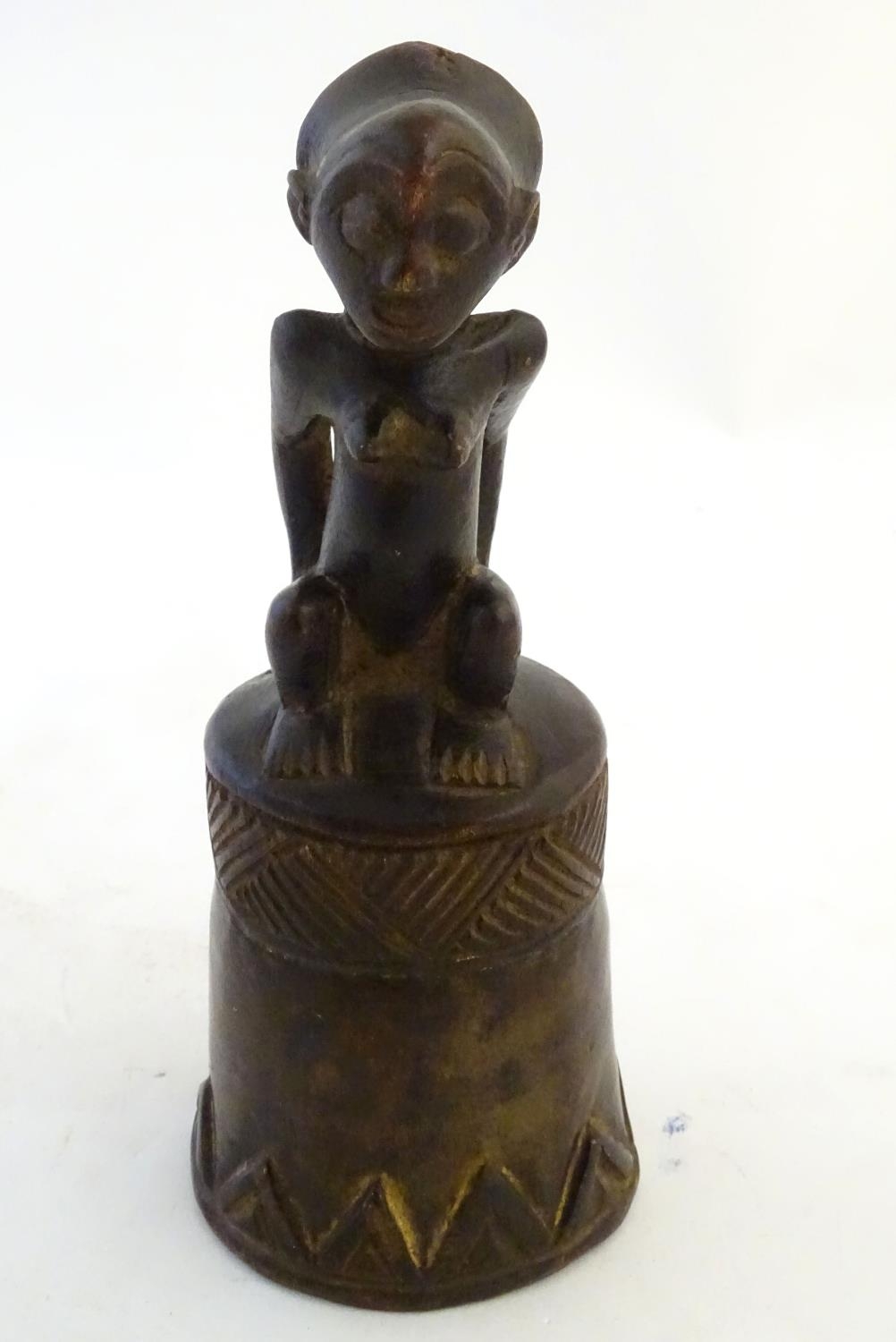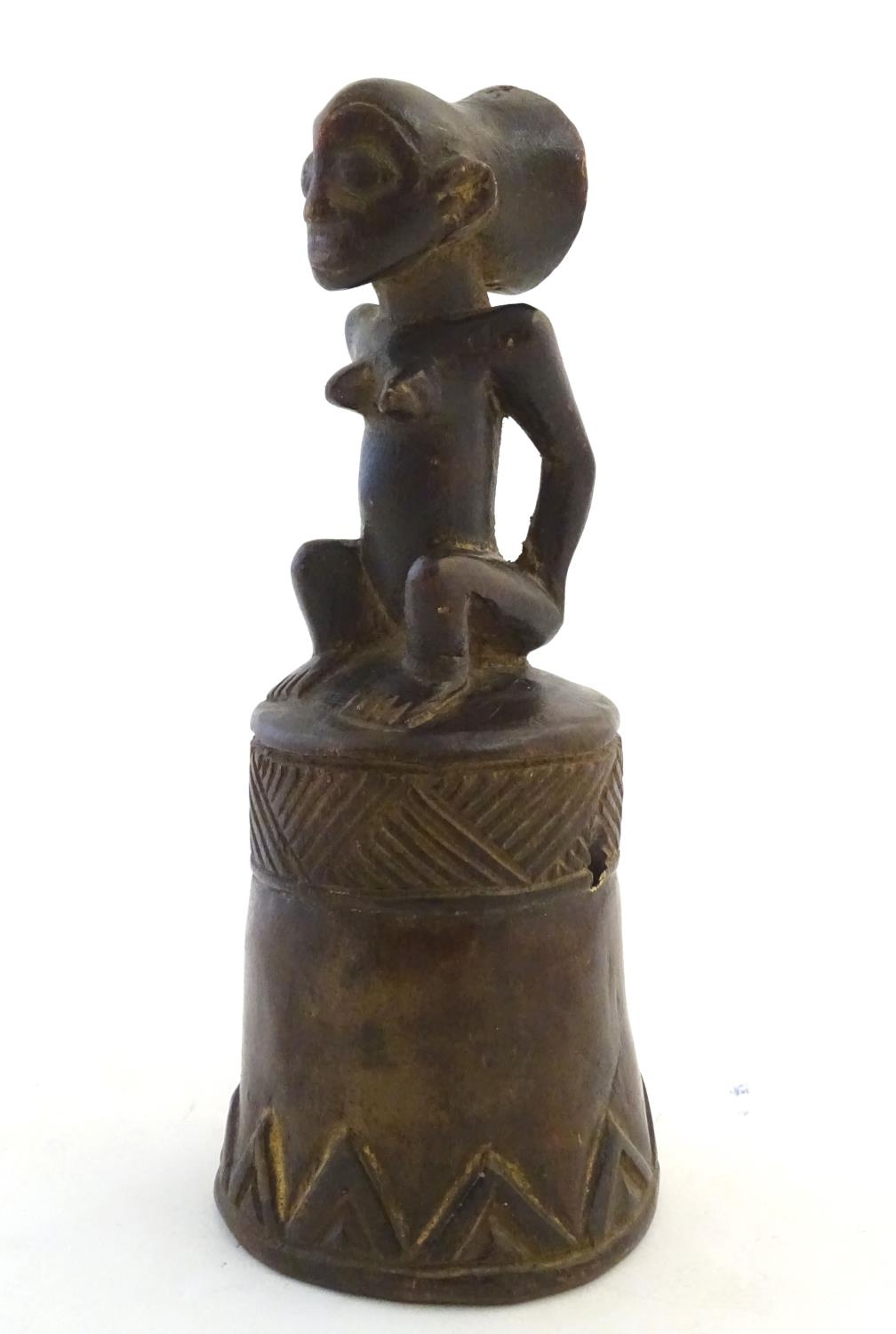 Ethnographic / Native / Tribal: A carved African wooden bell / vessel with geometric detail surmounted by a seated woman. Possibly a Congolese instrument. Approx. 10"