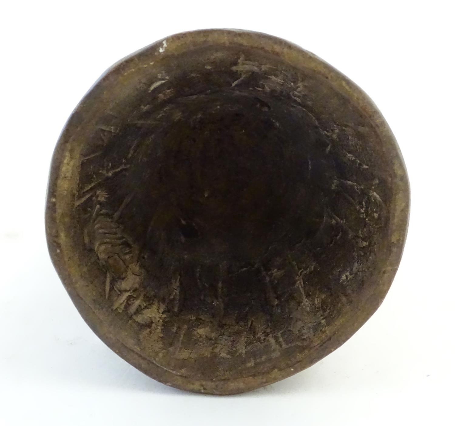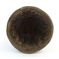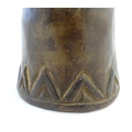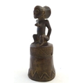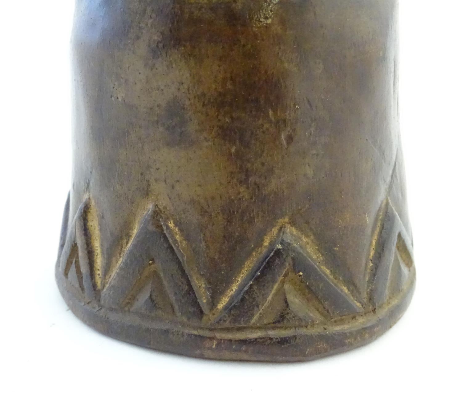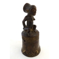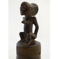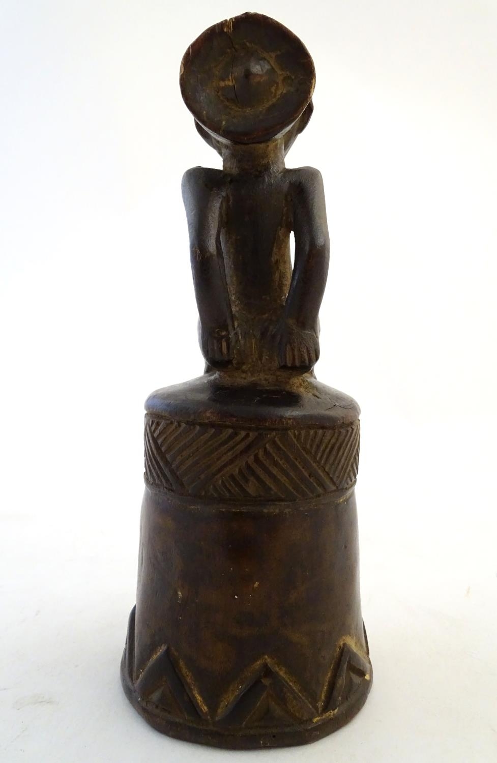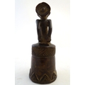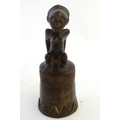 Ethnographic / Native / Tribal: A carved African wooden bell / vessel with geometric detail surmounted by a seated woman. Possibly a Congolese instrument. Approx. 10"