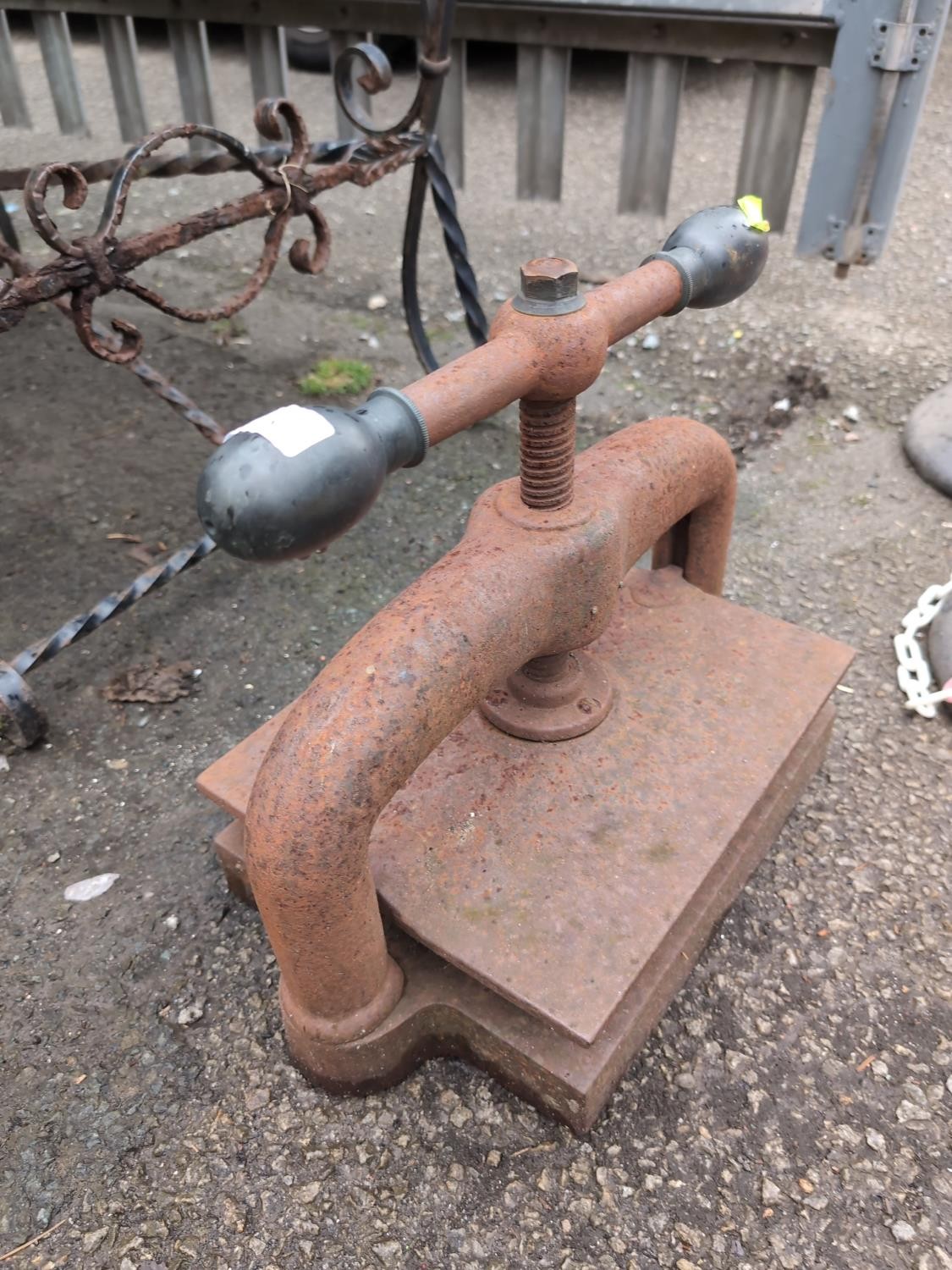 Cast iron book press. Seized/rusted. W40cm D25cm H35cm.