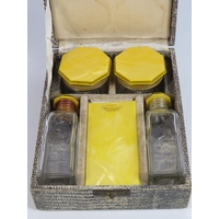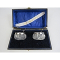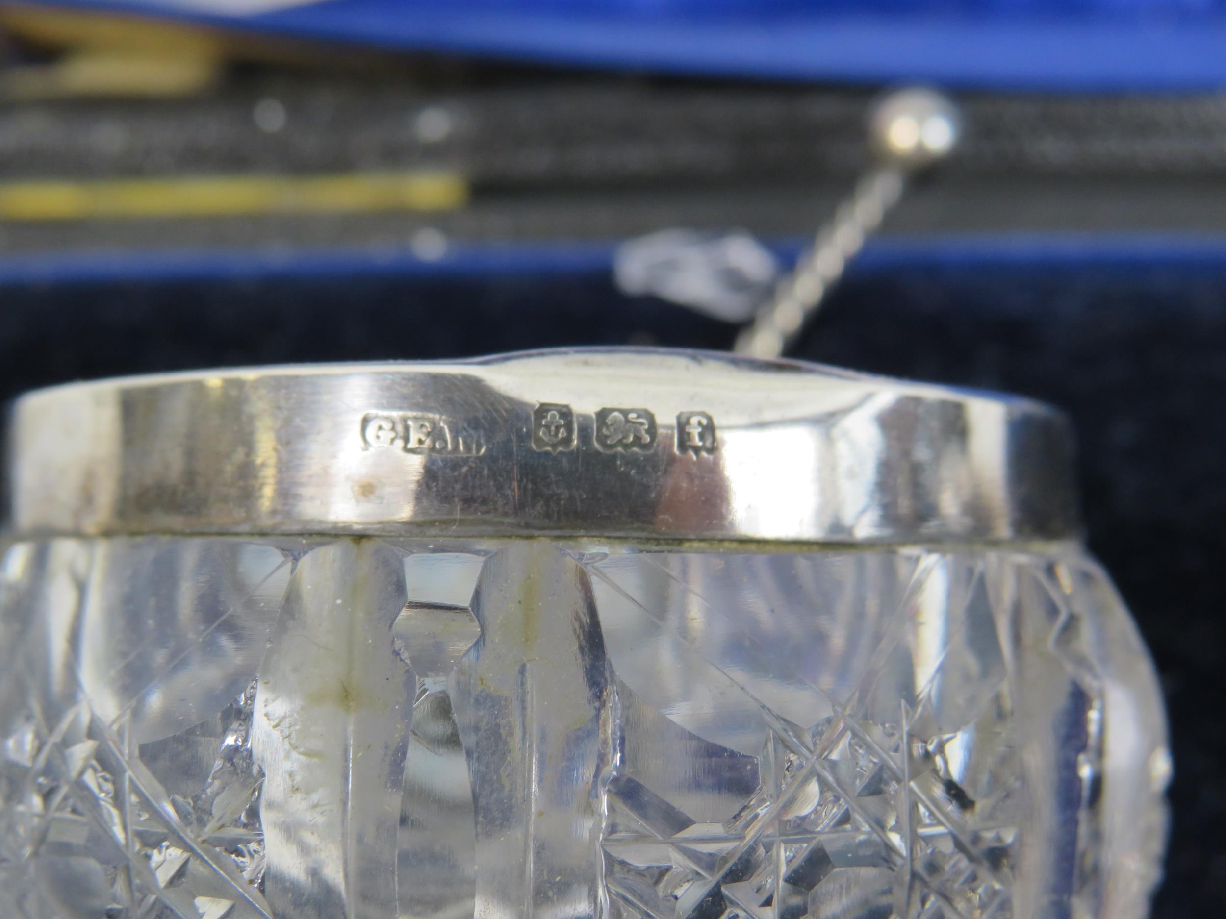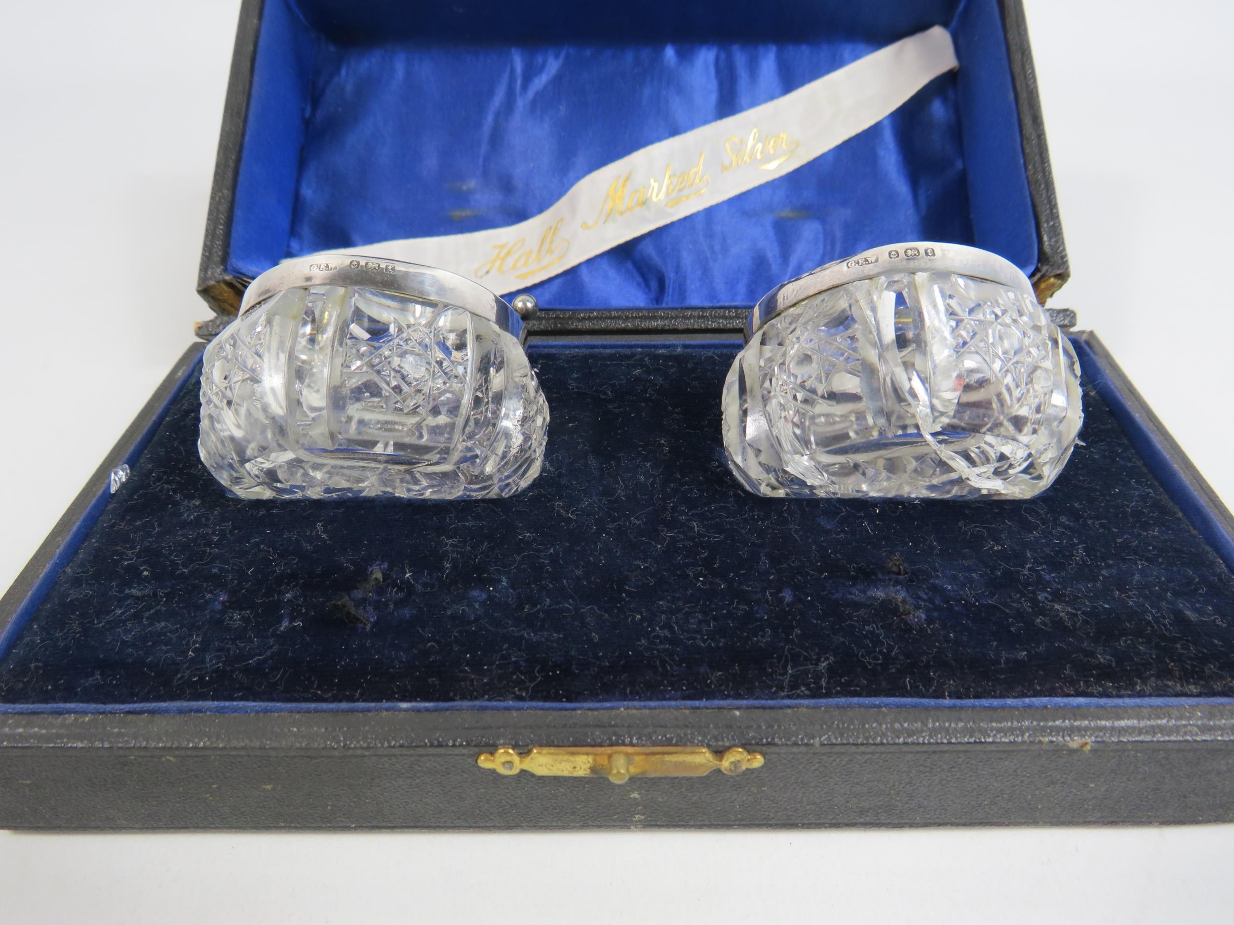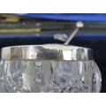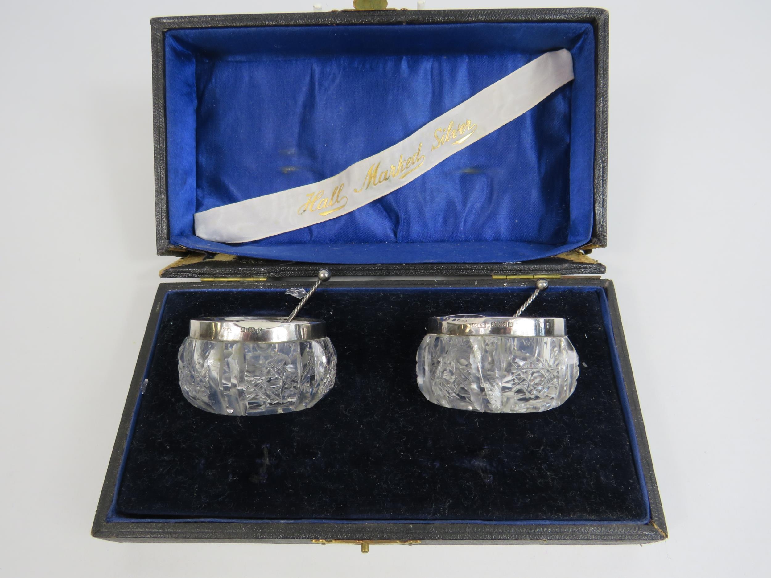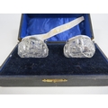 Pair of G E Walton birmingham 1905 silver rimmed glass salts and spoons. One is cracked.