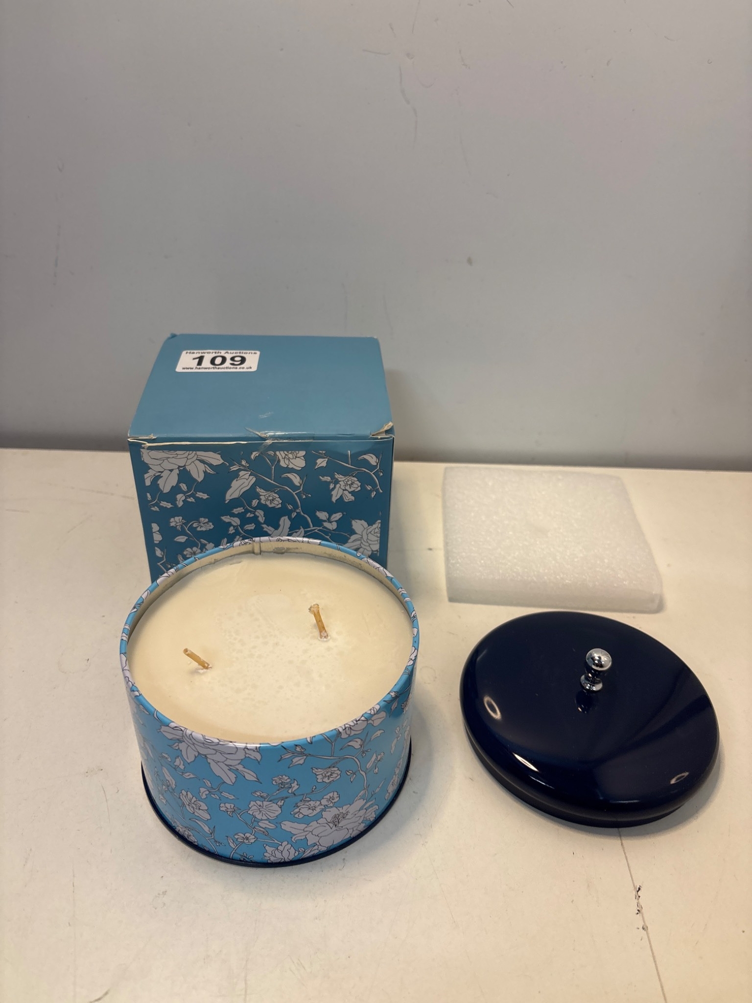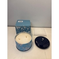 Two-wick candle in decorative blue tin, includes original box.