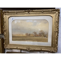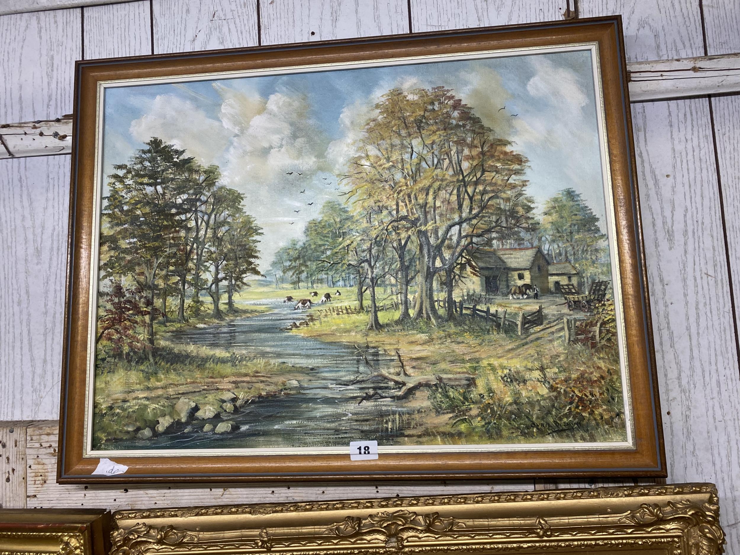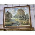 Oil on canvas homestead by a stream sign