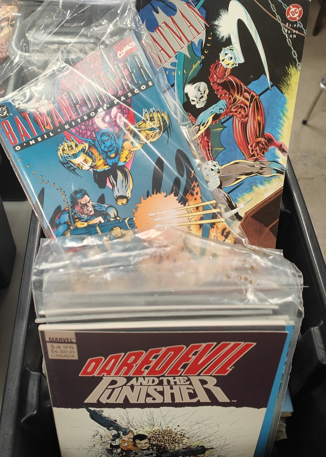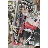 Marvel comics, Dare Devil and The Punisher, Child's play by Frank Miller, a collection of Punisher and DC Batman comics.