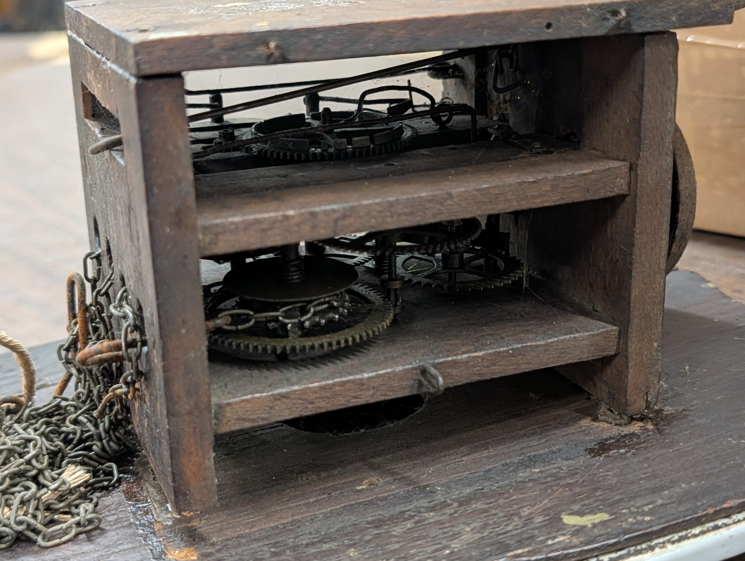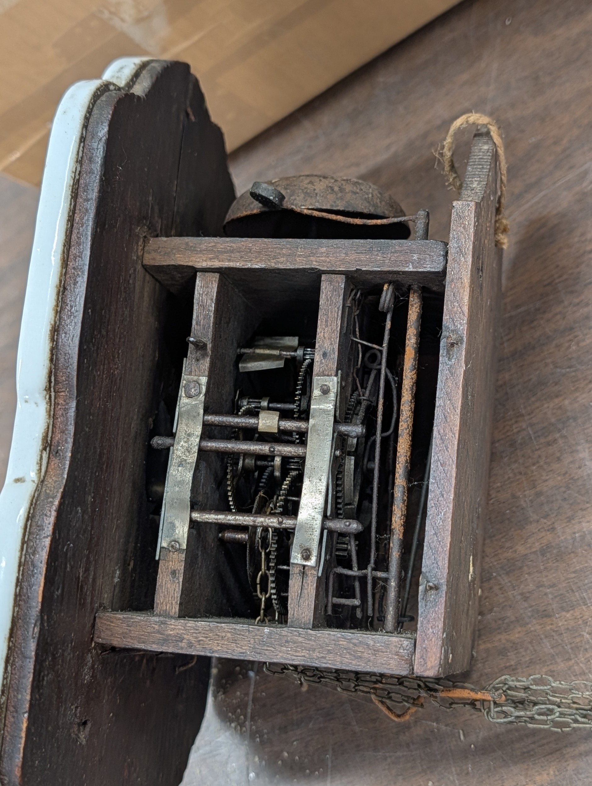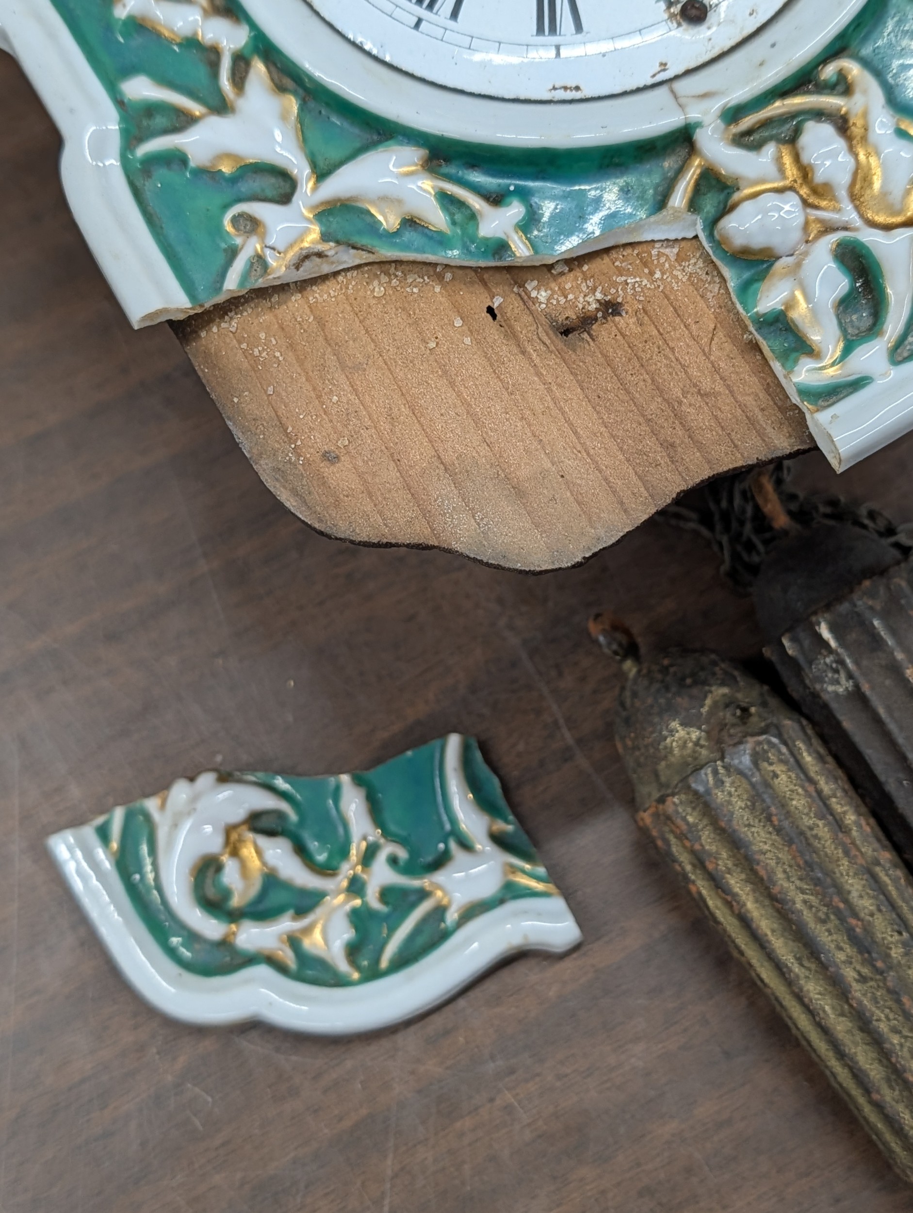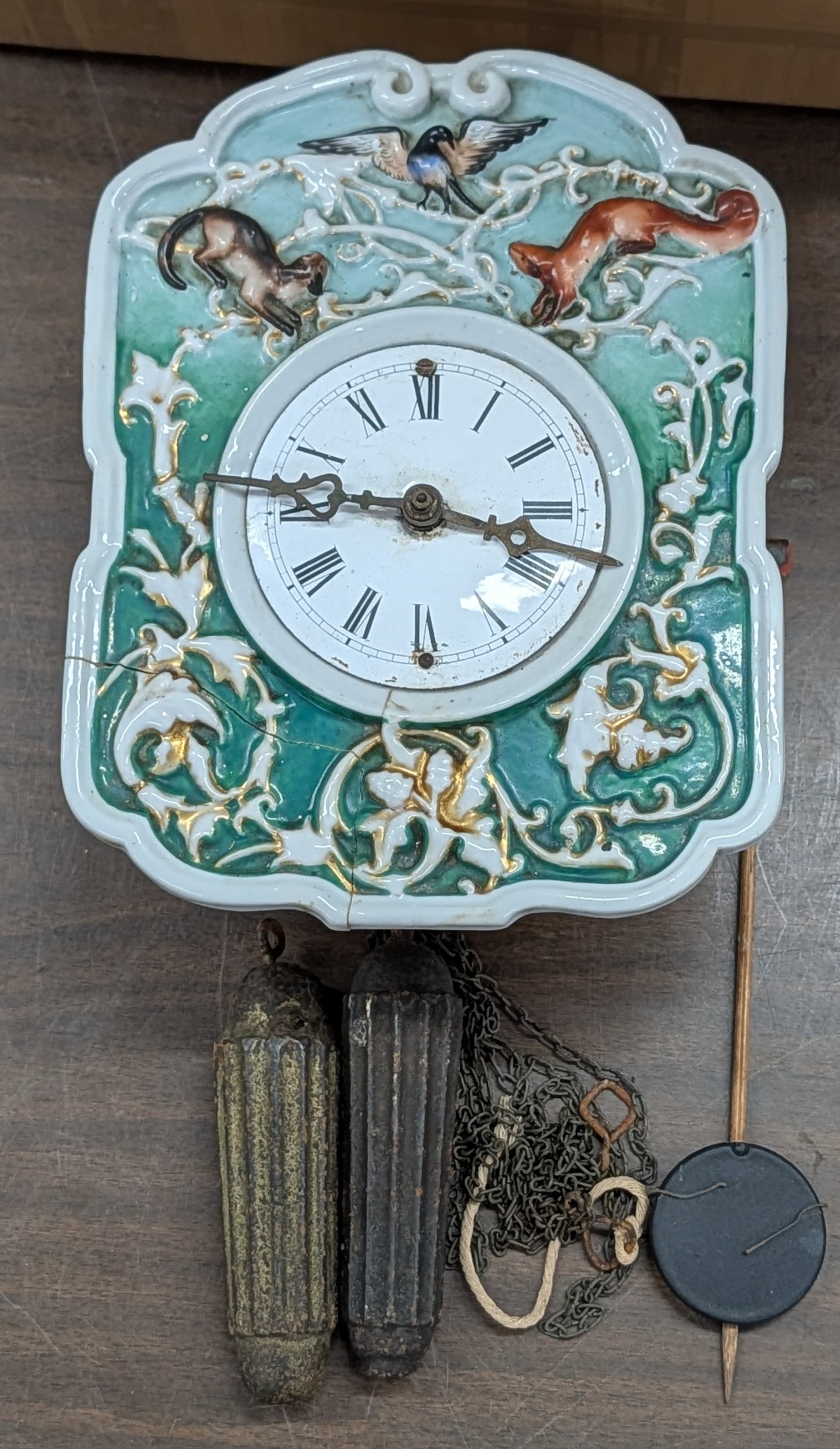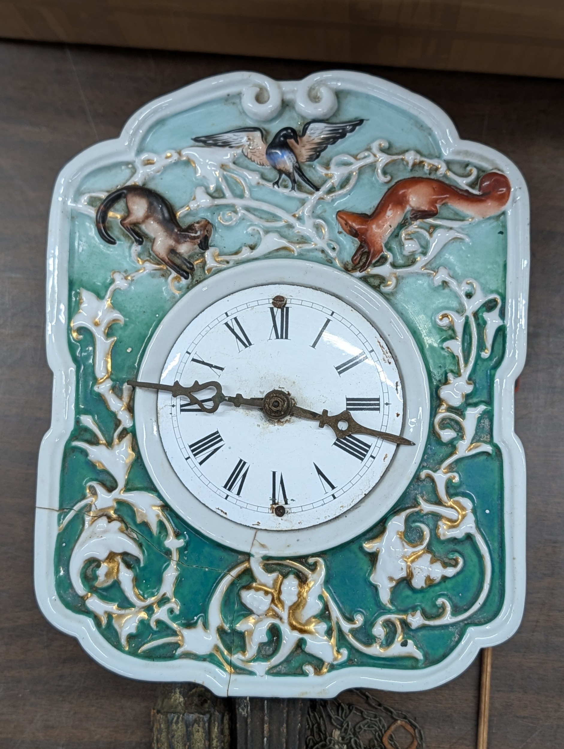 19th Century German Black Forest Ceramic Shield Wall Clock, Corner section broken off but present and offered for restoration