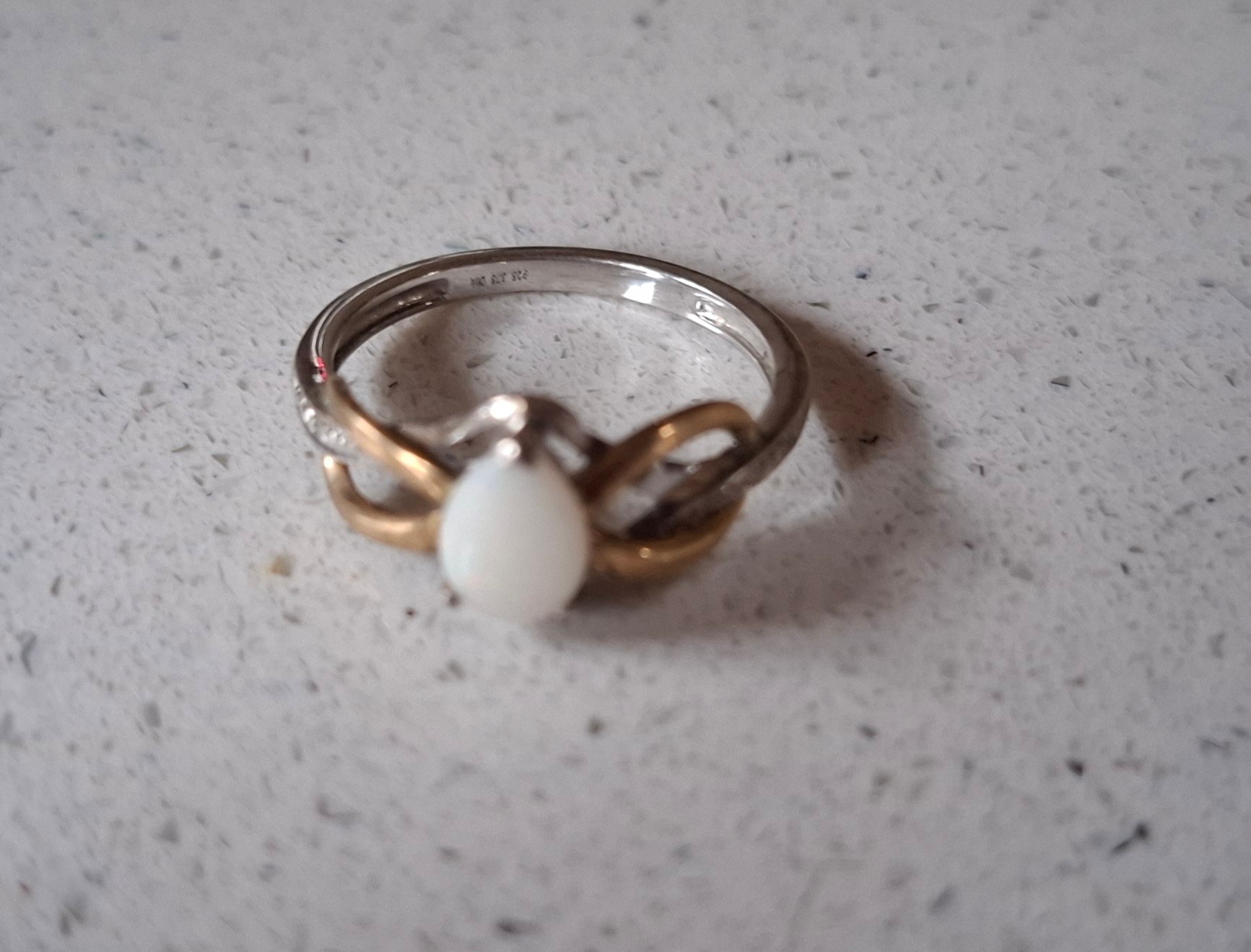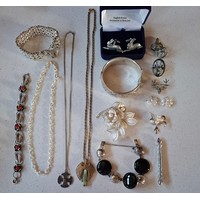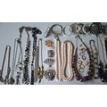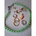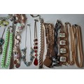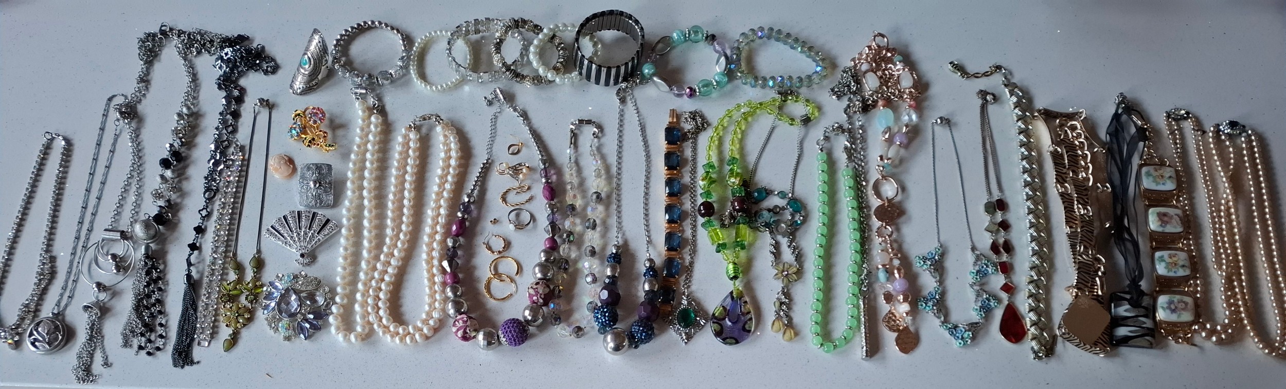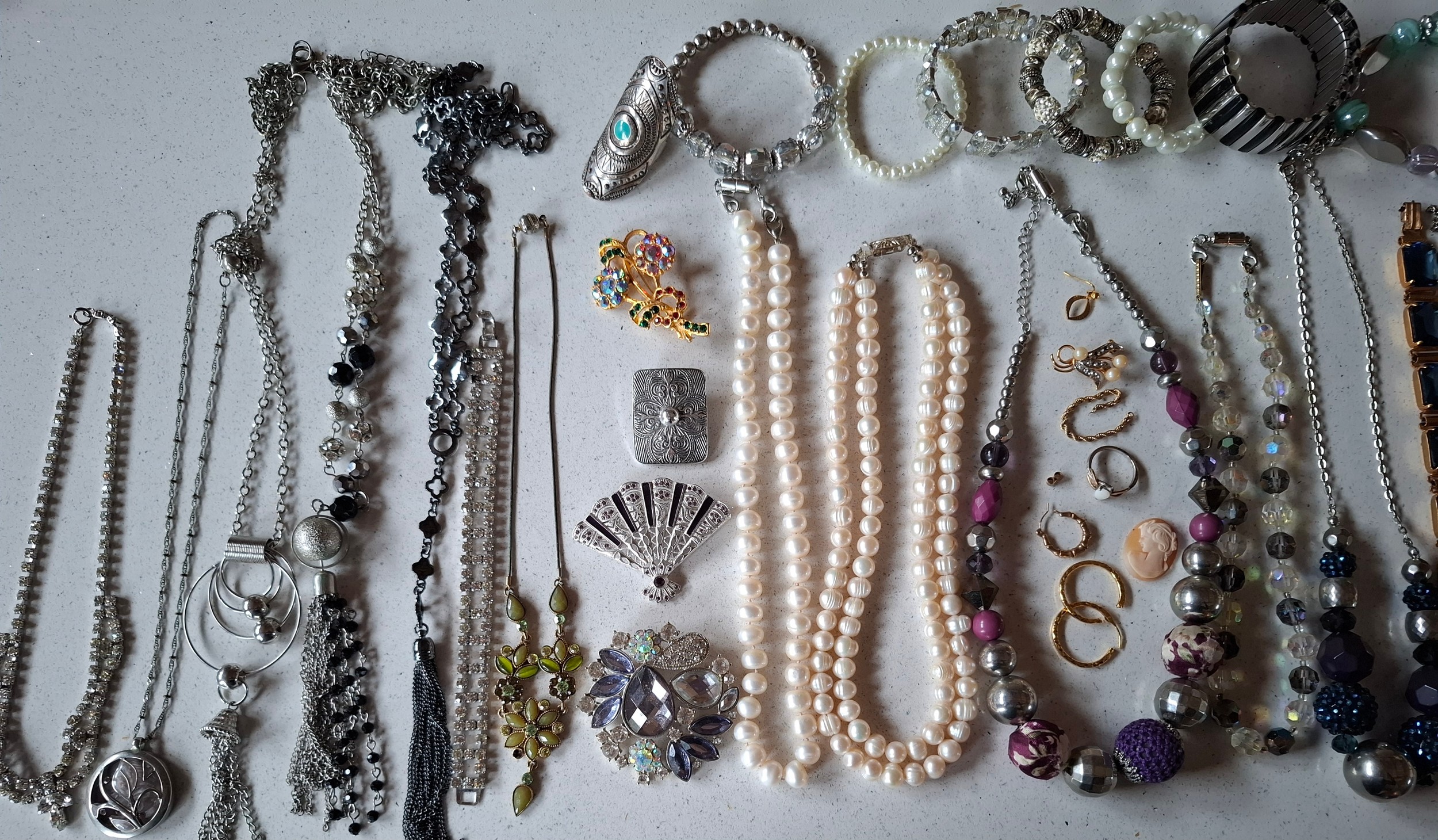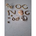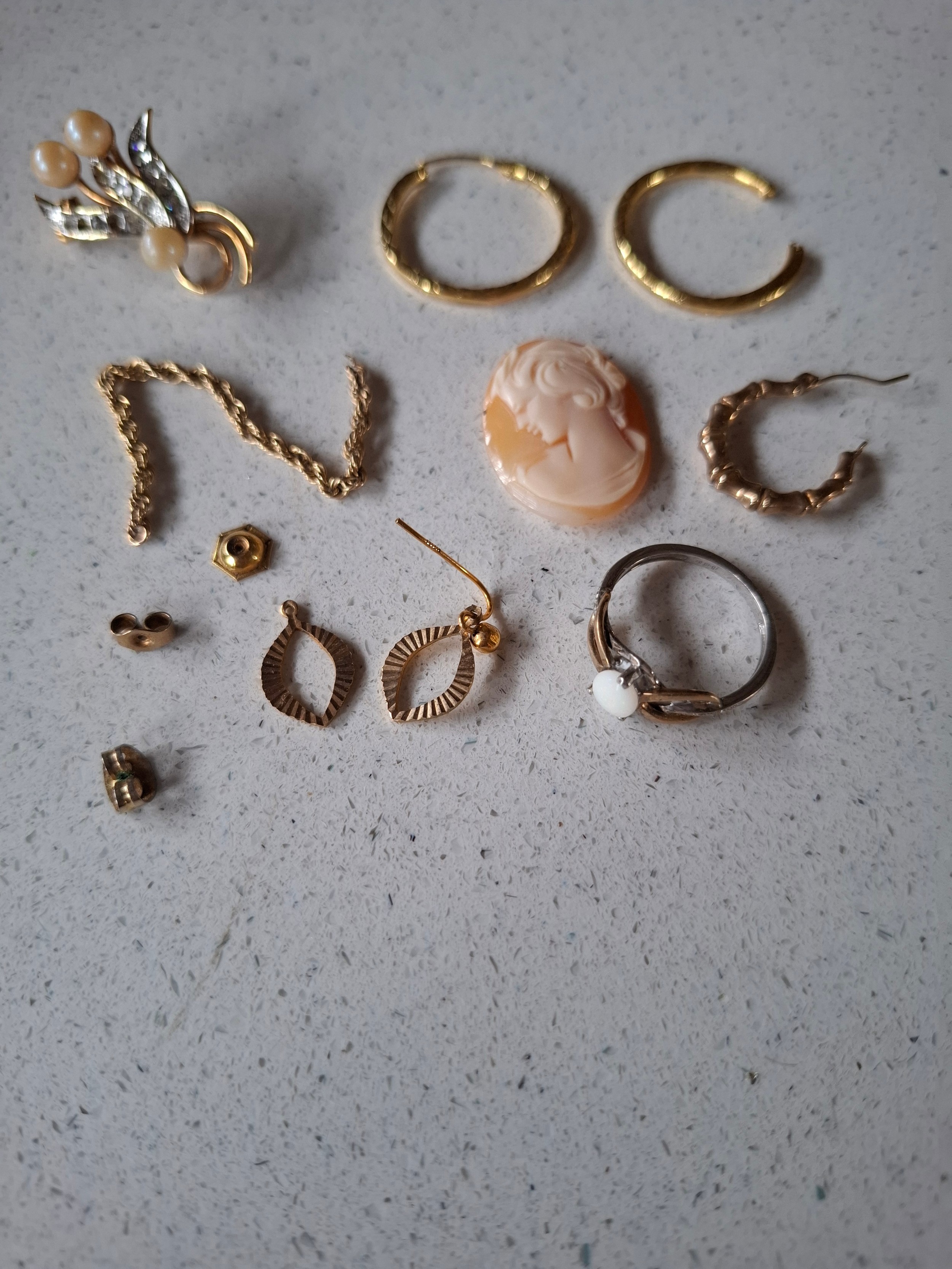 A quantity of costume jewellery to include freshwater and faux pearl necklaces, a group of yellow metal items, a 9ct and silver ring with central creamy white teardrop cabochon, a pair of 9ct gold earrings A/F stamped 375 (less than 1g), vintage brooches and modern necklaces. Location:CAB