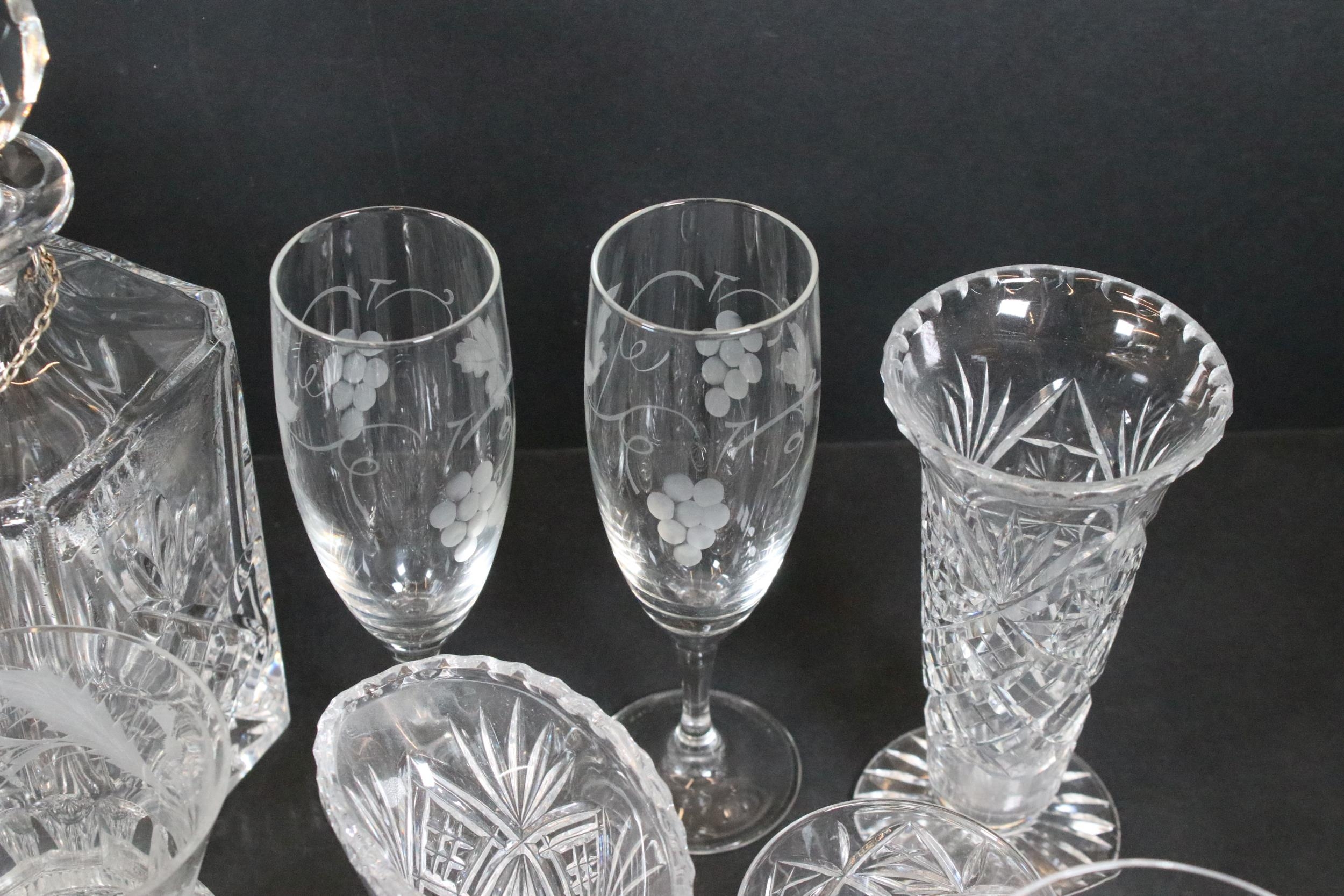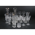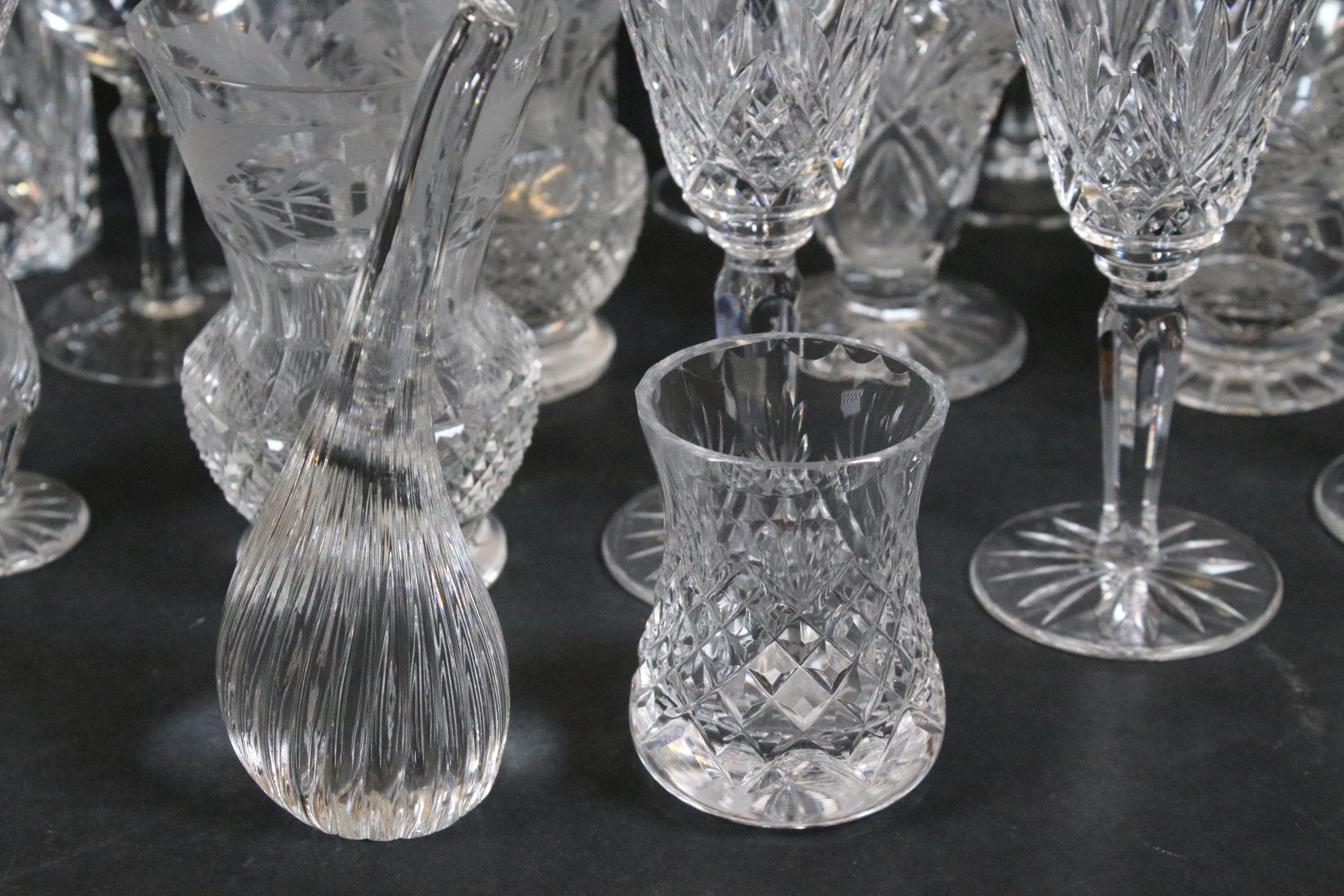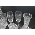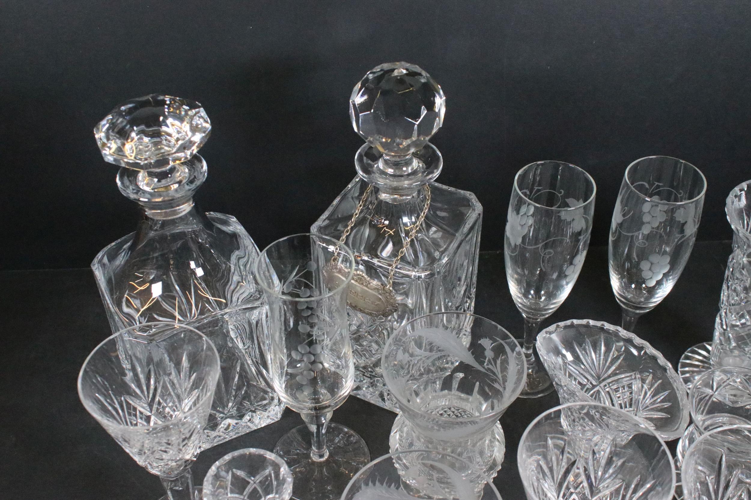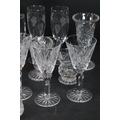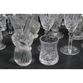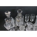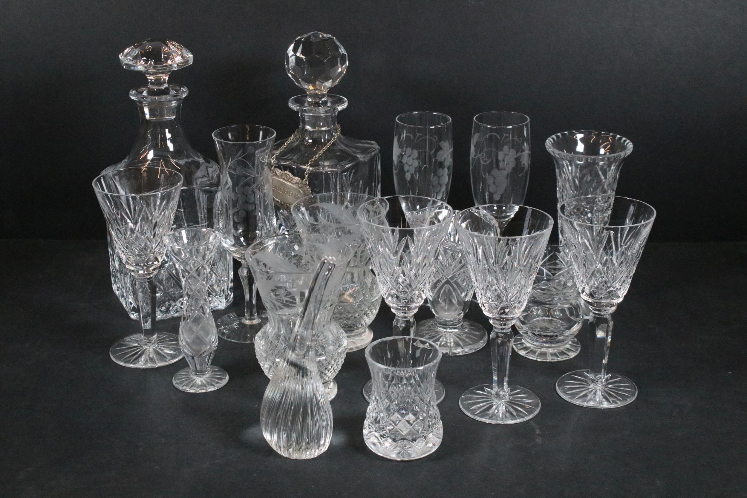 Large quantity of glass to include crystal decanters, Royal Doulton wine glasses, Waterford Marquis bowl and vase, champagne flutes, whisky tumblers, vases, liquor glasses, brandy glasses, sherry glasses and a vanity set, etc (3 boxes)
