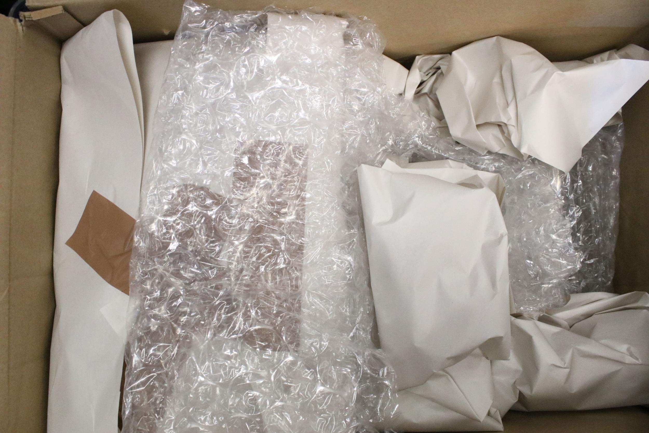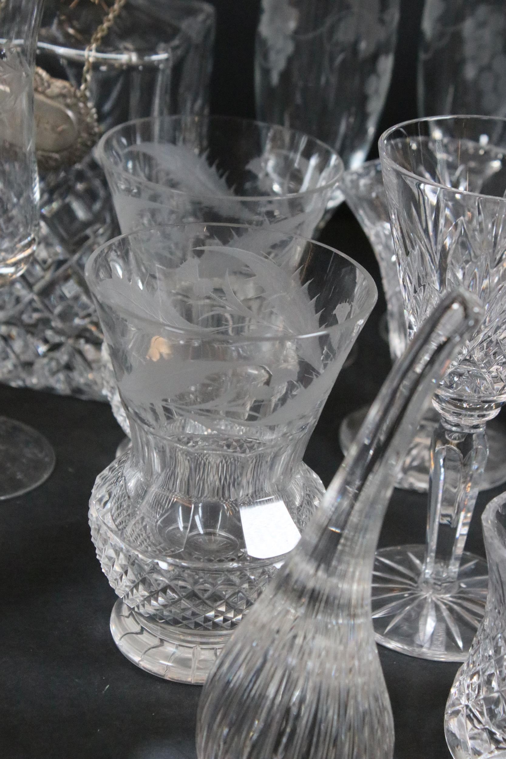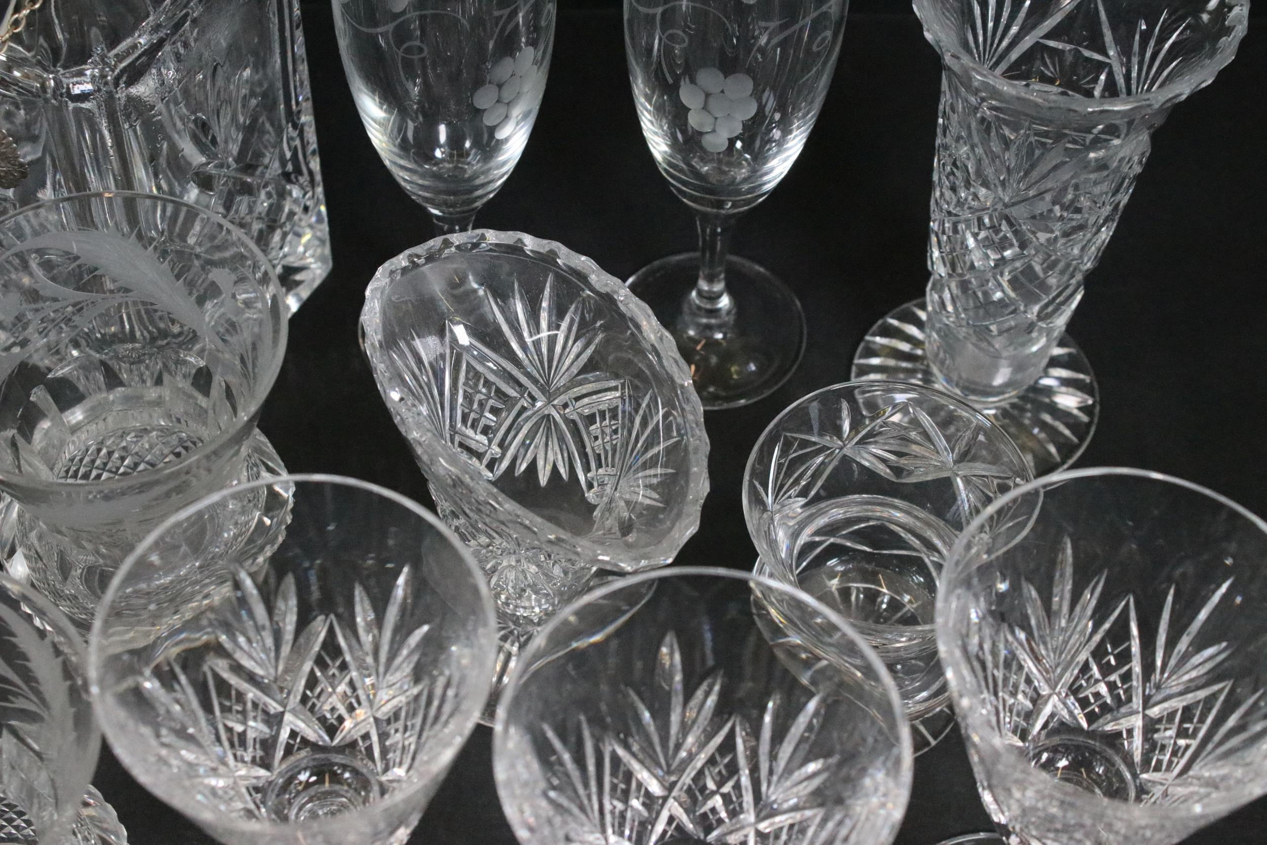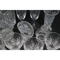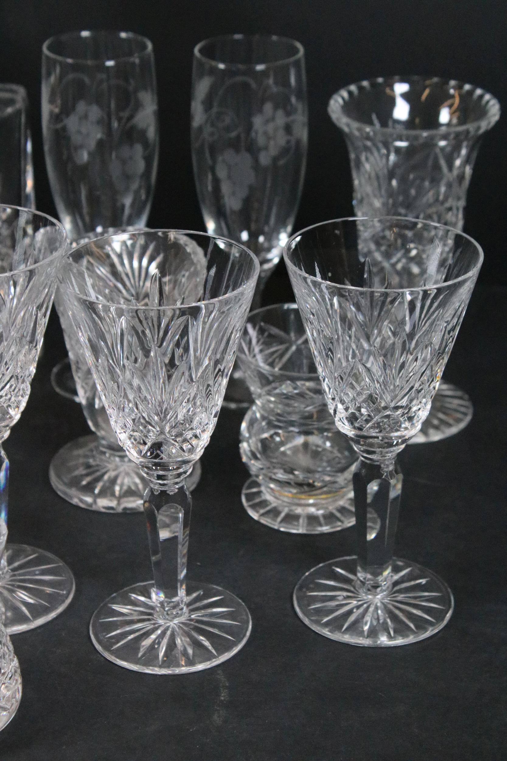 Large quantity of glass to include crystal decanters, Royal Doulton wine glasses, Waterford Marquis bowl and vase, champagne flutes, whisky tumblers, vases, liquor glasses, brandy glasses, sherry glasses and a vanity set, etc (3 boxes)
