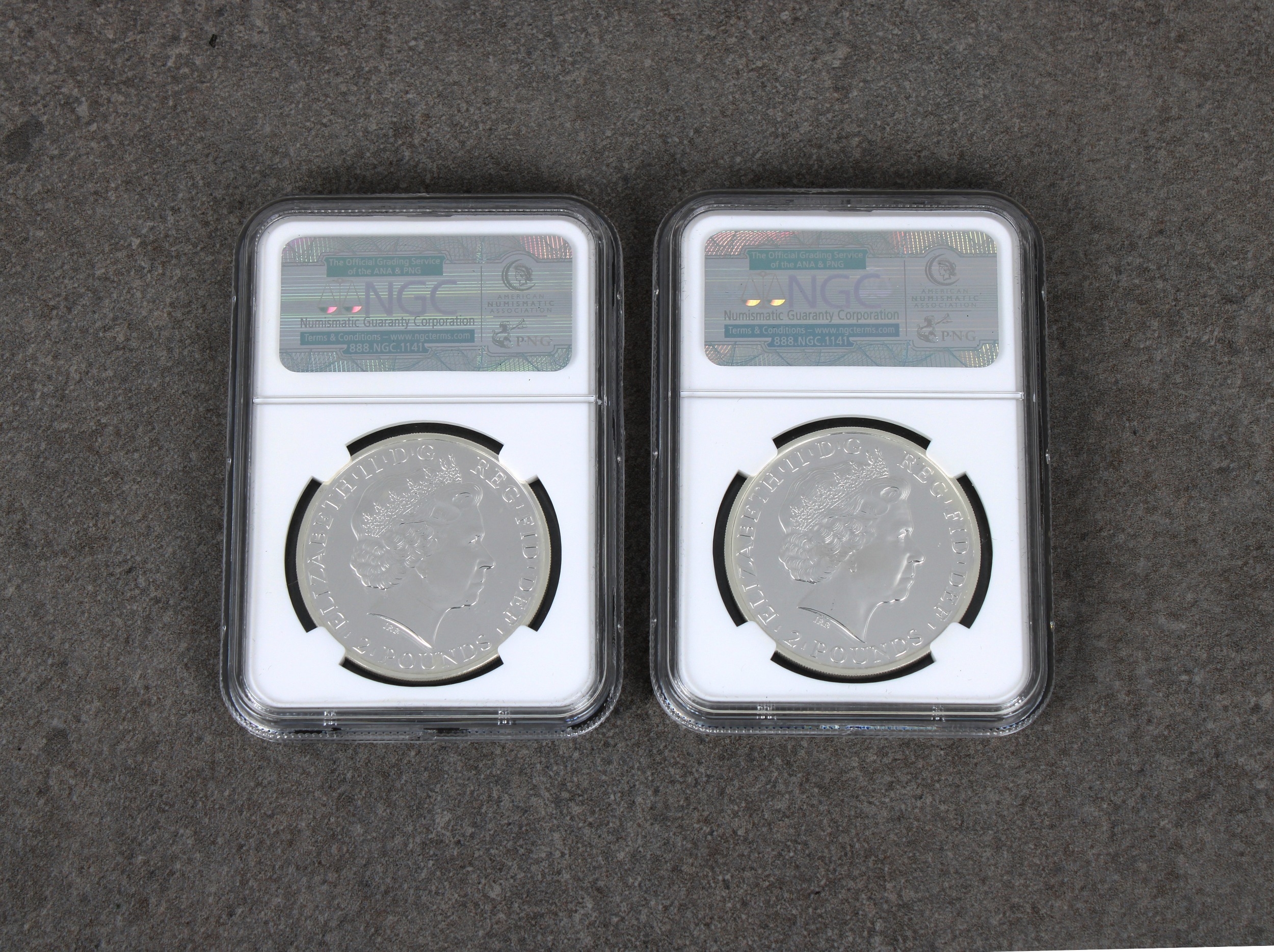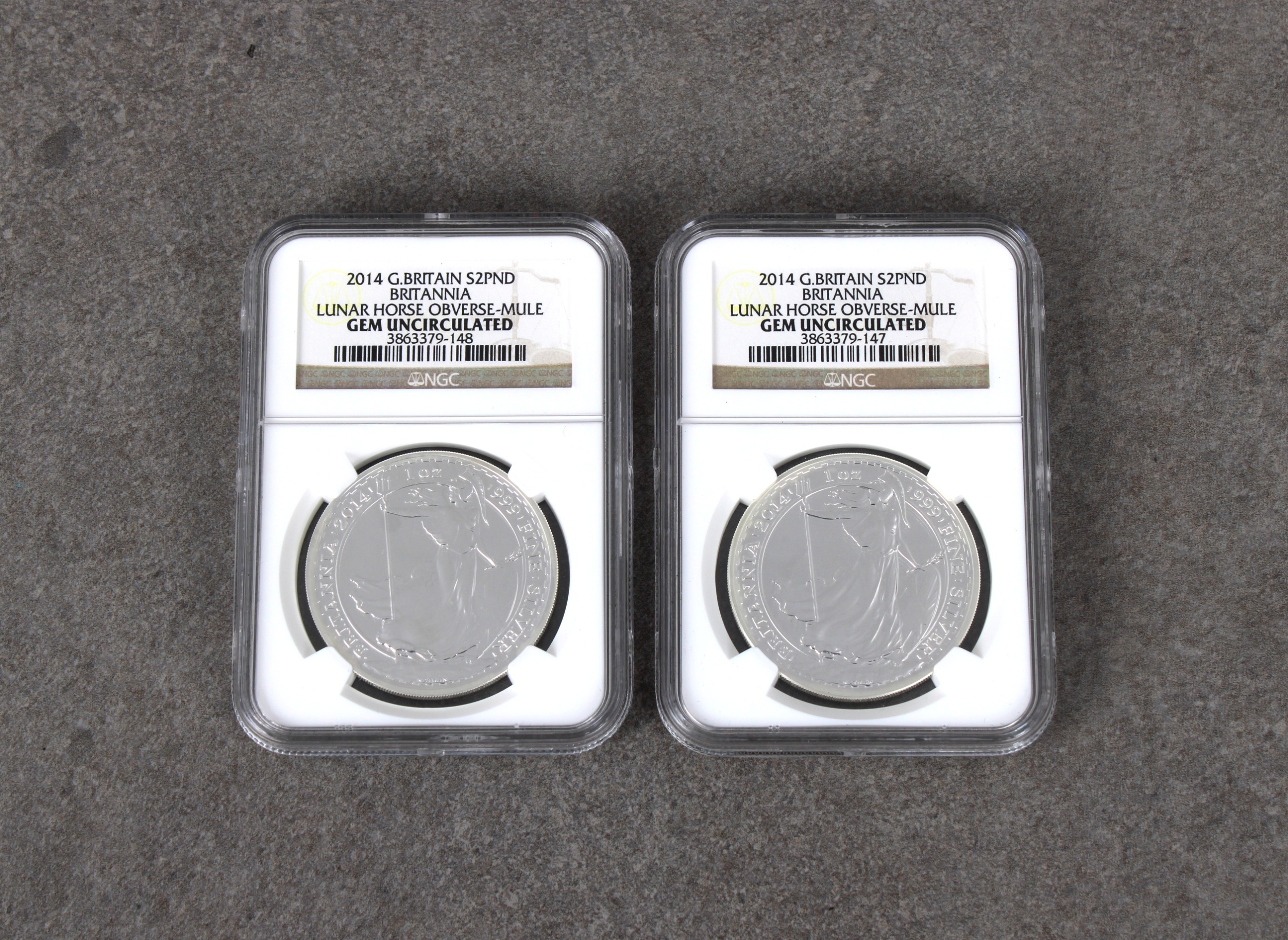 Numismatist interest - Two x 2014 Great Britain 2 Pounds Britannia Lunar Horse obverse mule - NGC graded both Gem Uncirculated, 3863379-147 & 3863379-148. (2).
