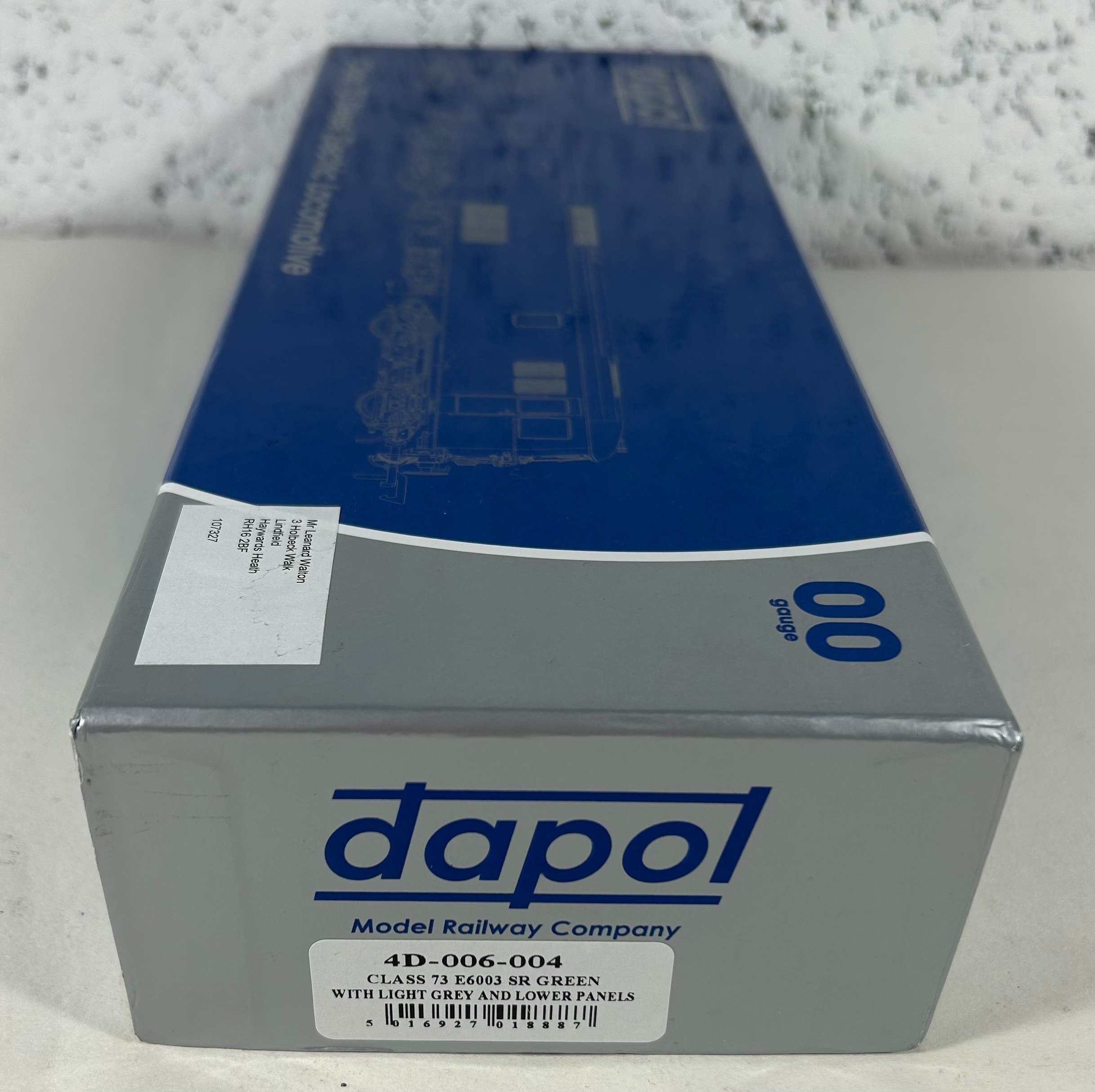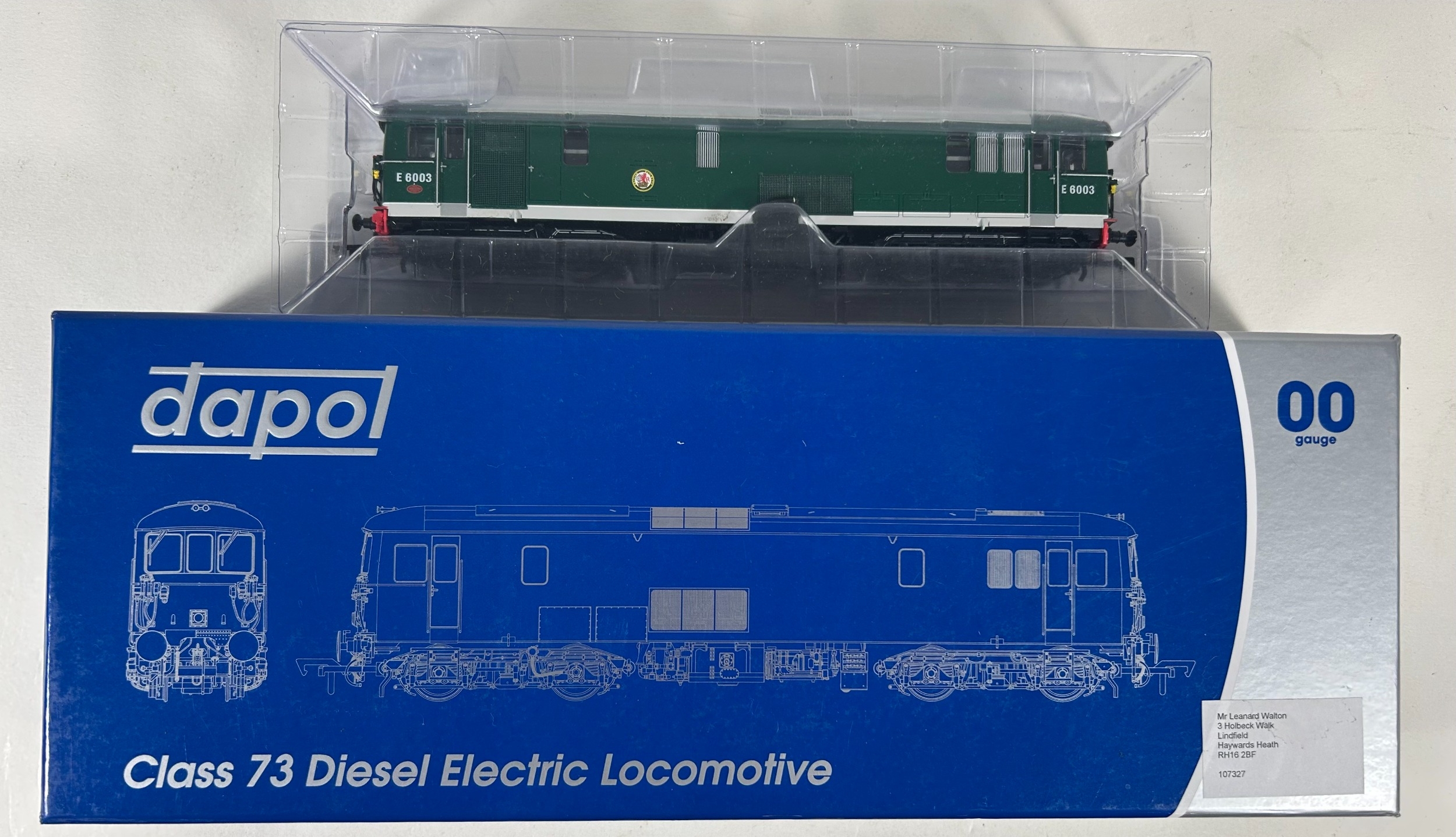 Dapol OO Railway Electro Diesel Locomotive. A Class 73 Bo-Bo E6003 (4D-006-004). In BR green with light grey lower panels livery. Boxed, with packing and paperwork. Owners label to lid. Contents Mint.