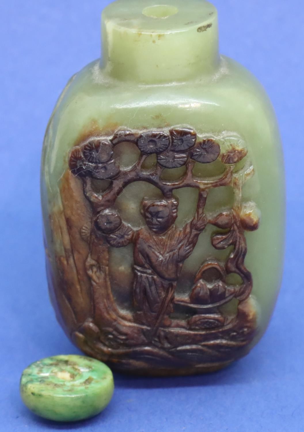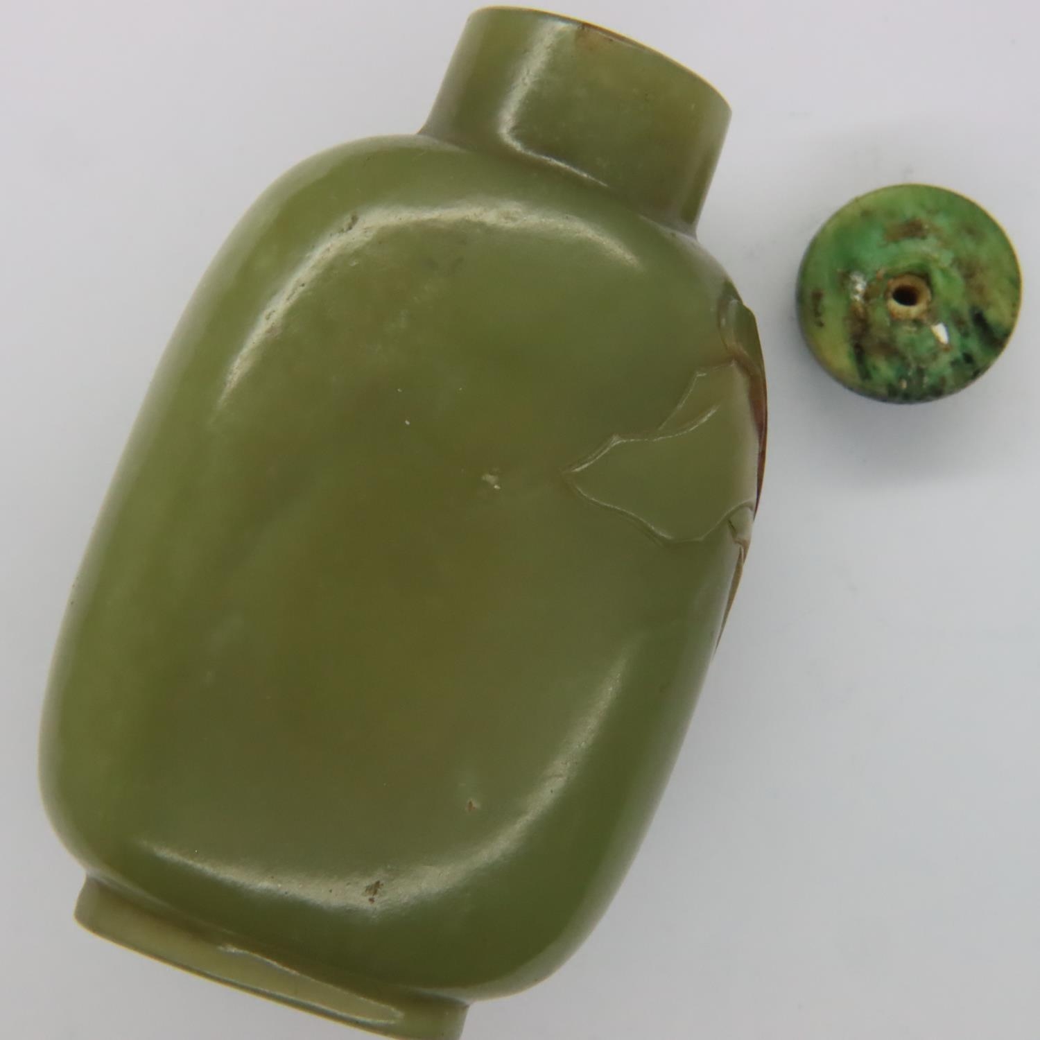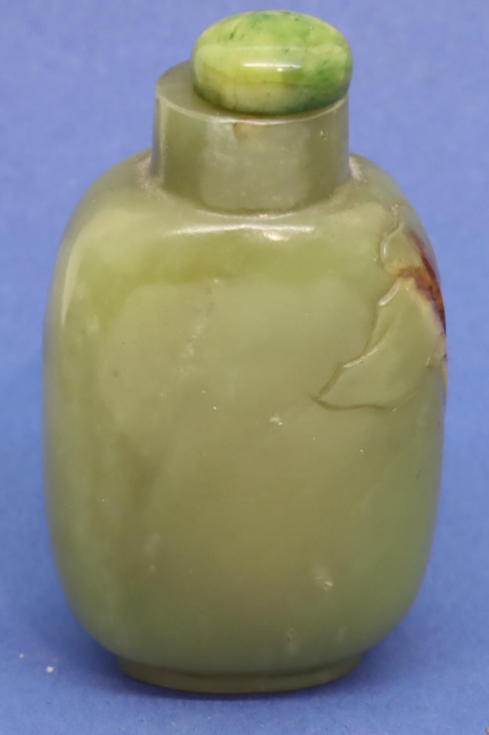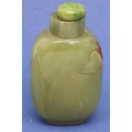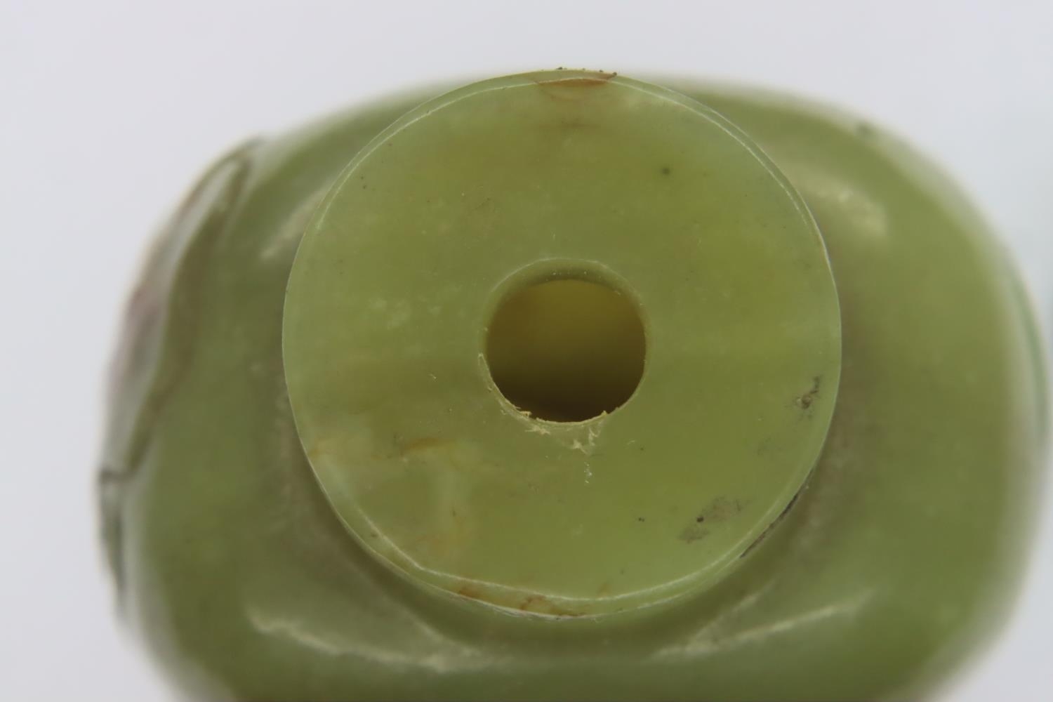Carved green jade snuff bottle with figural decanter with lid, lacking dropper. Good overall condition with no visible damages. P&P Group 1 (£14+VAT for the first lot and £1+VAT for subsequent lots)