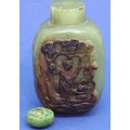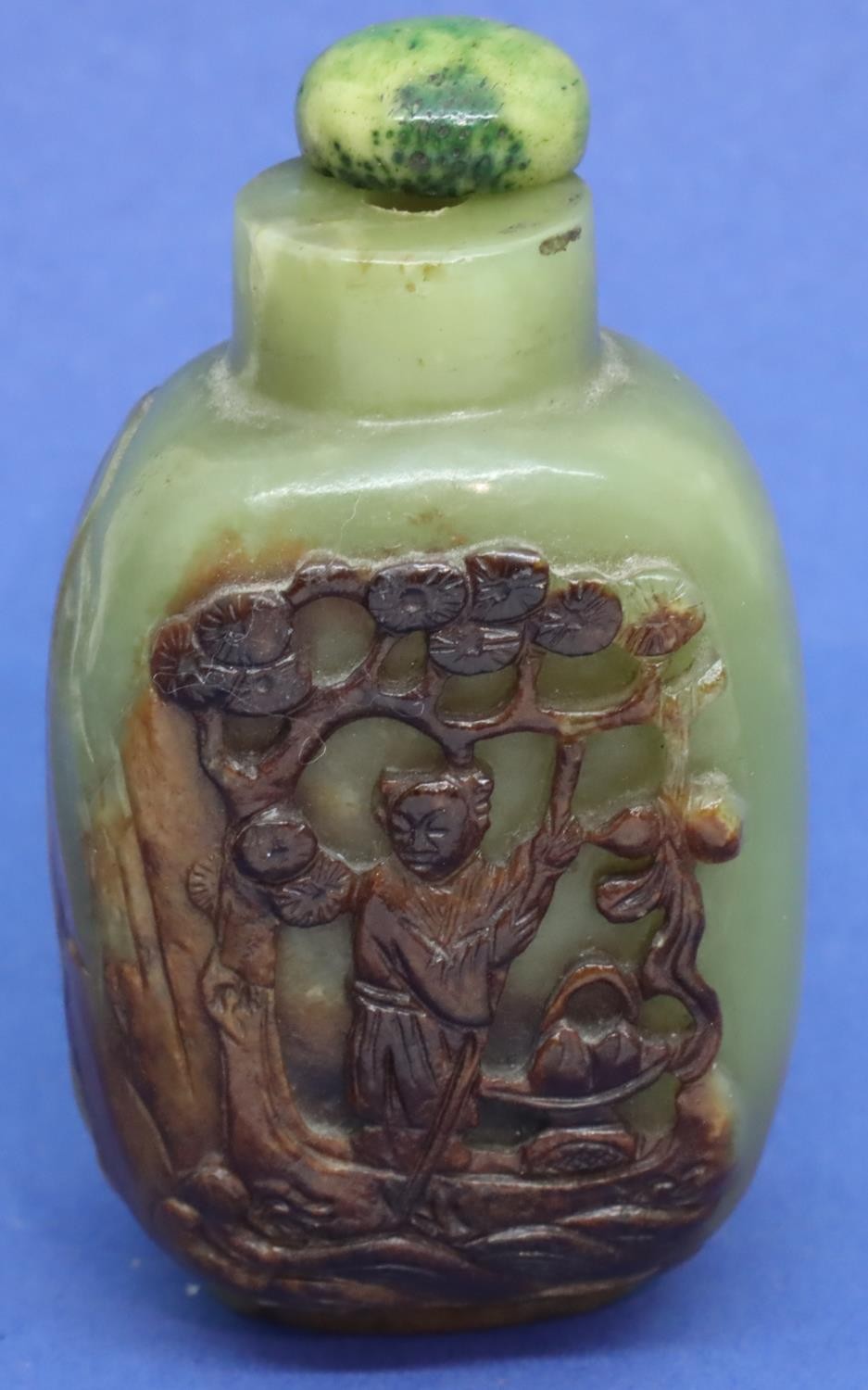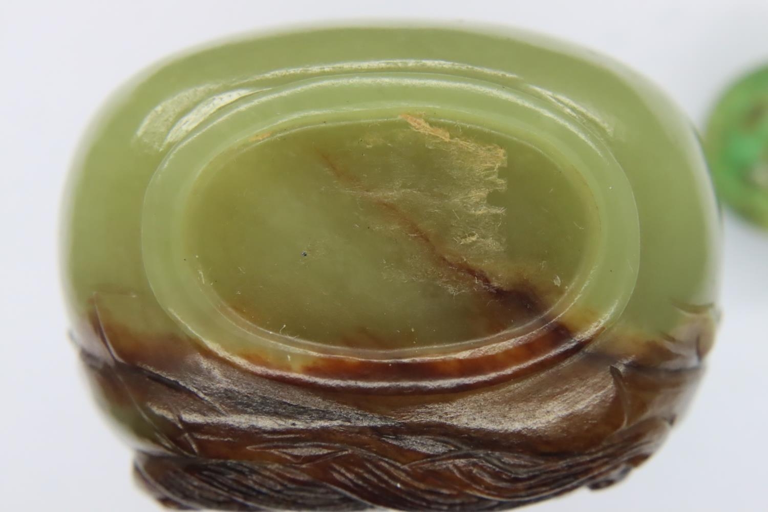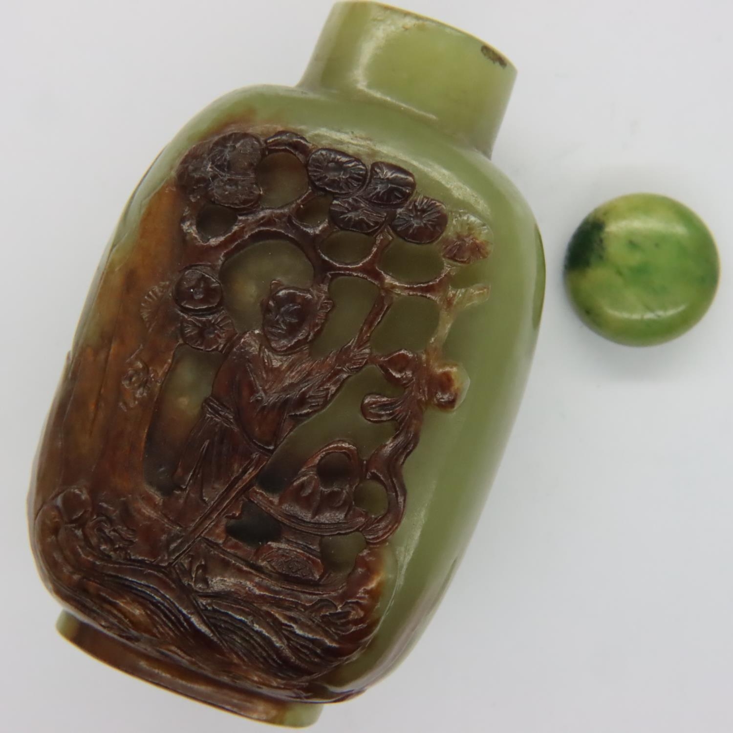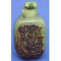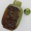 Carved green jade snuff bottle with figural decanter with lid, lacking dropper. Good overall condition with no visible damages. P&P Group 1 (£14+VAT for the first lot and £1+VAT for subsequent lots)
