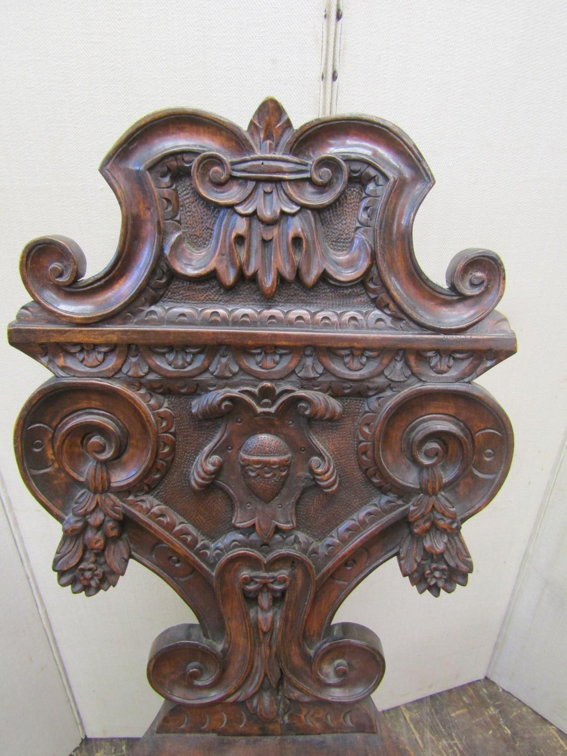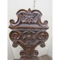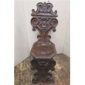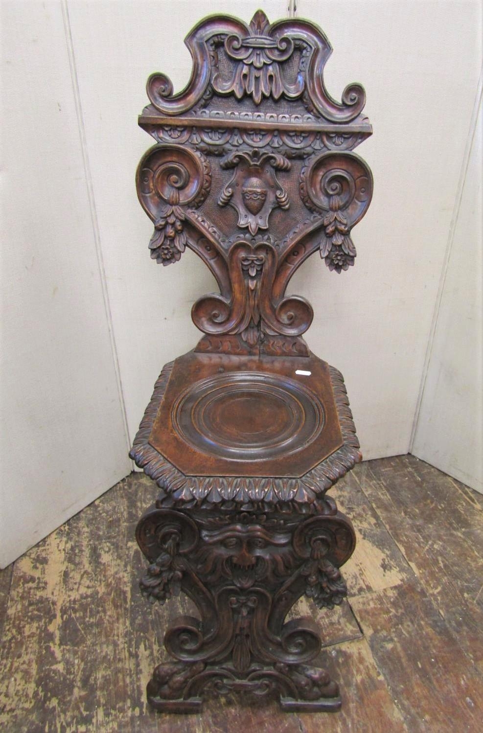 19th century continental walnut hall chair of flamboyant design, the seat with dished centre, the back with scrolled , floral, armorial and other geometric detail, raised on shaped supports, with grotesque mask, lions paw feet and other detail