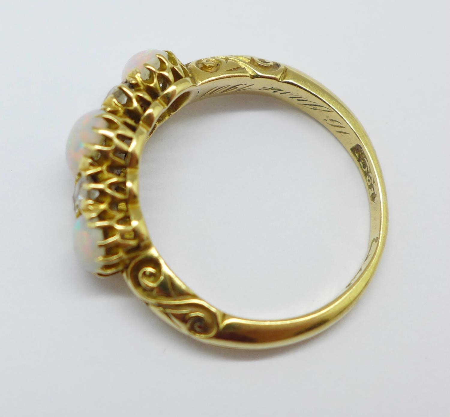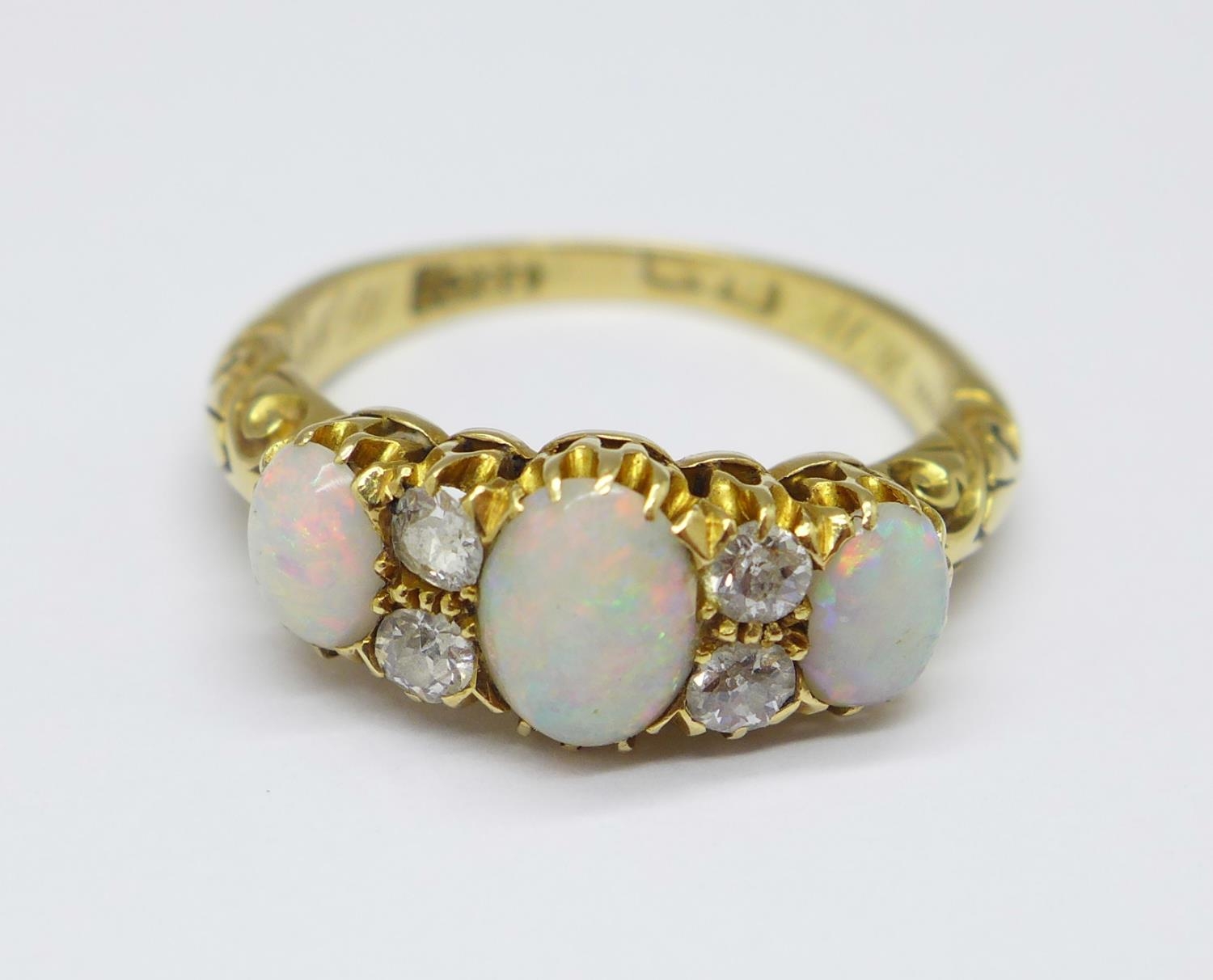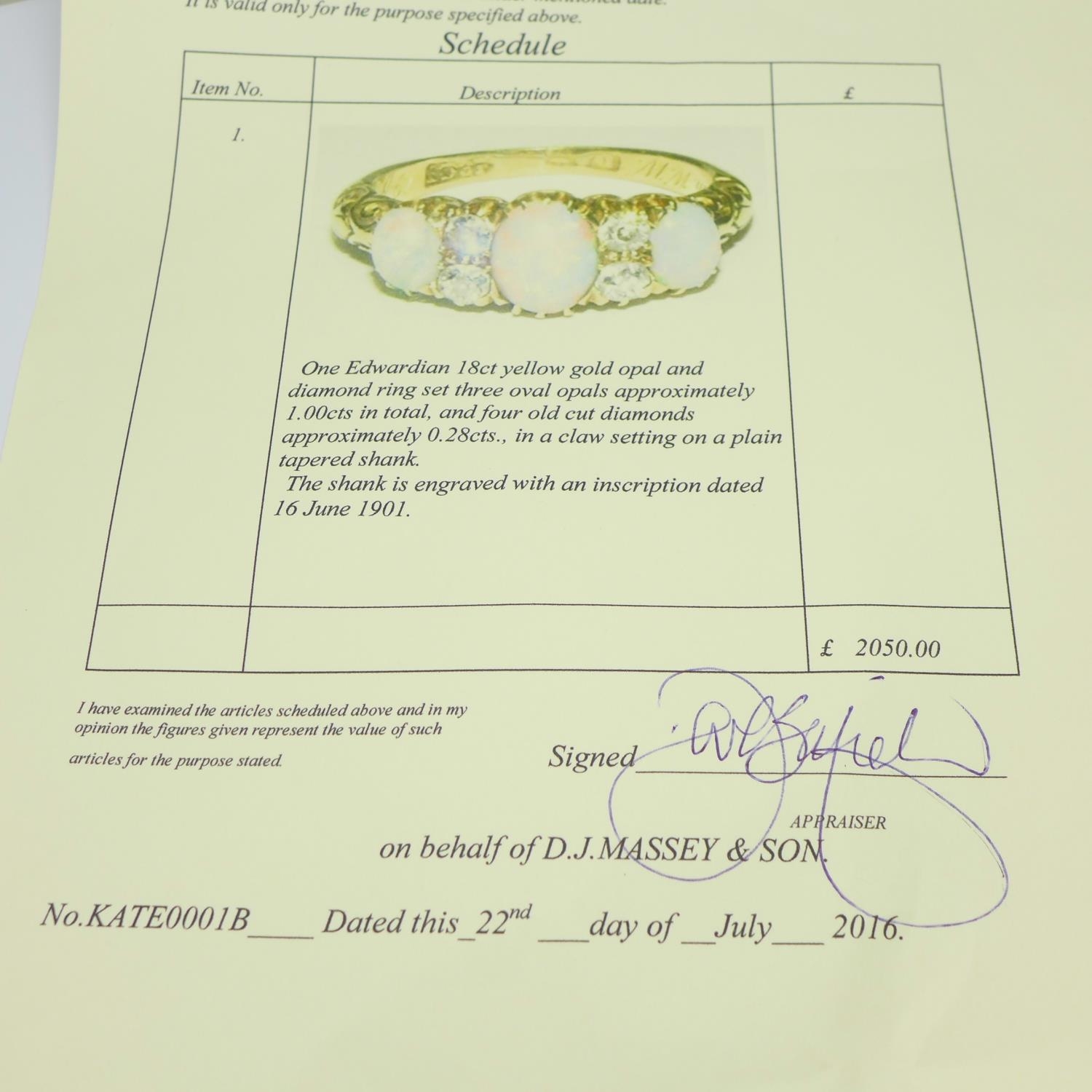 An Edwardian 18ct gold, opal and old cut diamond ring, with insurance valuation certificate dated 22/7/16 for £2050.00, bears inscription dated 1901, 4.7g, O
