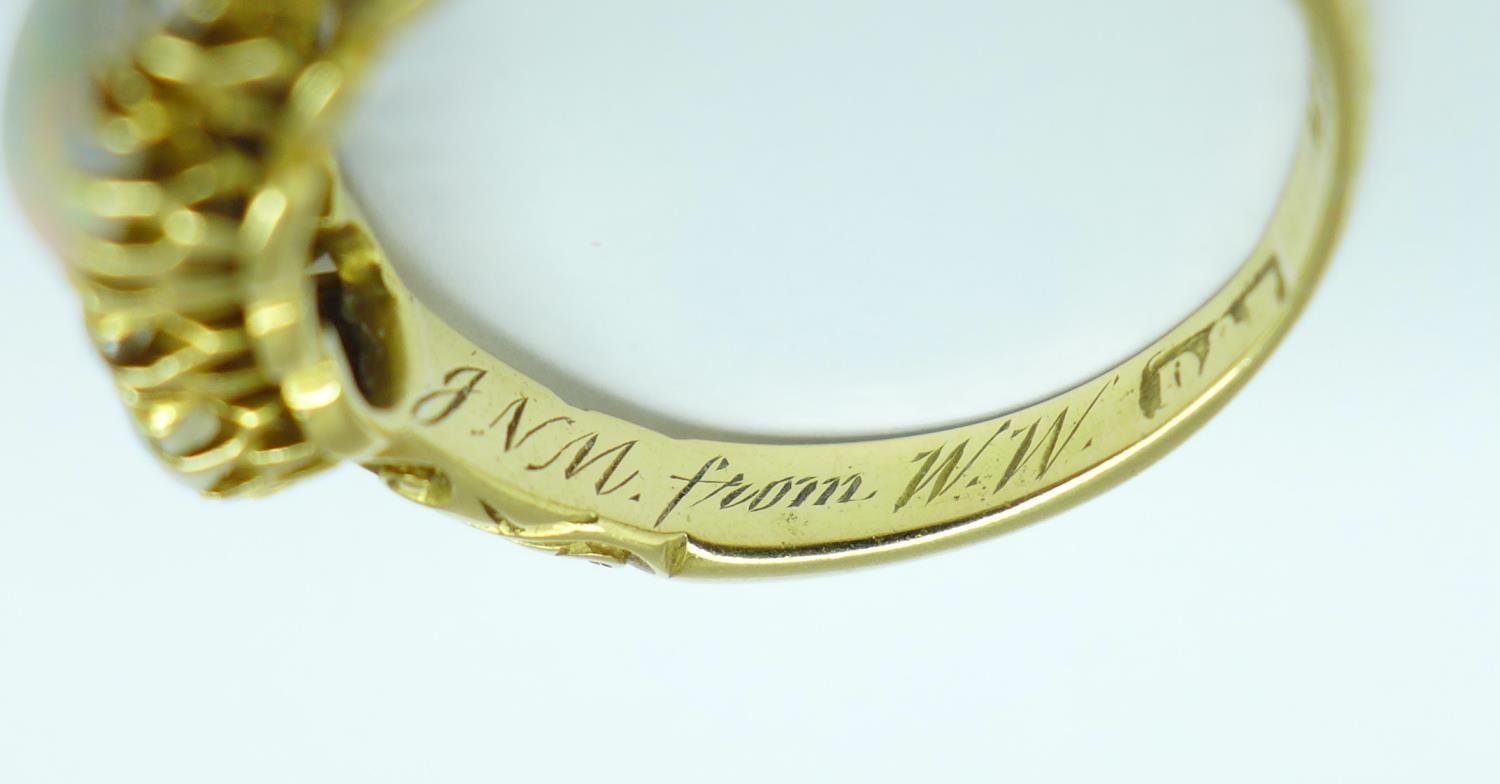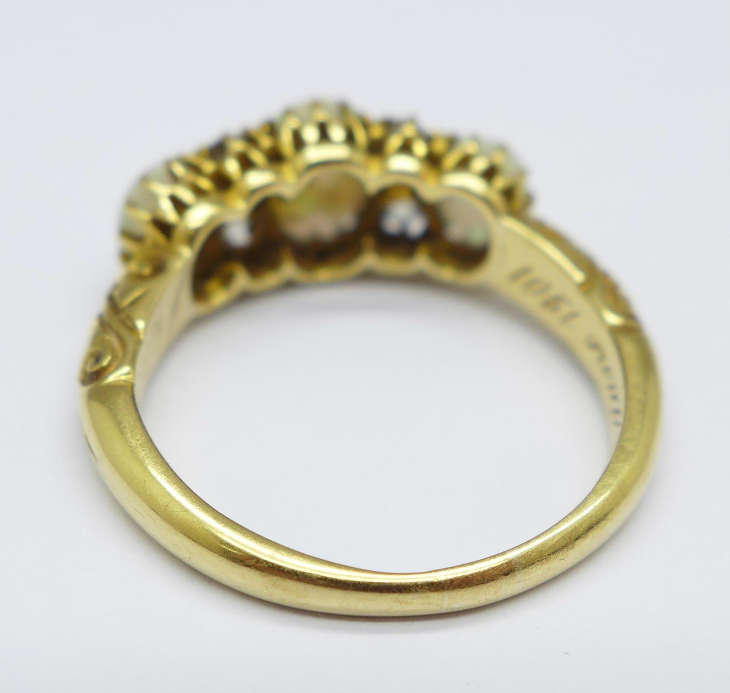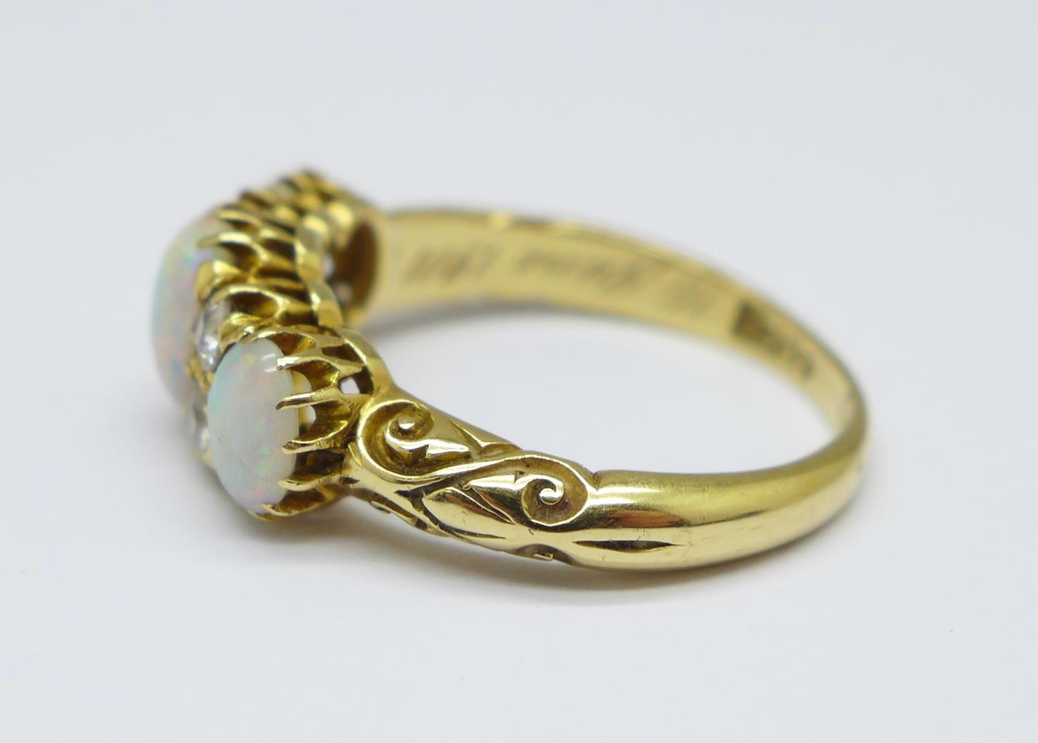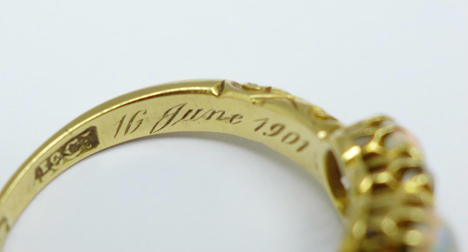 An Edwardian 18ct gold, opal and old cut diamond ring, with insurance valuation certificate dated 22/7/16 for £2050.00, bears inscription dated 1901, 4.7g, O