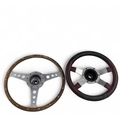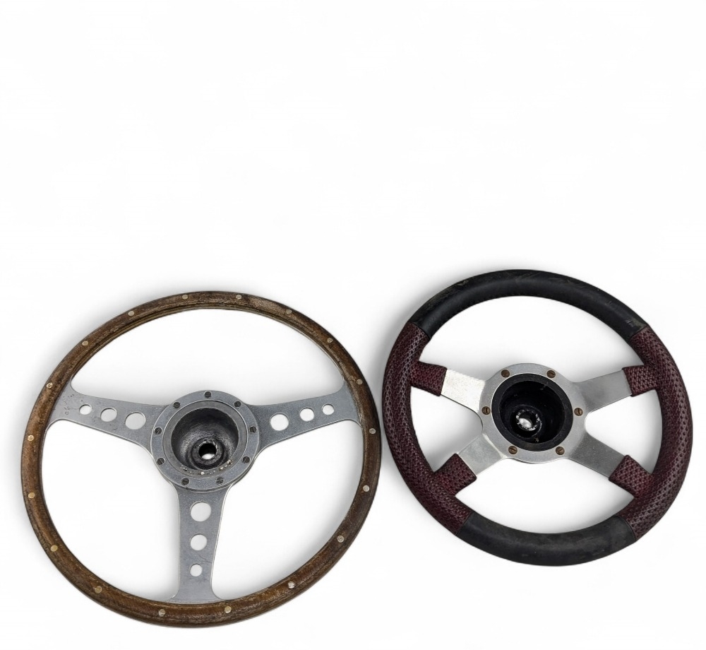 2x Vintage Car Steering Wheels - a good Simon Green Moto Lita steering wheel with wooden grip - #38cm diameter, plus a small, padded one possibly off a mini