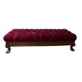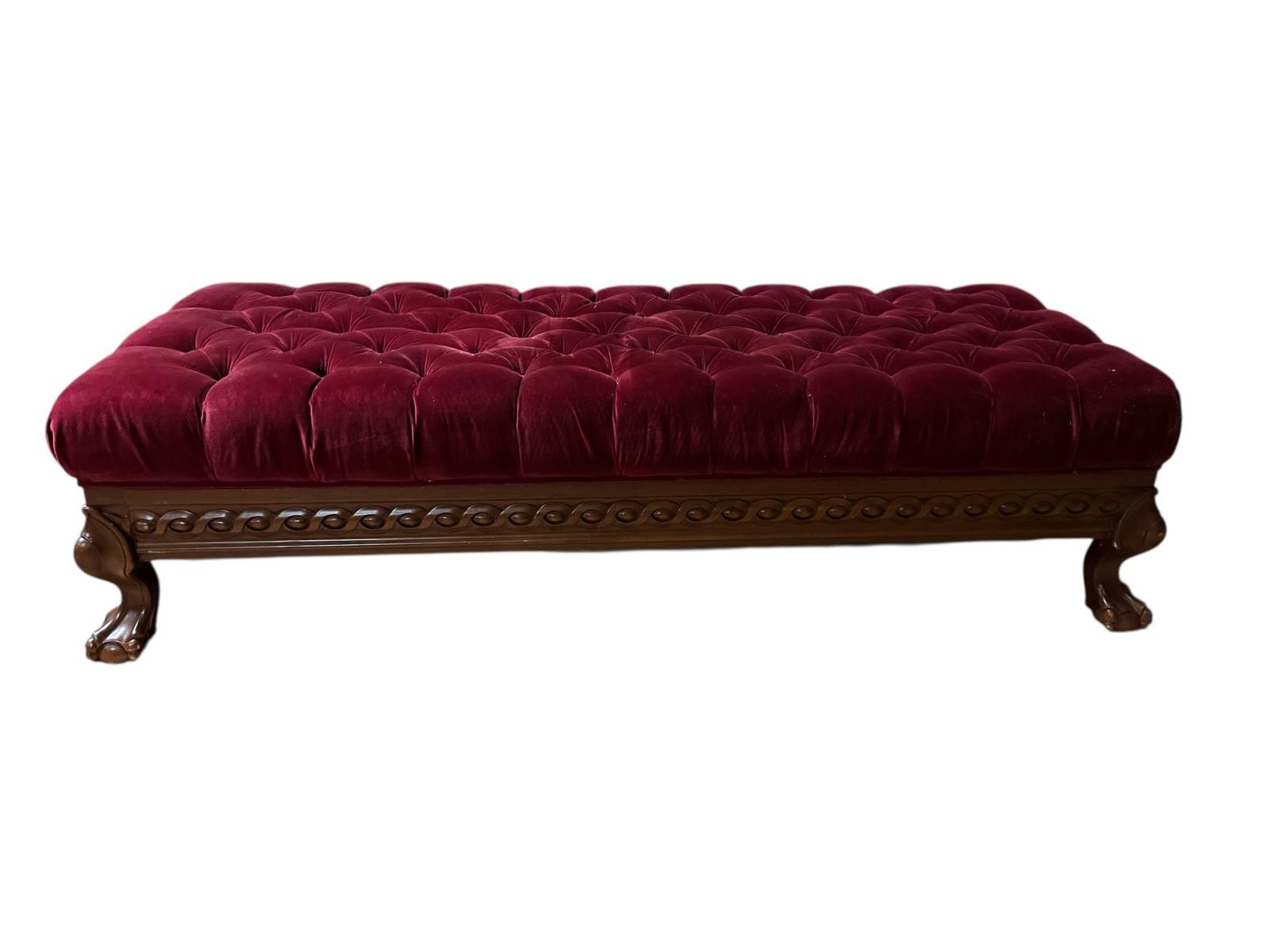 A CHIPPENDALE STYLE MAHOGANY AND UPHOLSTERED STOOL of rectangular outline with deep buttoned upholstered seat with carved apron on cabriole legs with claw and ball feet 41cm (h) x 60cm (w) x 60cm (d)