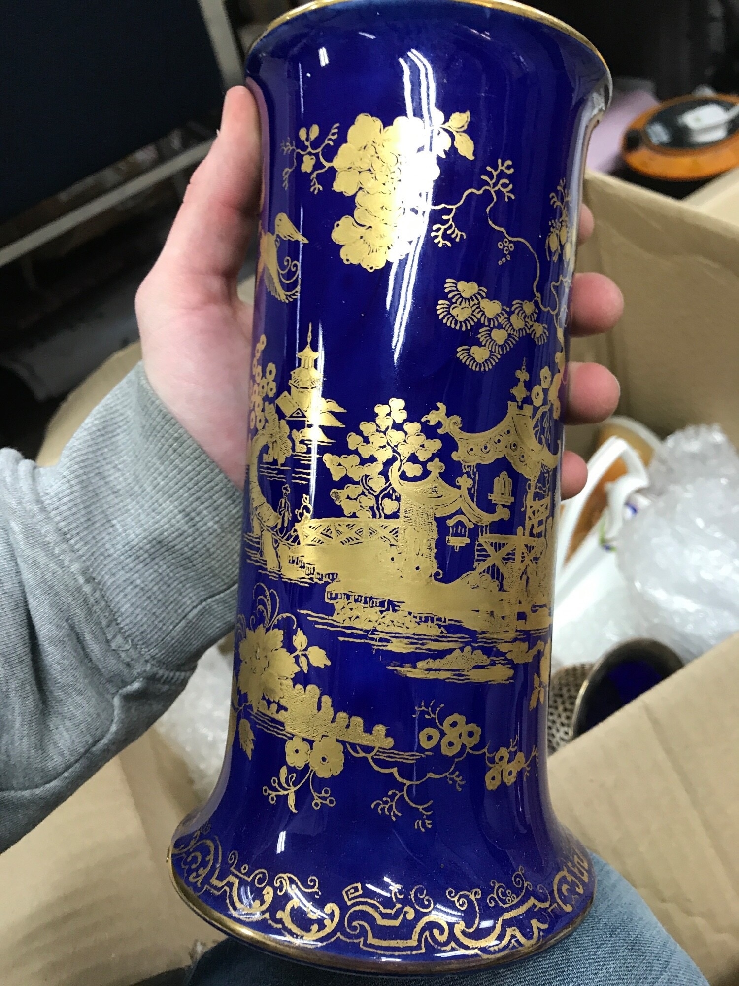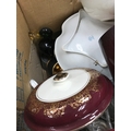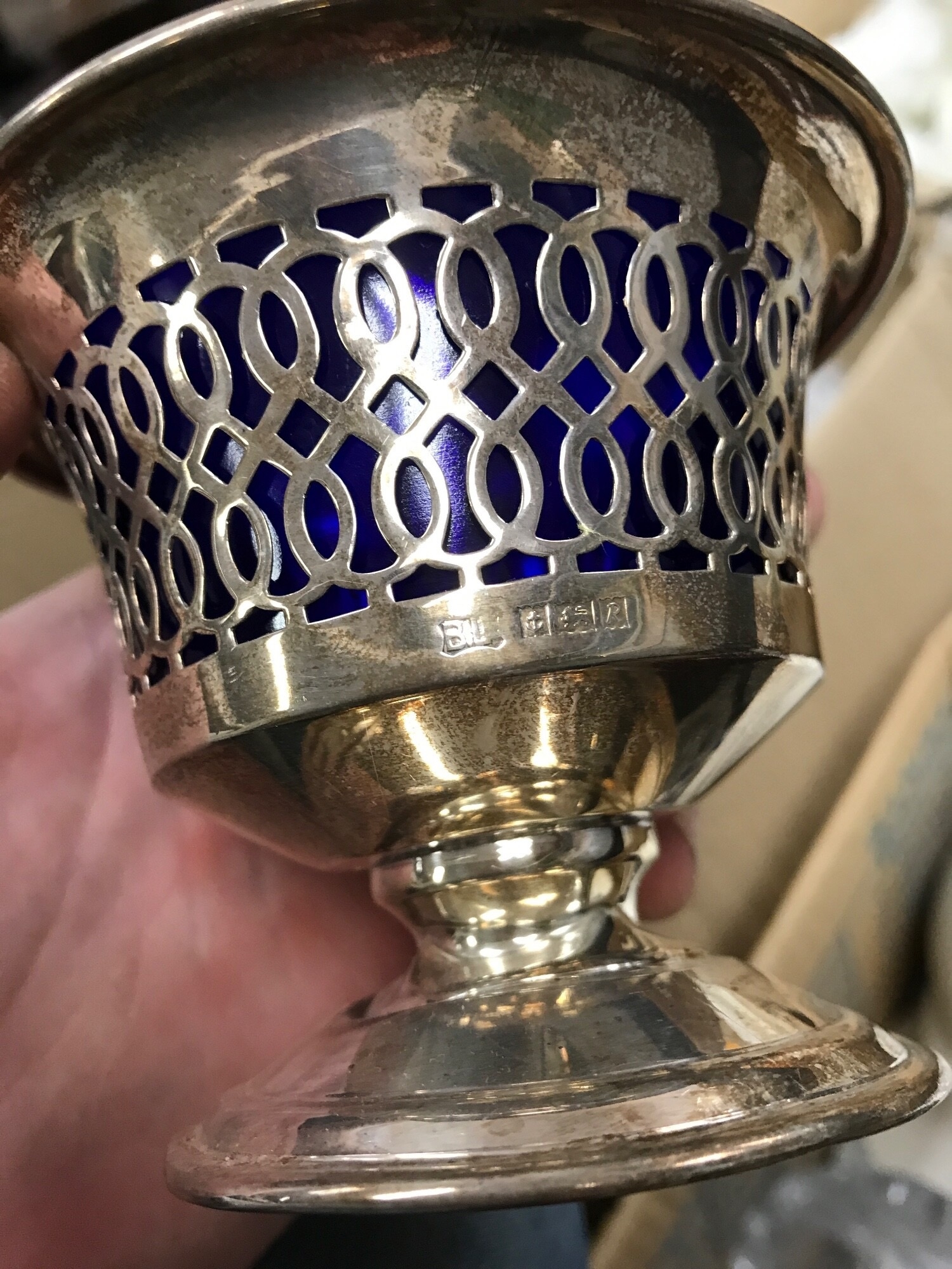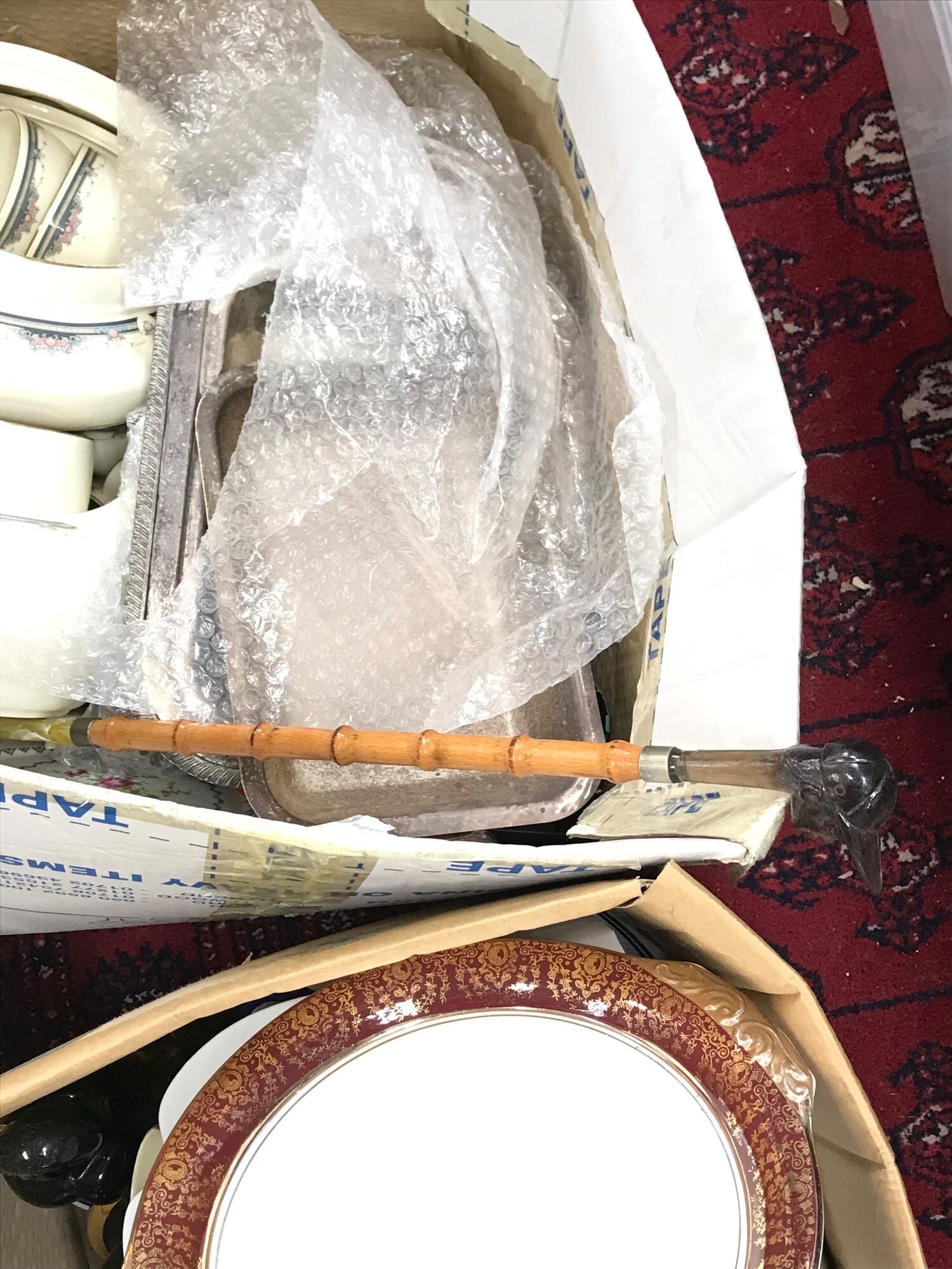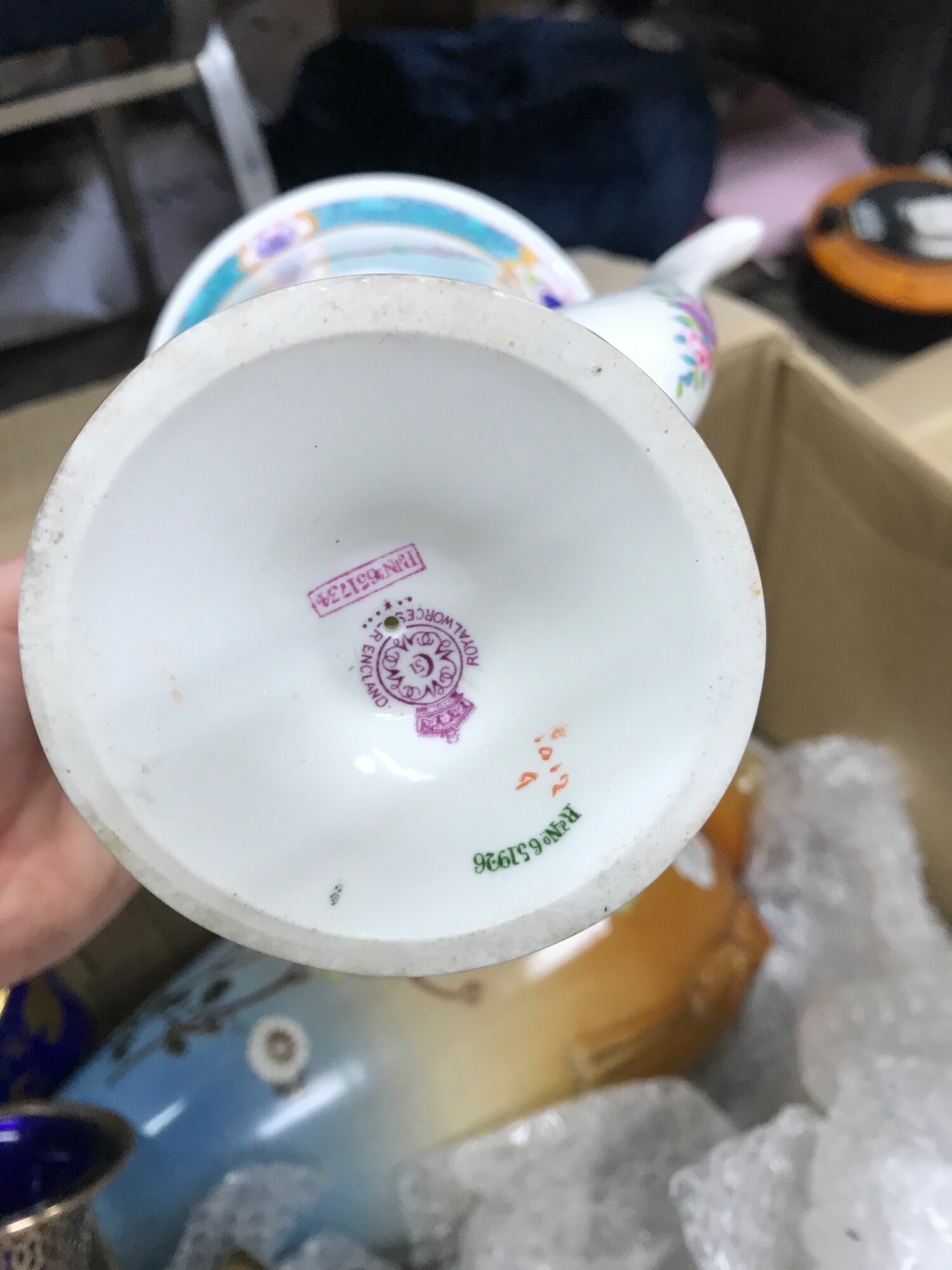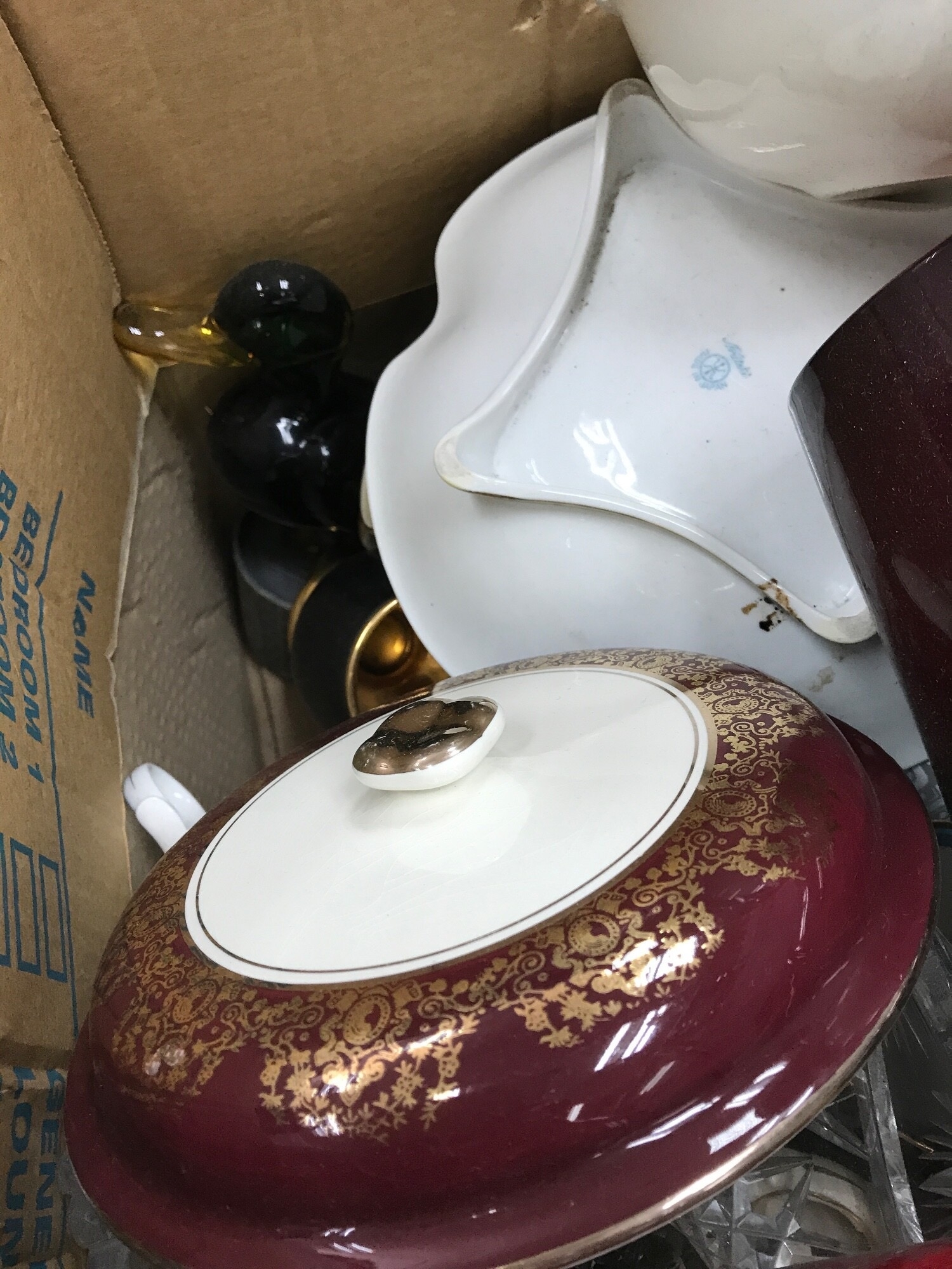 Four boxes of ceramics, cauldron, royal Worcester etc, silver hallmarked items, noritake, art glass duck figure. No reserve