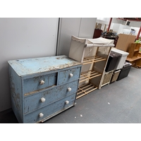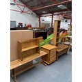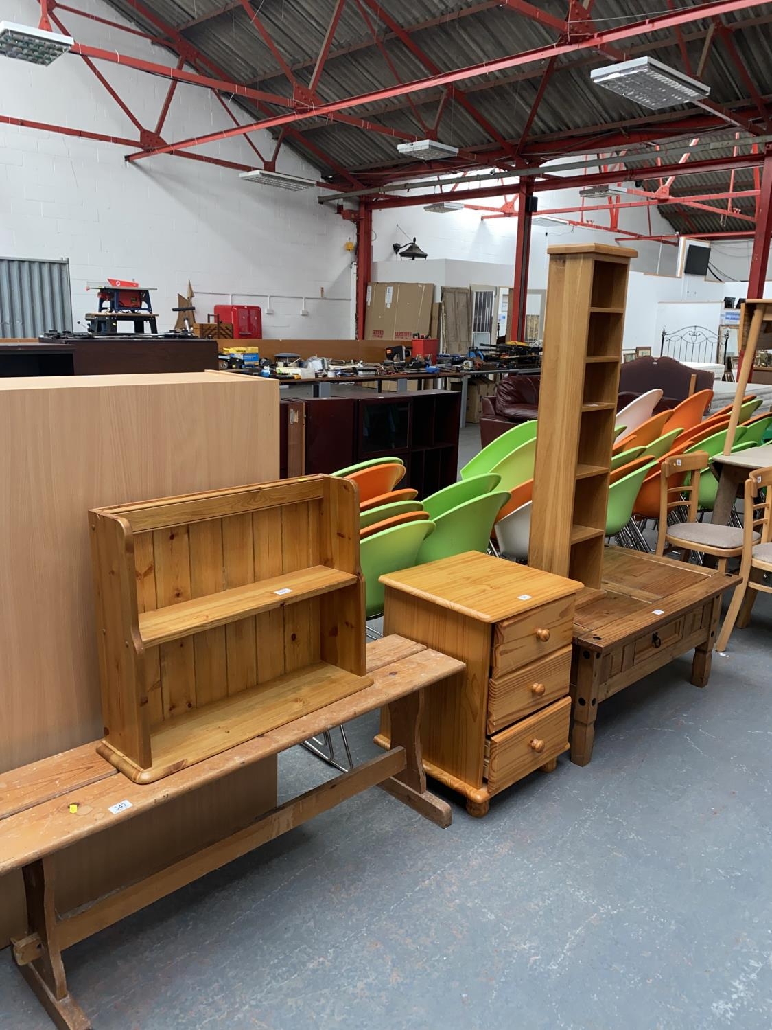 A pine bench, pine coffee table, bedside cabinet, wall rack and CD rack