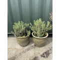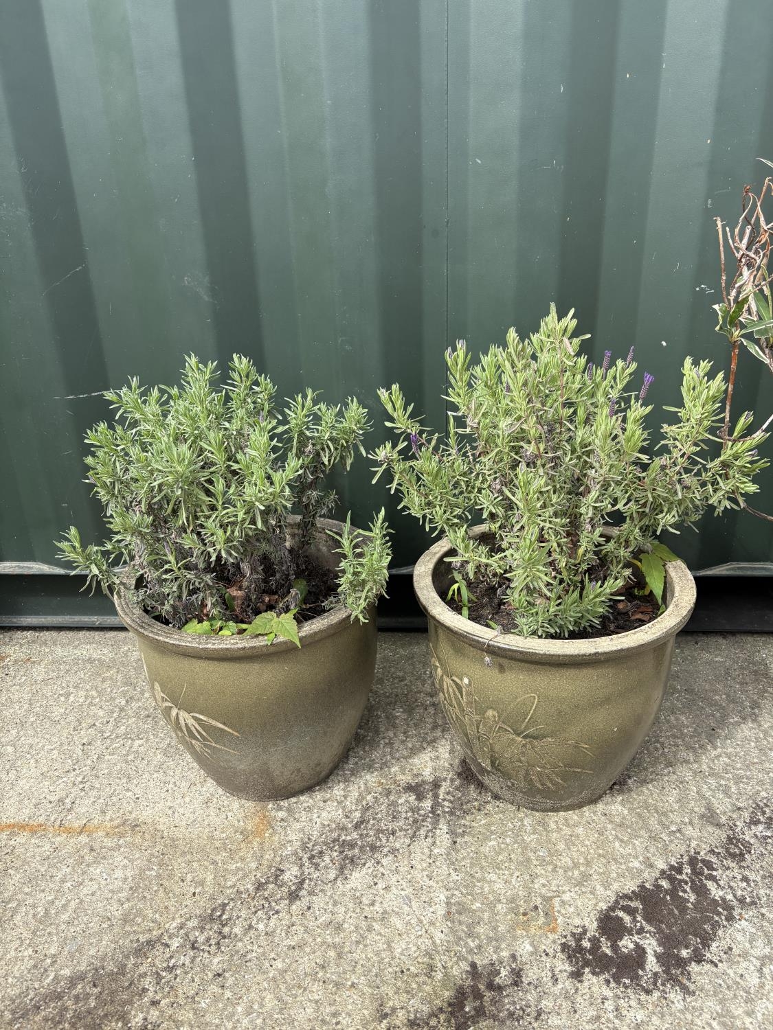 Two glazed pots planted with lavender, each pot height 32 cms, diameter 32 cms