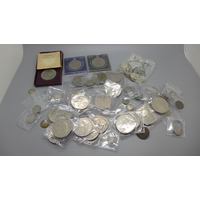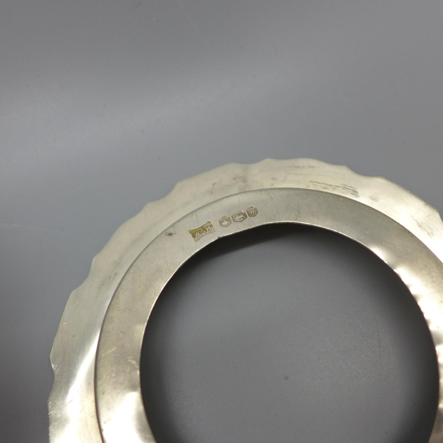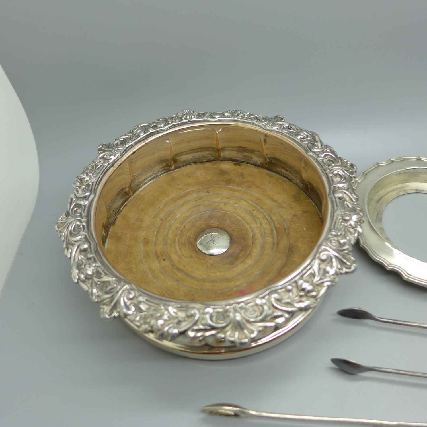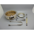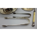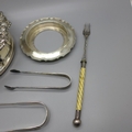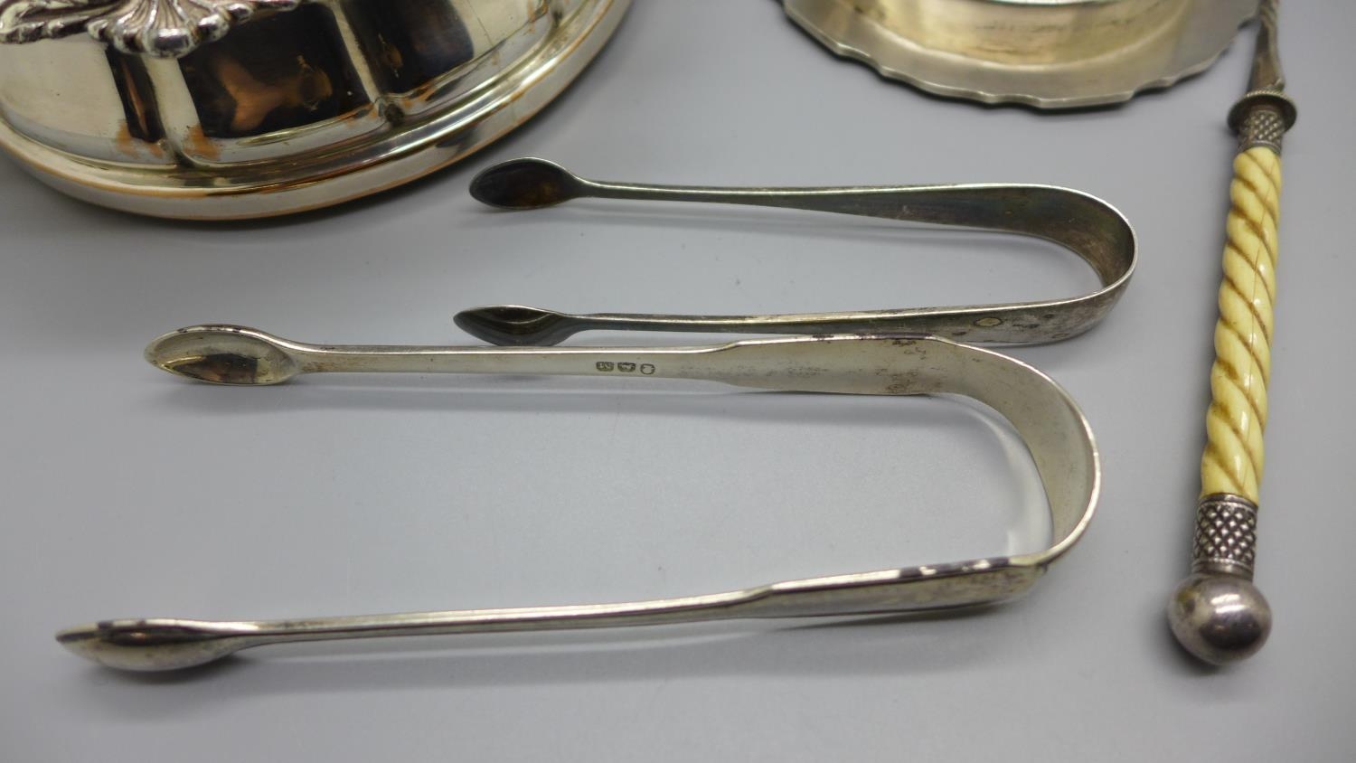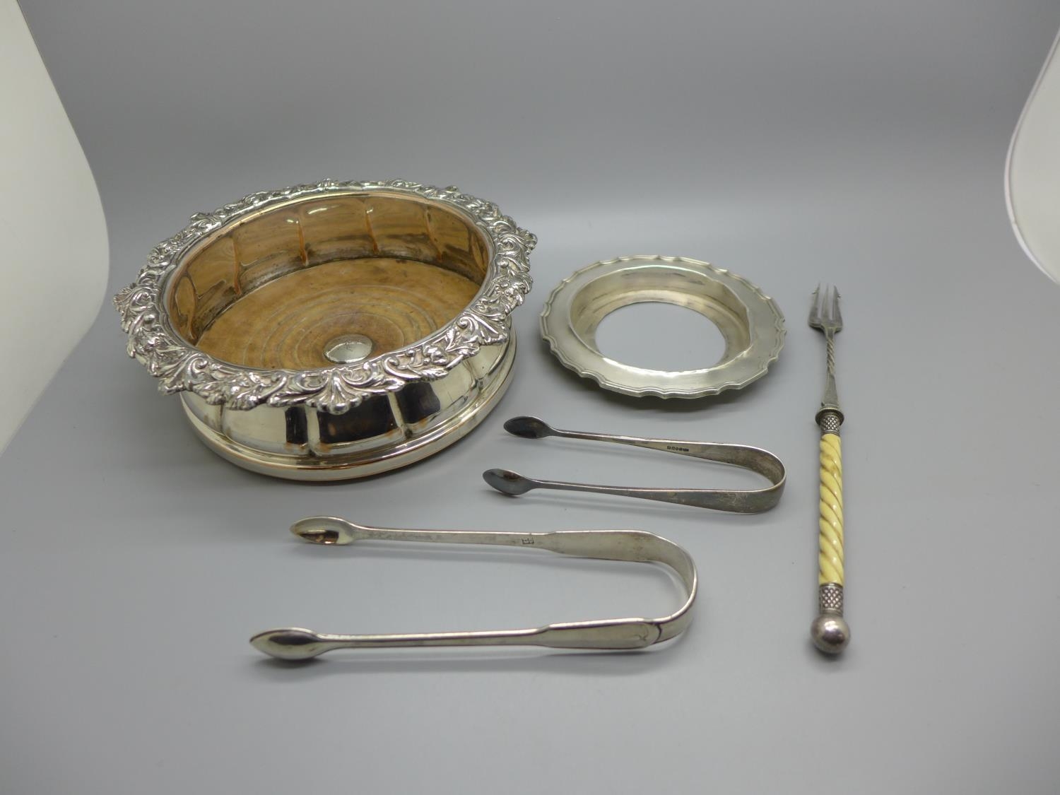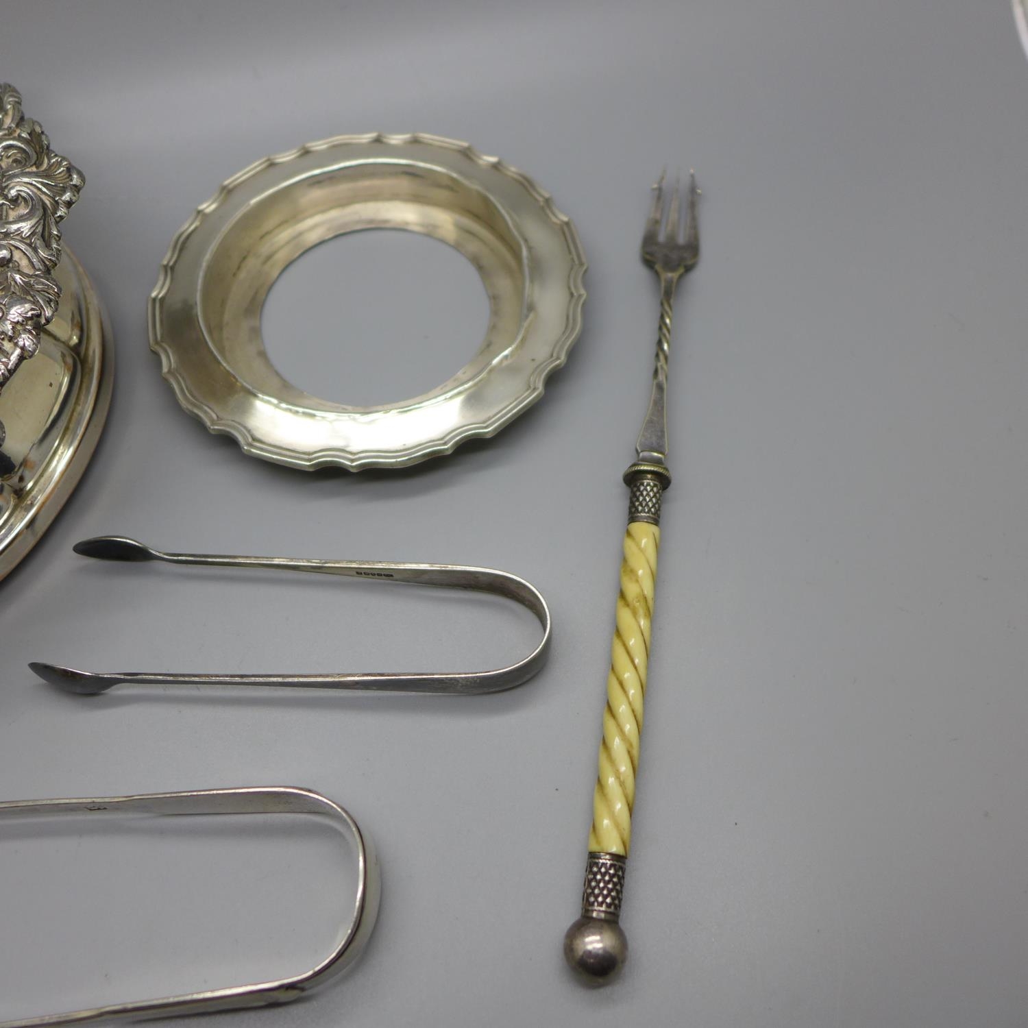 A pair of silver sugar bows, a silver butter dish stand, lacking glass liner, a plated coaster. a pickle fork and a pair of plated sugar bows, 97g of silver