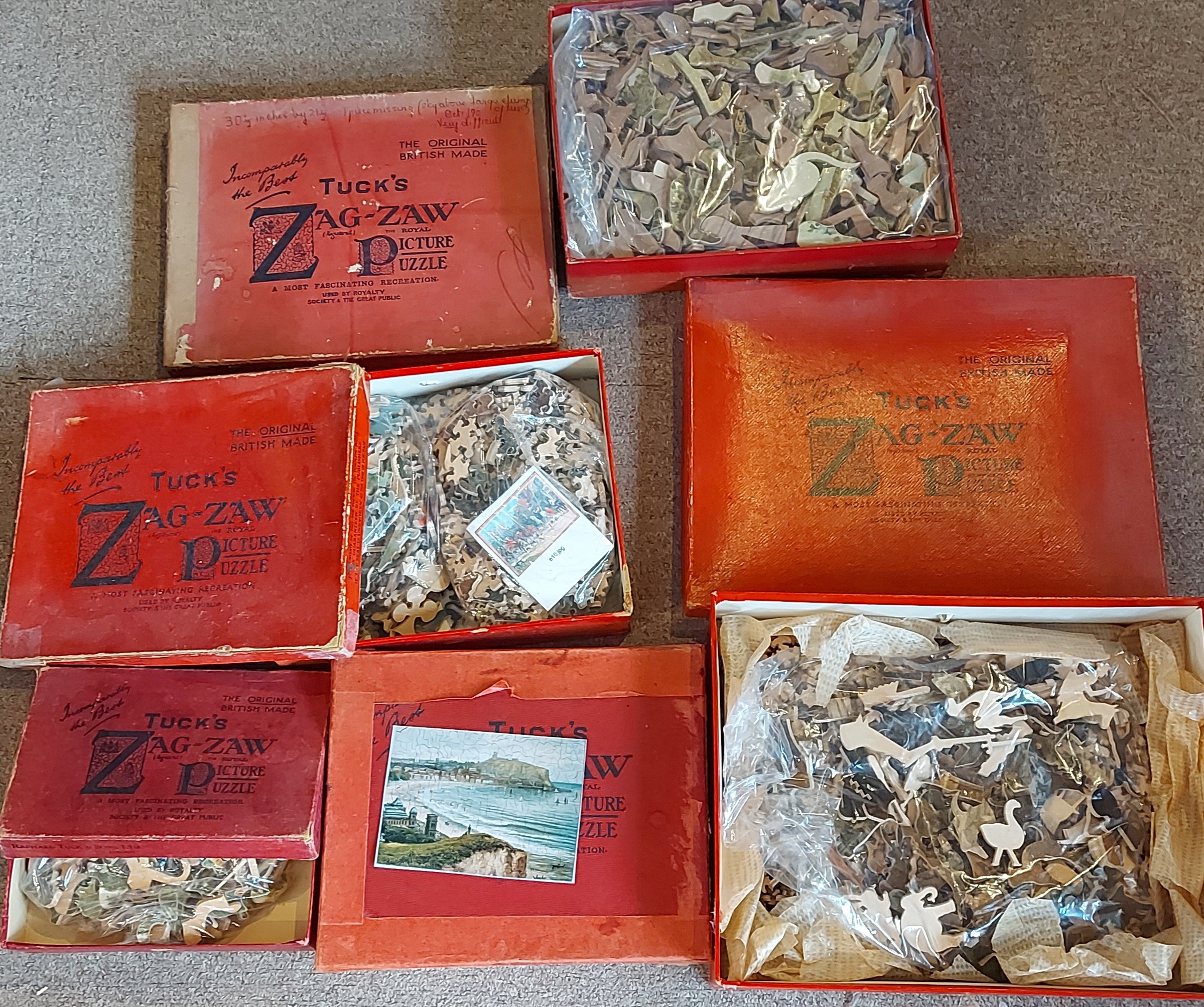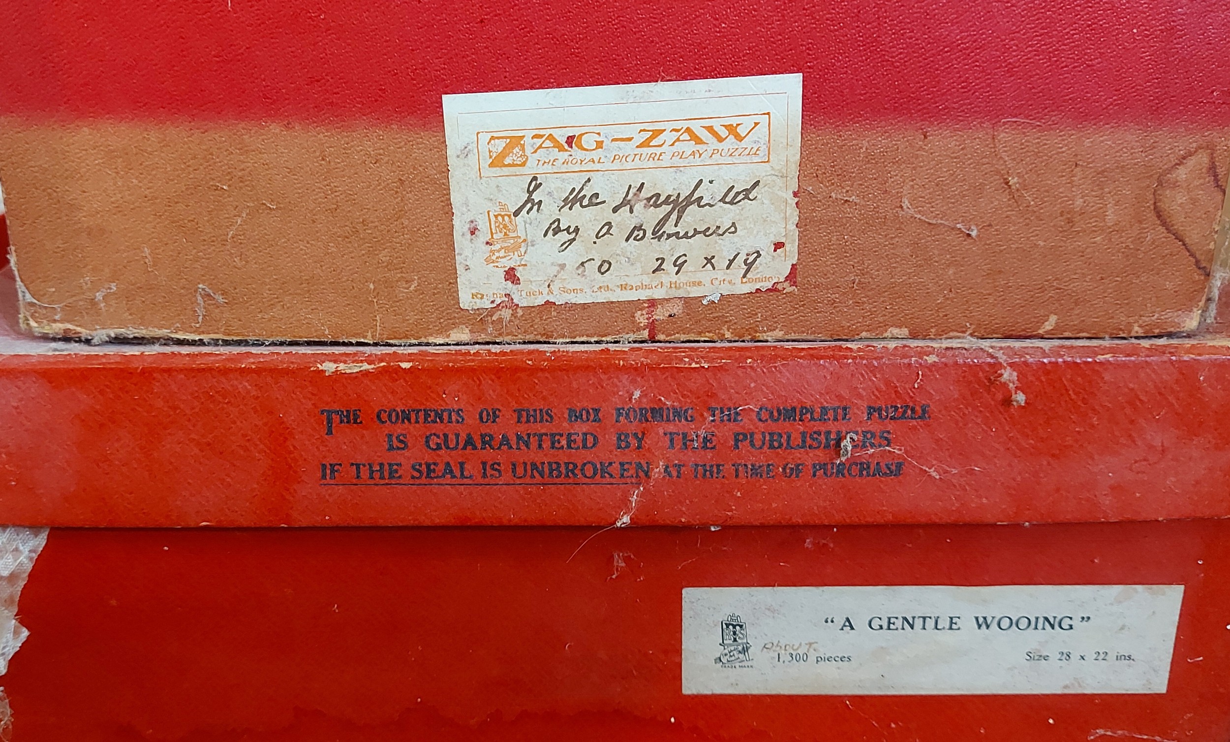 A Raphael Tuck and Sons Zag Zaw Jigsaw puzzle A Gentle Wooing together with four other Zag Zaw puzzles