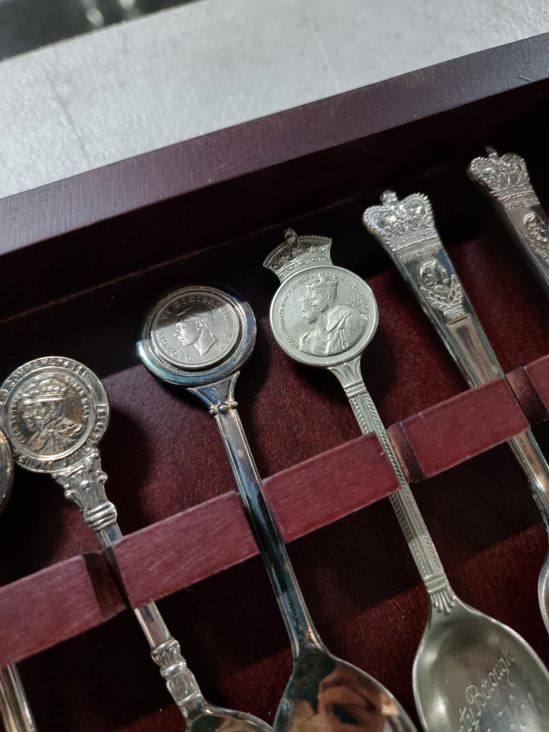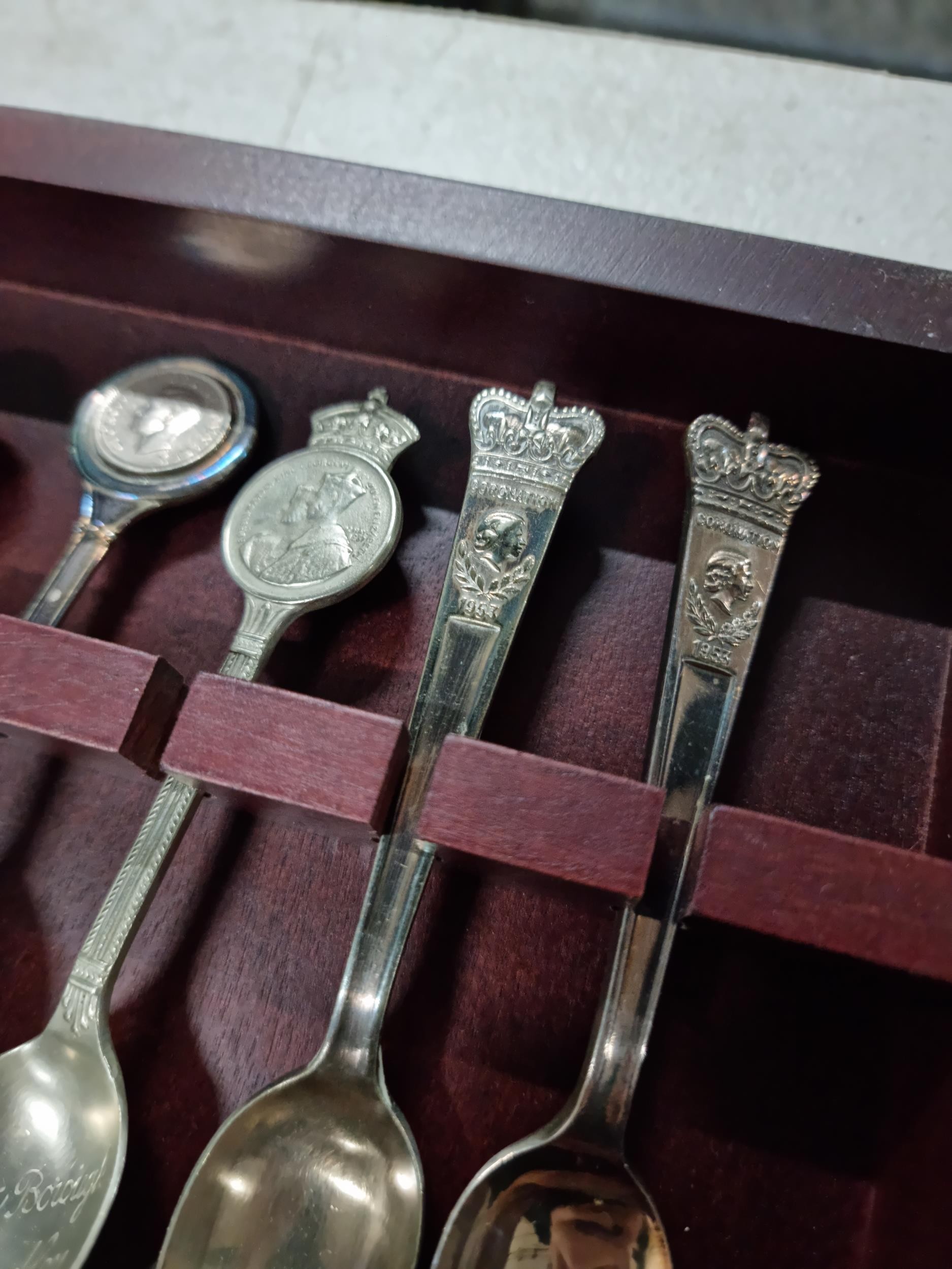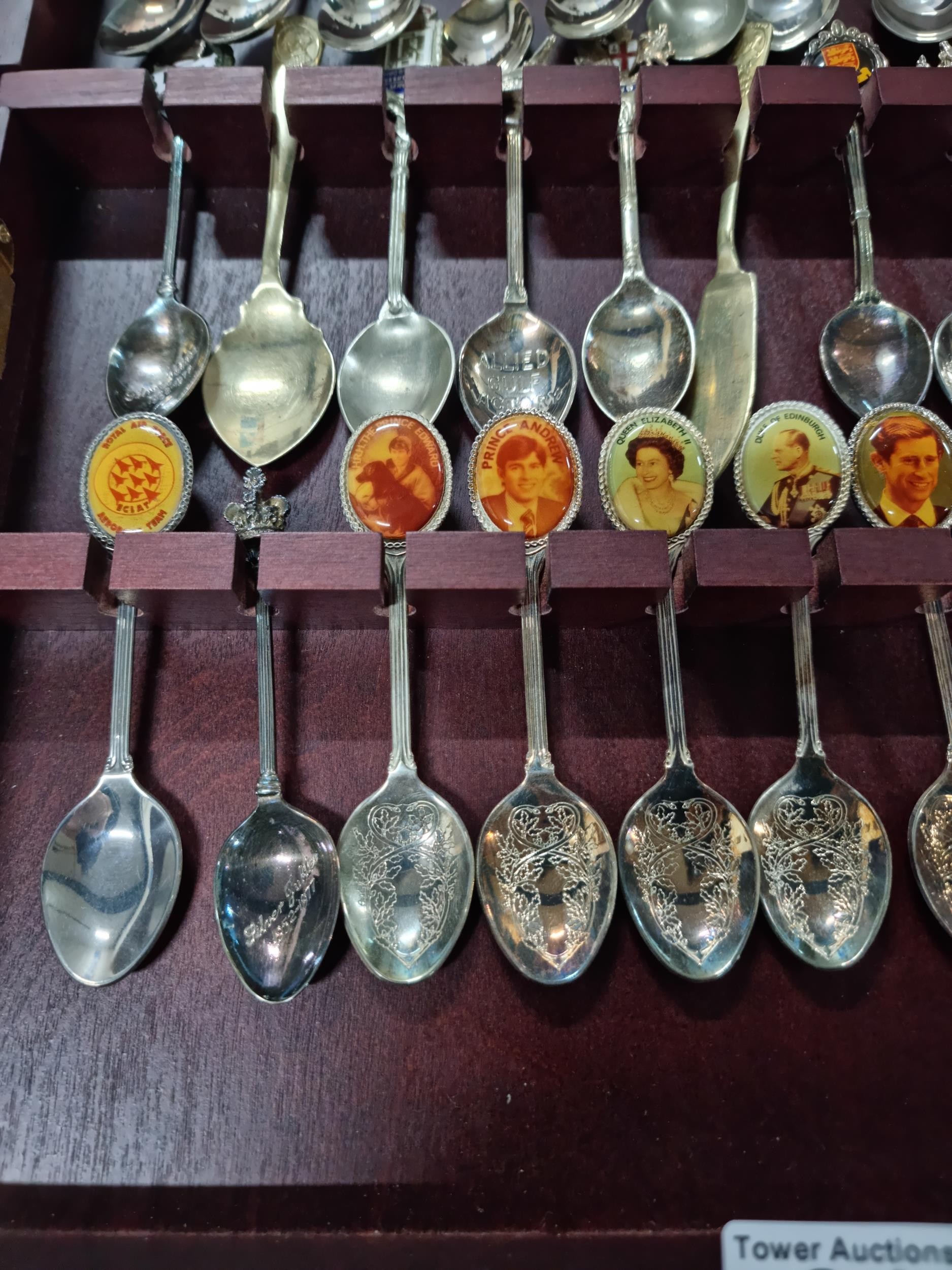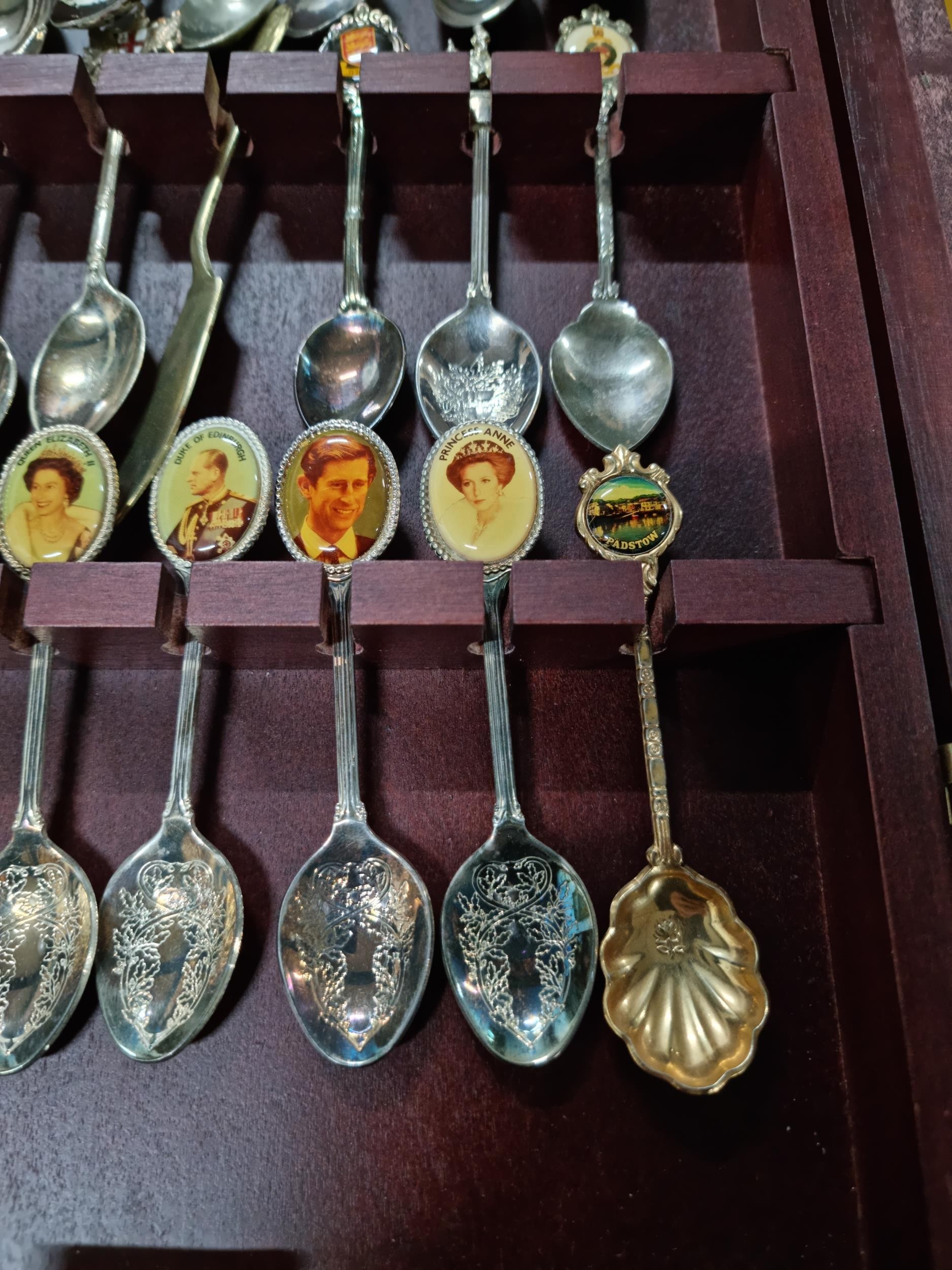 Cased collection of teaspoons relating to the Royal Family inc Her Majesty the Queen, Prince Phillip The Duke of Edinburgh, Prince Charles, The Princess Royal, some of the spoons are decorated with coins to the top , coats of arms, picture profiles etc, box measures 40cm high 32cm wide