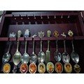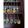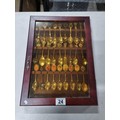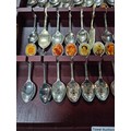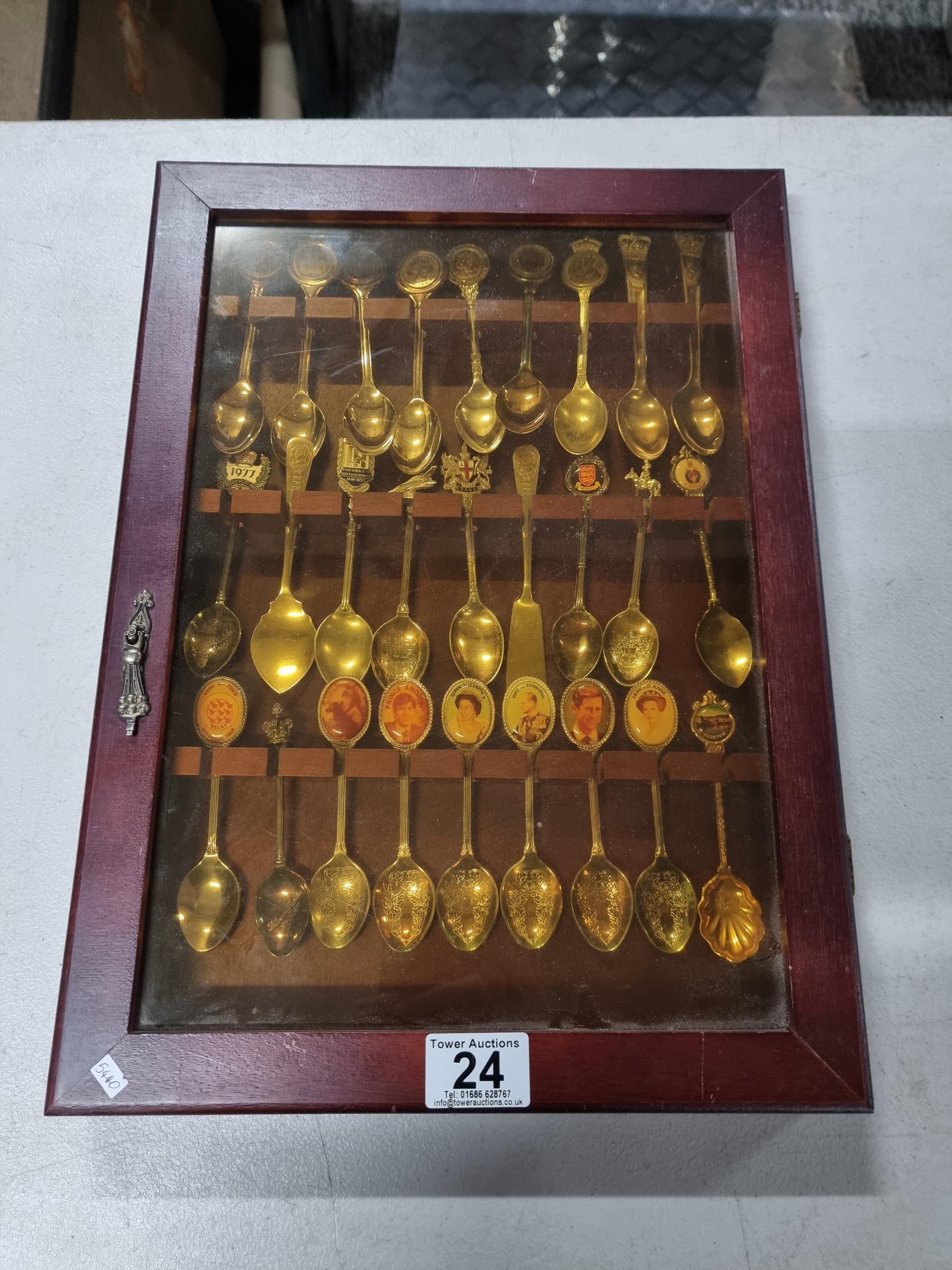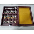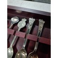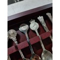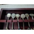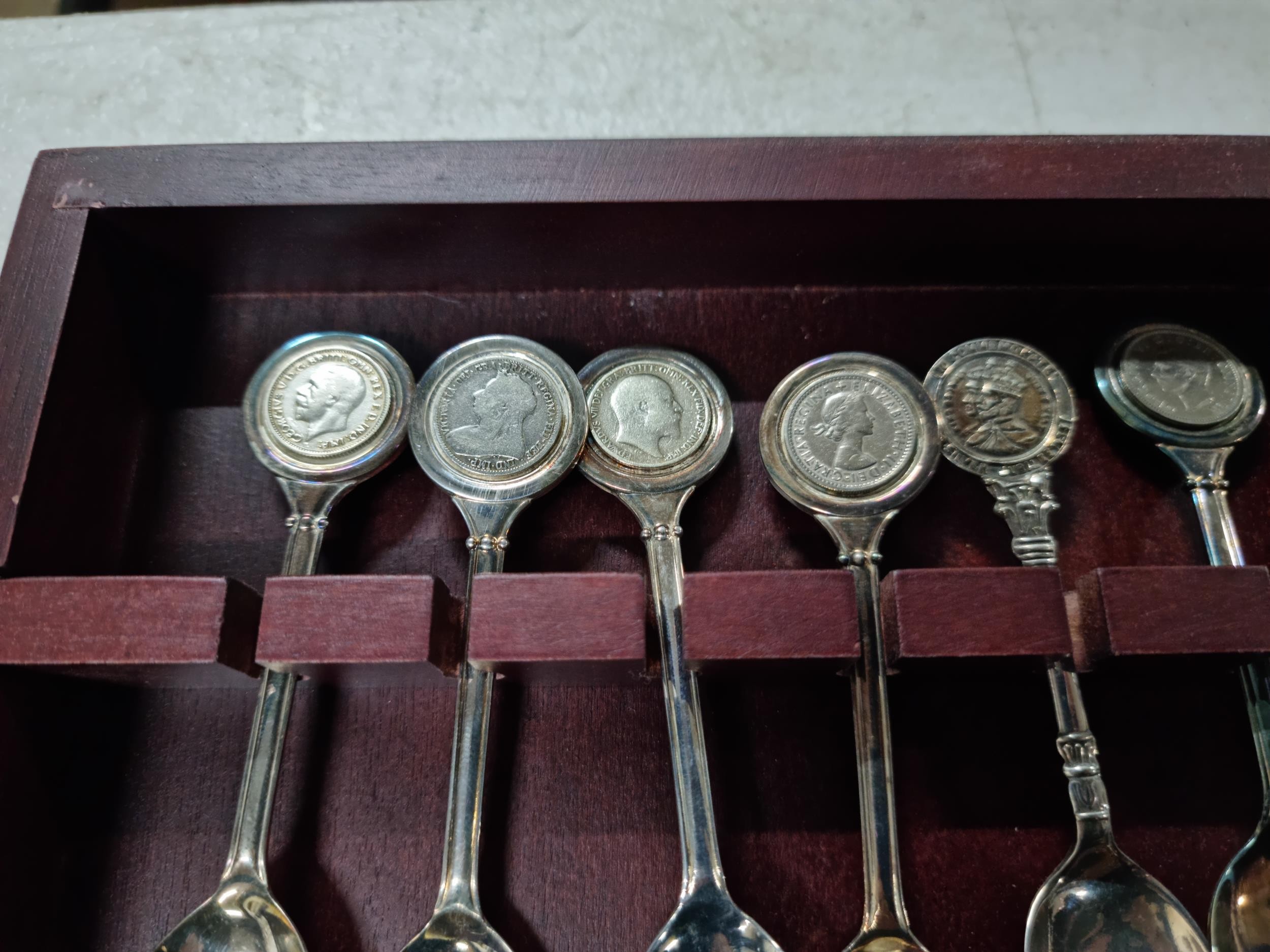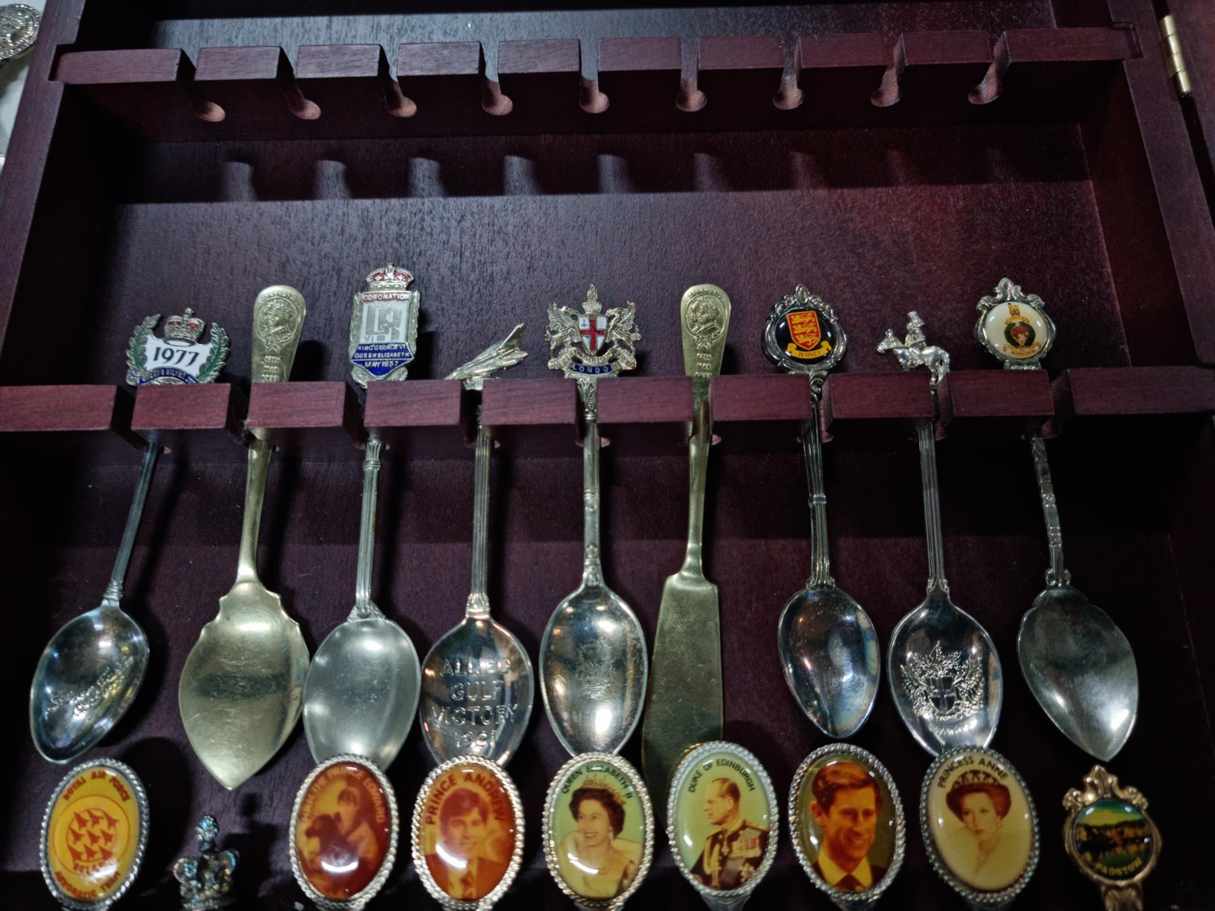 Cased collection of teaspoons relating to the Royal Family inc Her Majesty the Queen, Prince Phillip The Duke of Edinburgh, Prince Charles, The Princess Royal, some of the spoons are decorated with coins to the top , coats of arms, picture profiles etc, box measures 40cm high 32cm wide