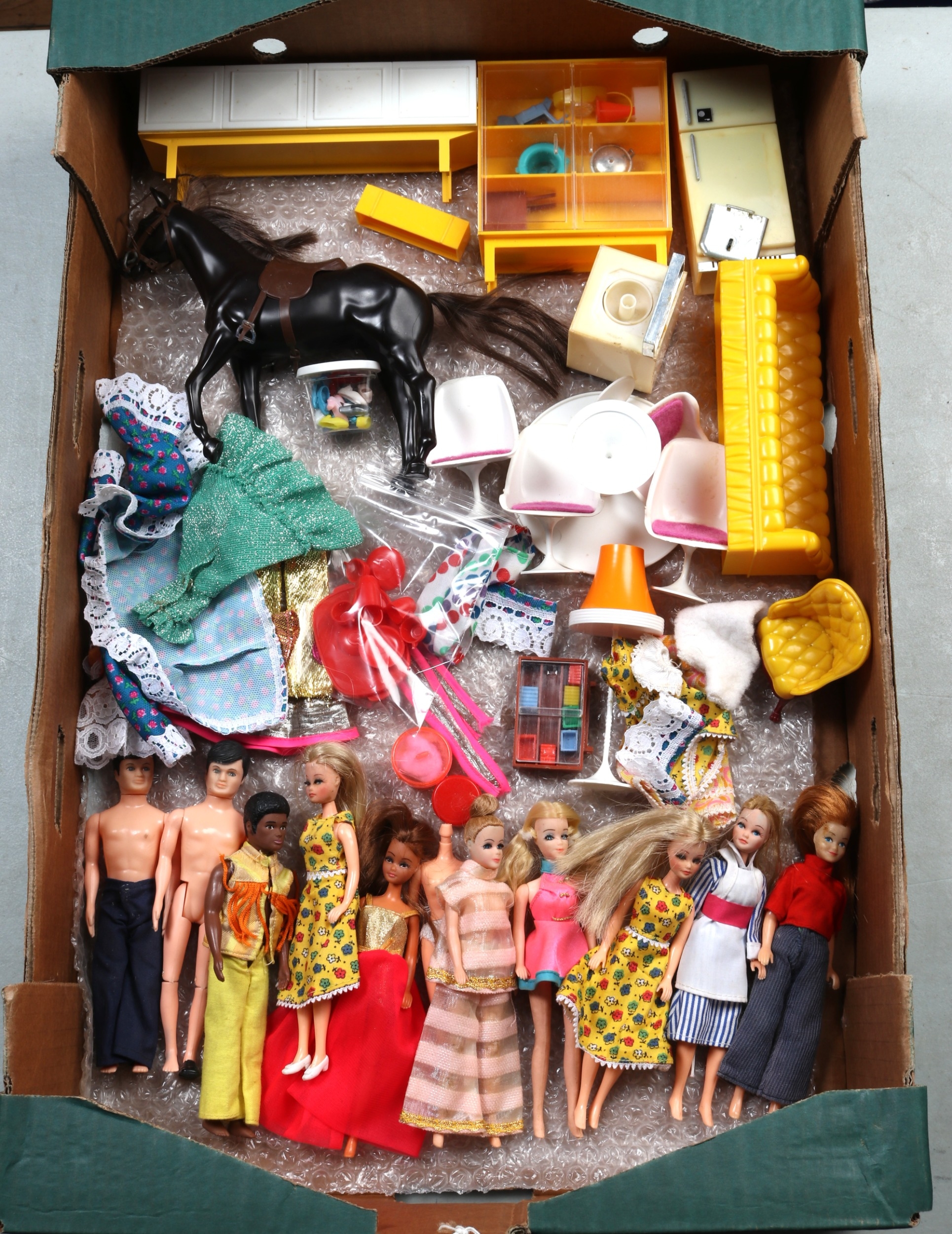 PALITOY PIPPA. 11 Dolls, One missing it's head. Includes 2x Peter, Blonde hair Pippa, Brown hair Pippa, also includes VAN by Topper Dawn. Accessories include Horse, Sideboard, Bookcase, Retro Dining Set, Radio, spare clothing and shoes. GC-VGC £100-150