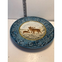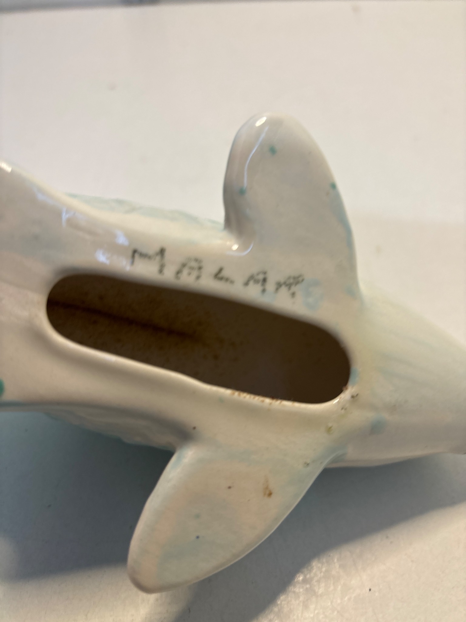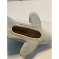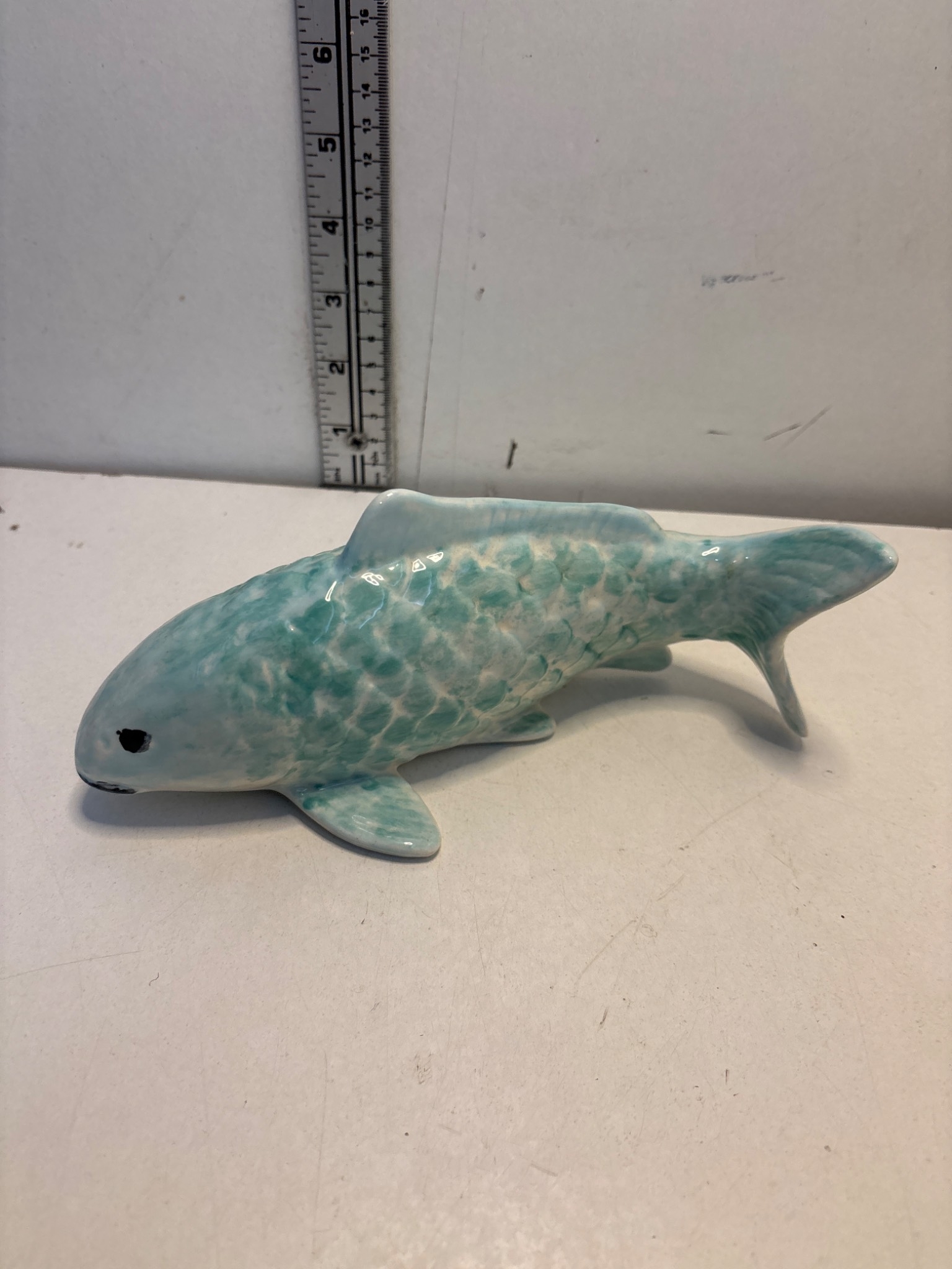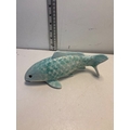 Handcrafted ceramic fish figurine with light blue glaze, signed 'MALMR' on the underside; measures approximately 7 inches long.