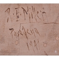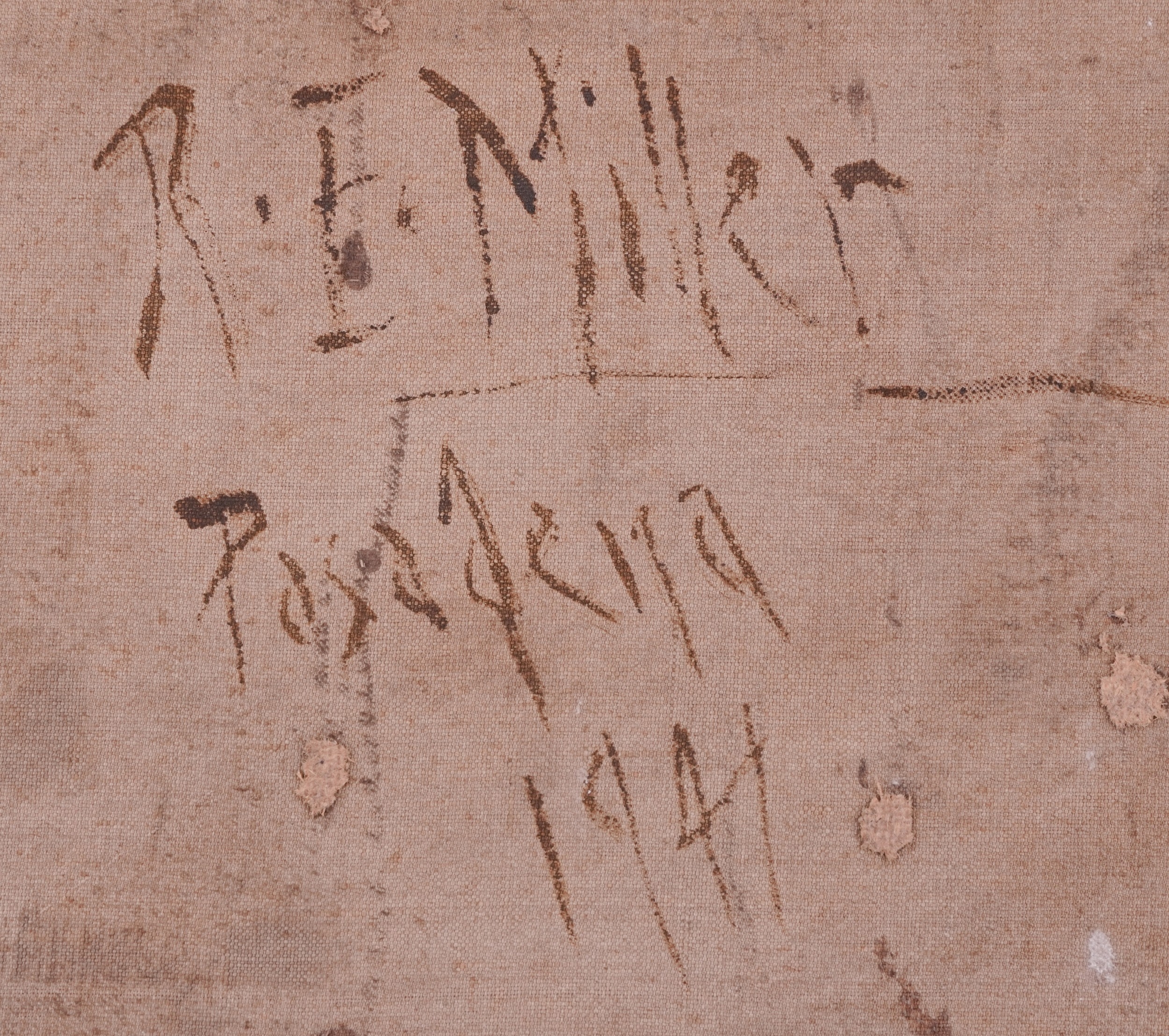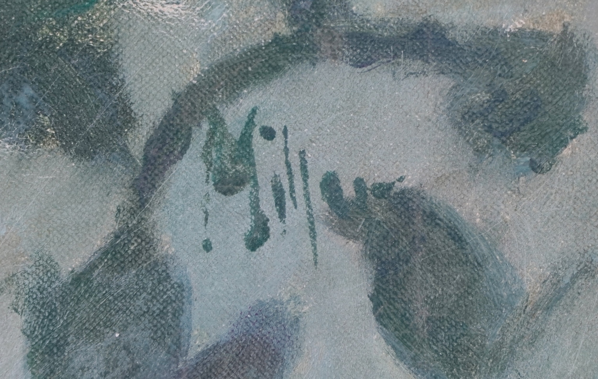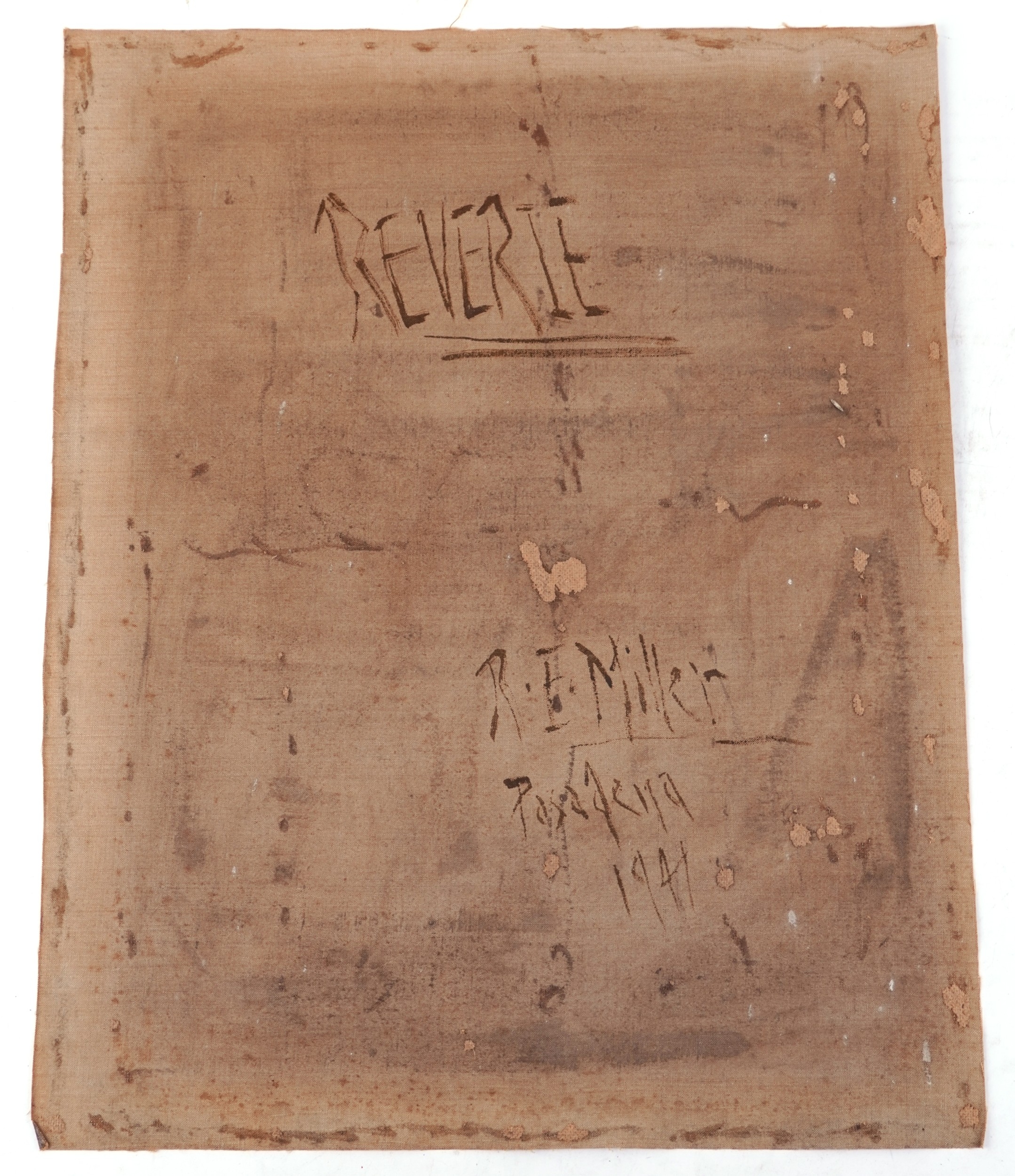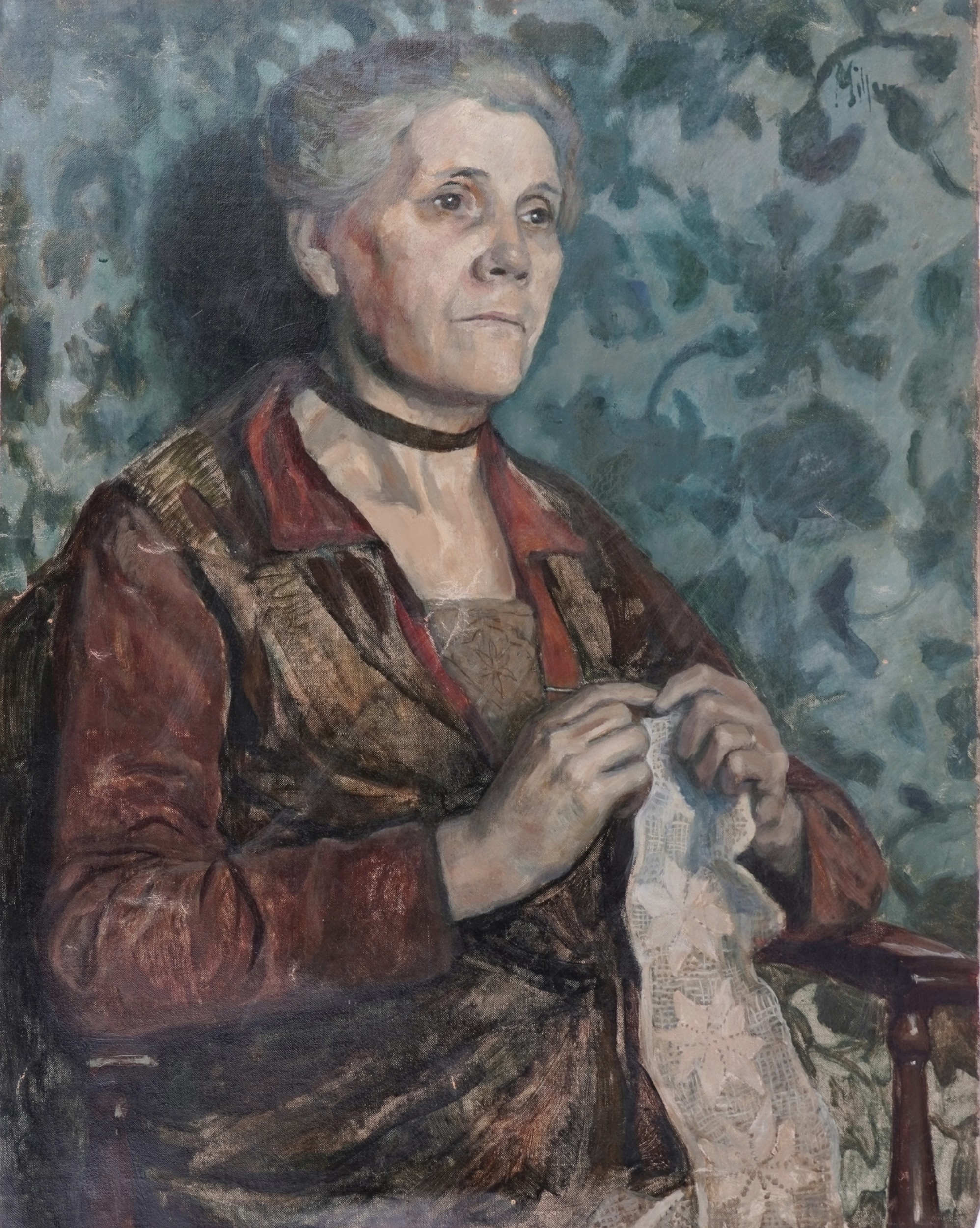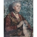 A half length portrait of a lady crocheting, mid 20th century oil on canvas, signed Miller, bearing inscription verso, unframed, 67cm x 54cm.