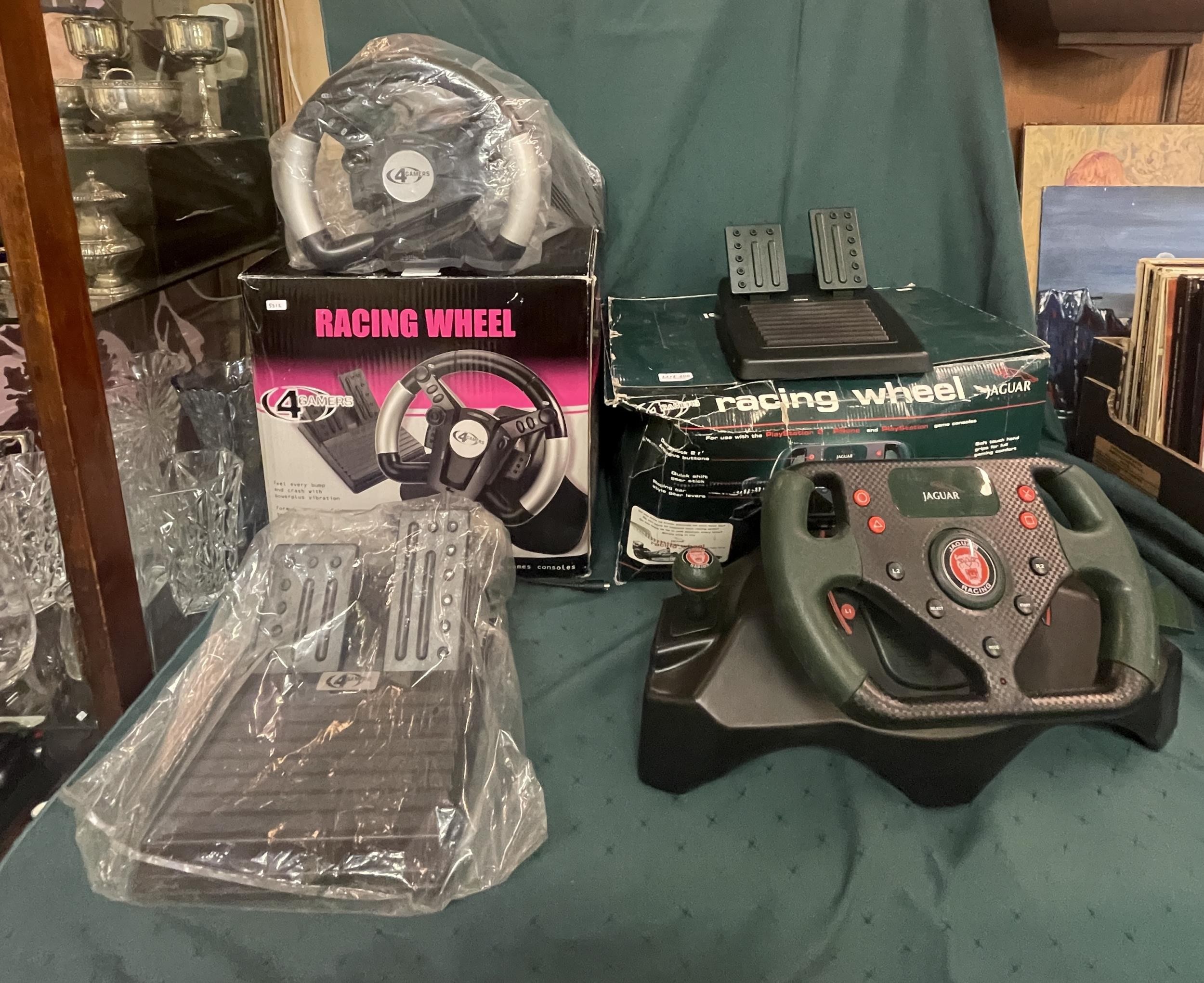 TWO VINTAGE GAMING STEERING WHEELS - BOXED JAGUAR RACING WHEEL FOR PS2 AND PS1 - SPC888 & BOXED FOR GAMERS RACING WHEEL - FOR PS1 - SPC026