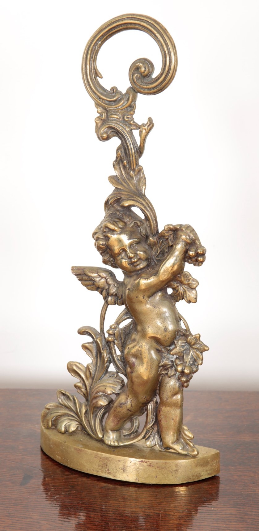 A VICTORIAN BRASS DOOR STOPfigured as a cherub amongst vines, stamped to the base 'Peerage England 4370', 49cm high