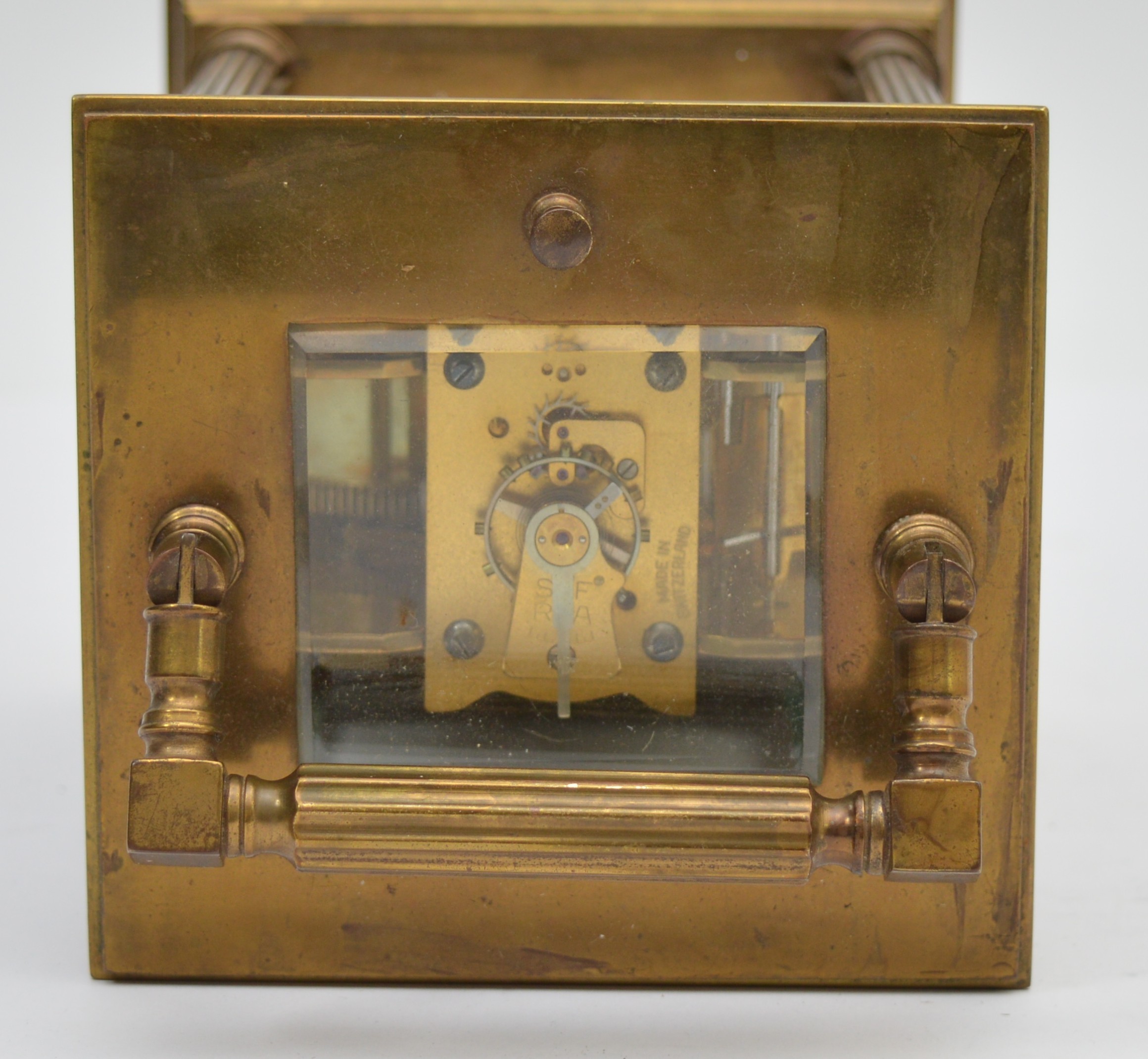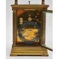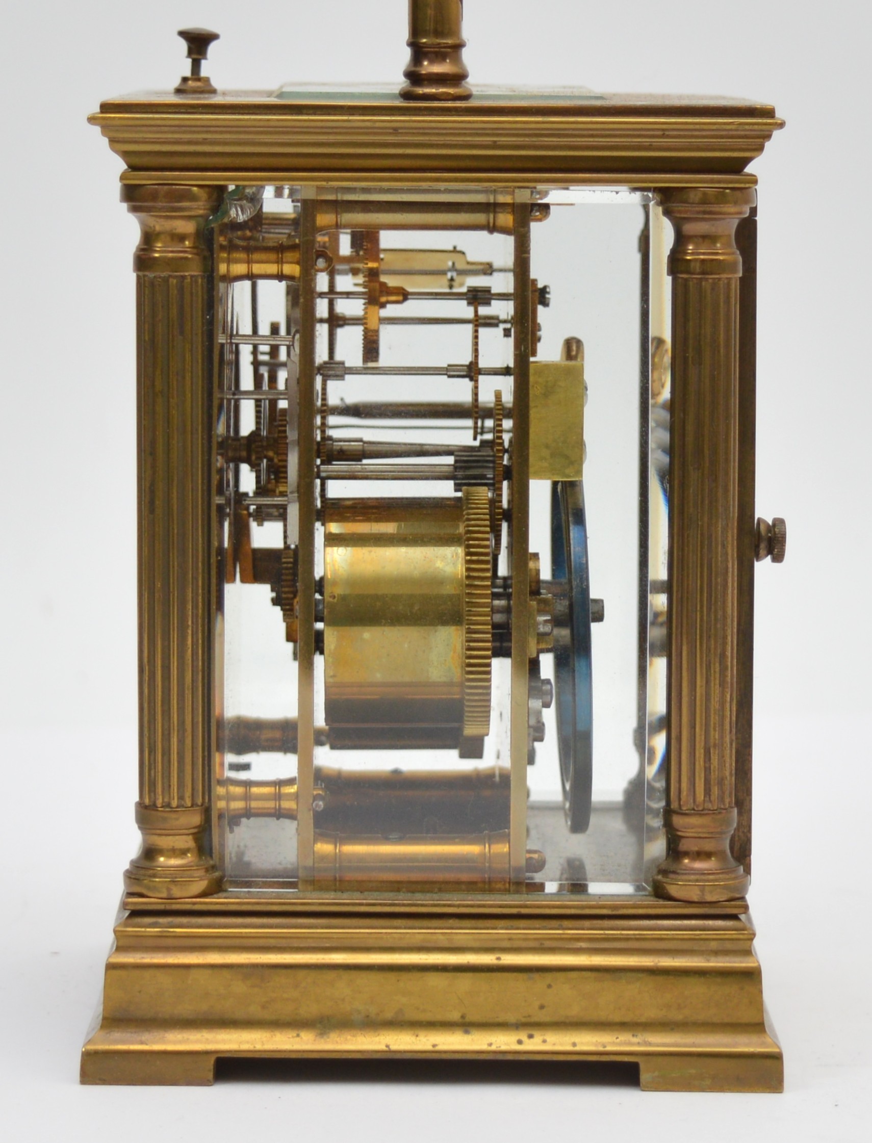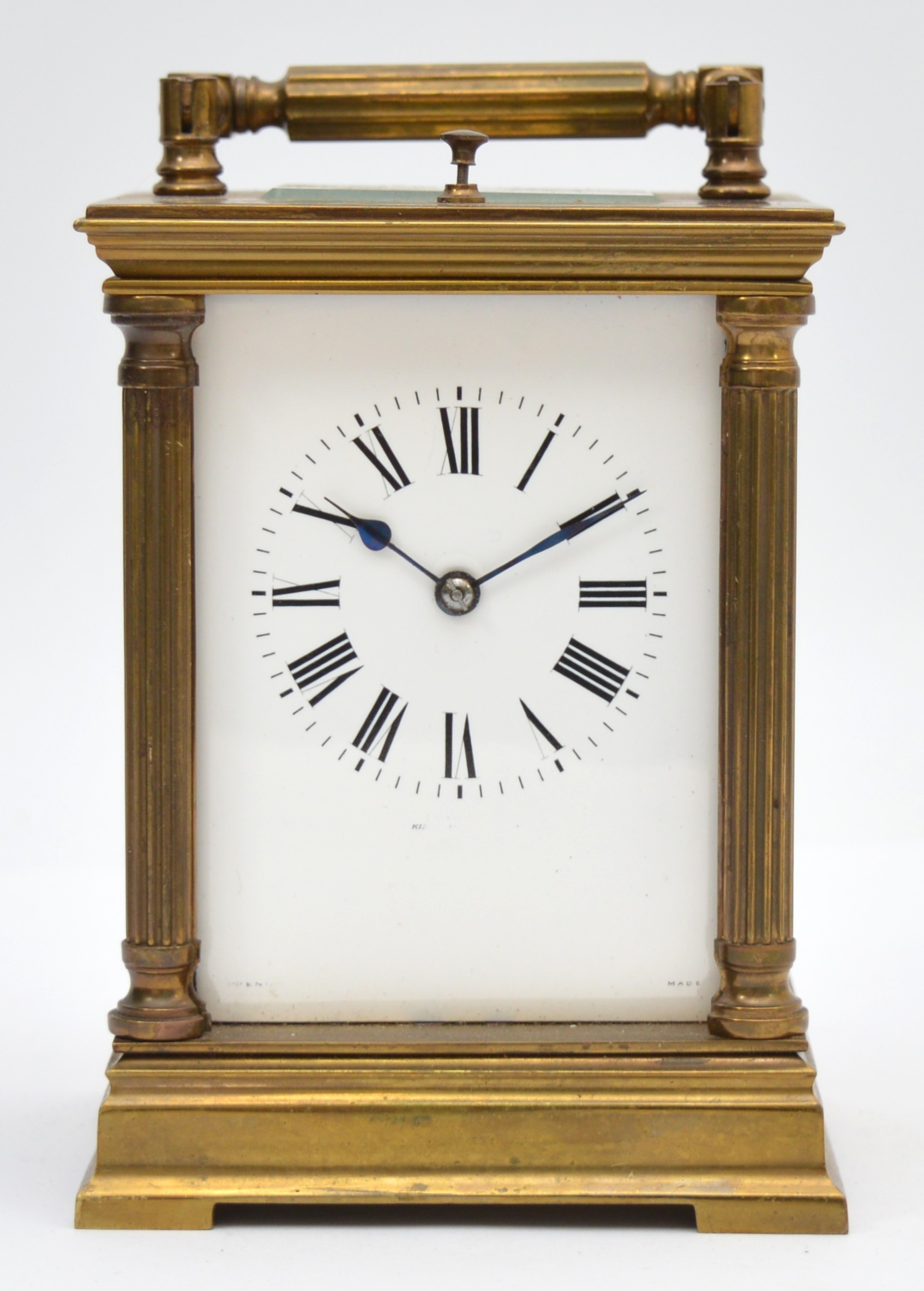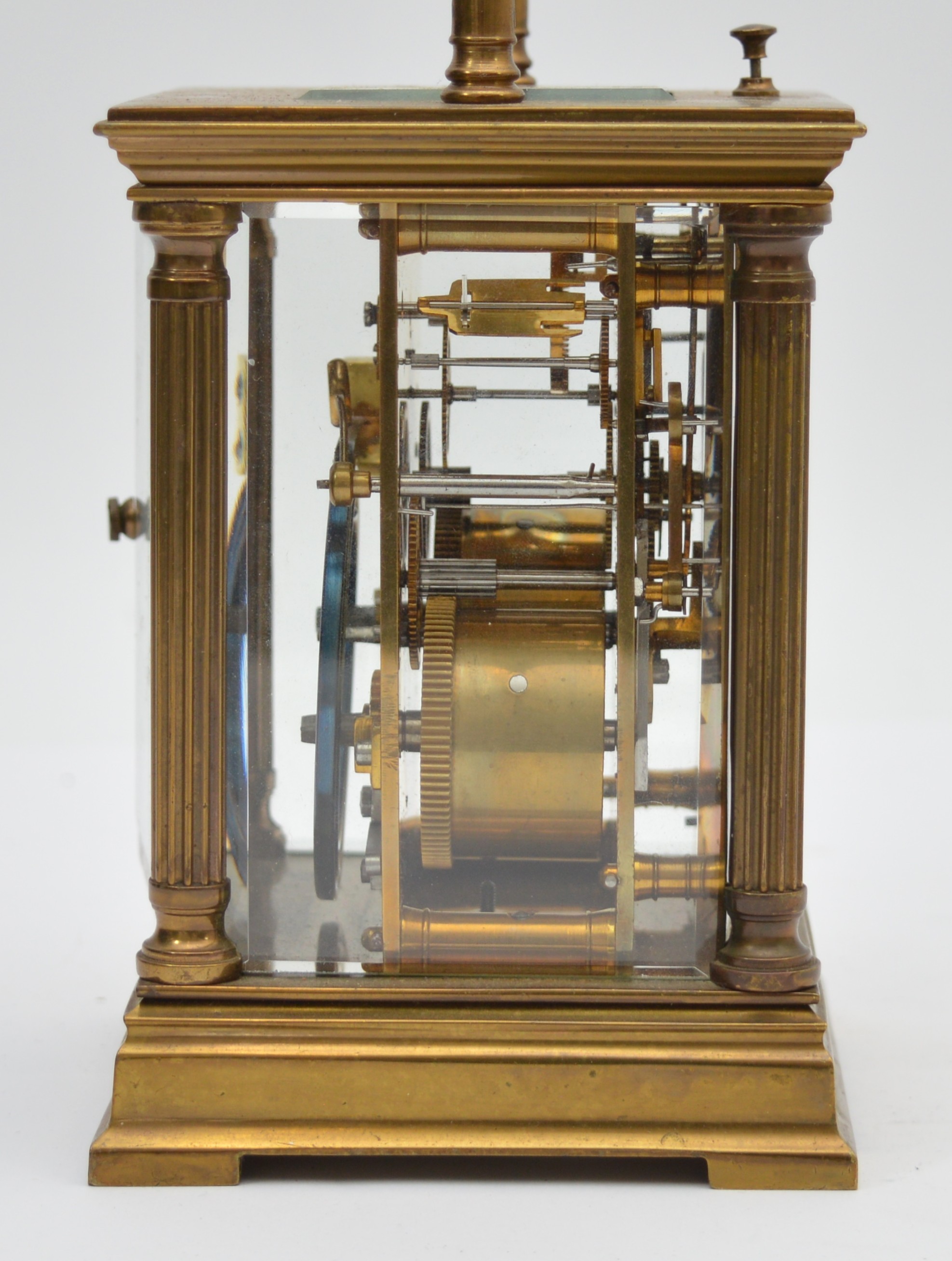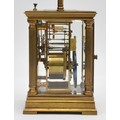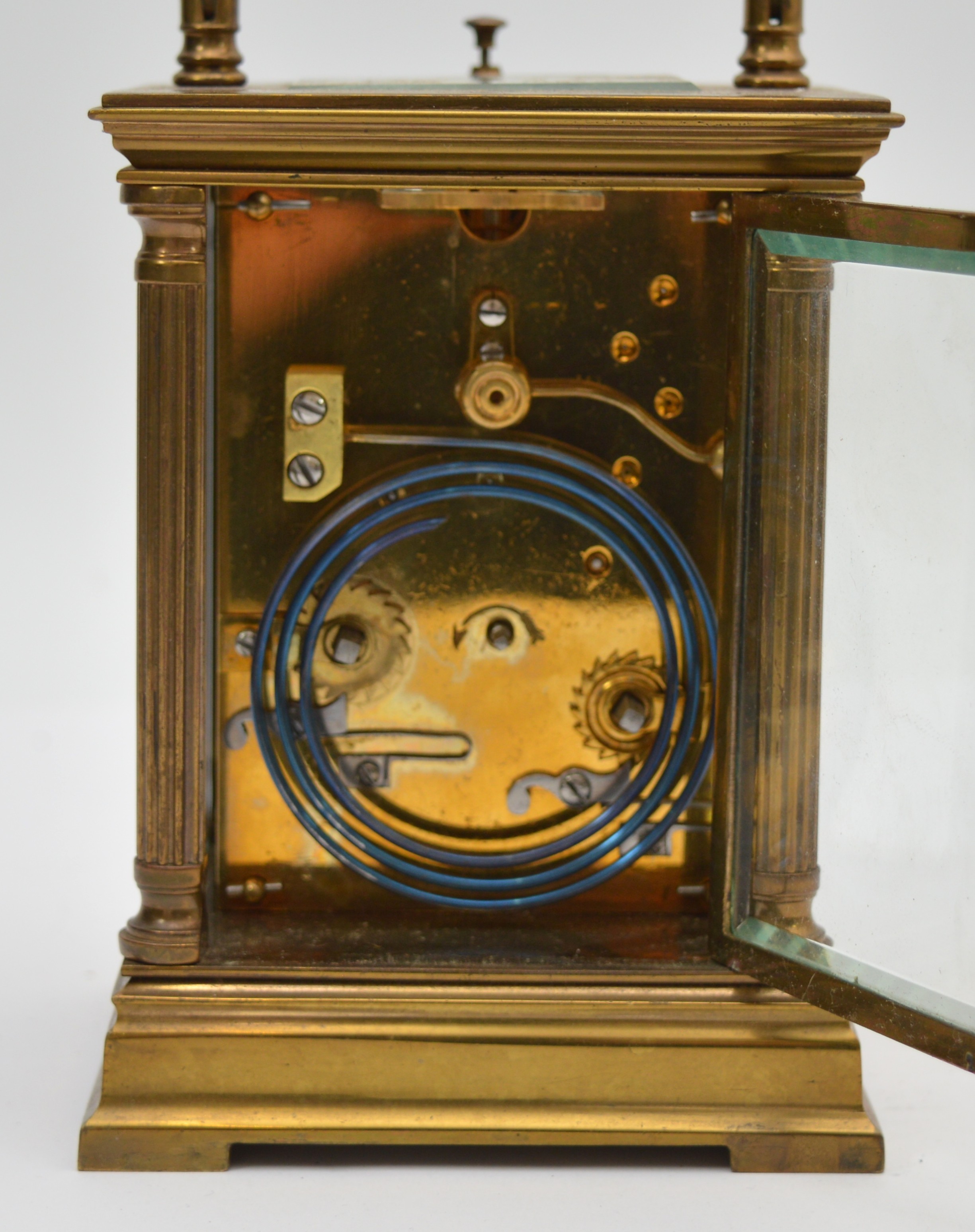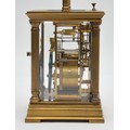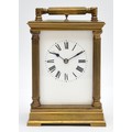An early 20th century brass repeating and striking carriage clock, white enamel dial with Roman numerals, the eight day movement striking the hours and half on a gong, case with reeded pillars, 15.5cm.
