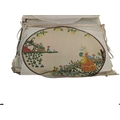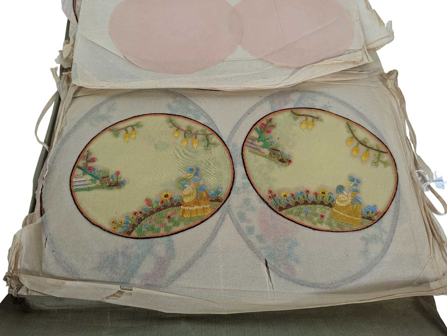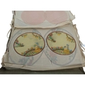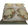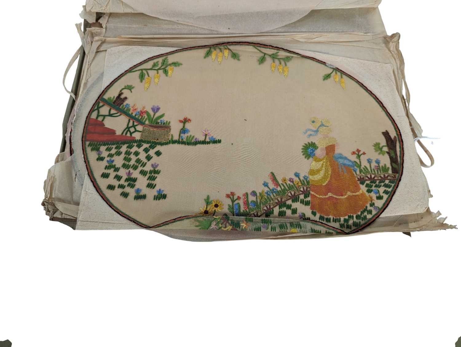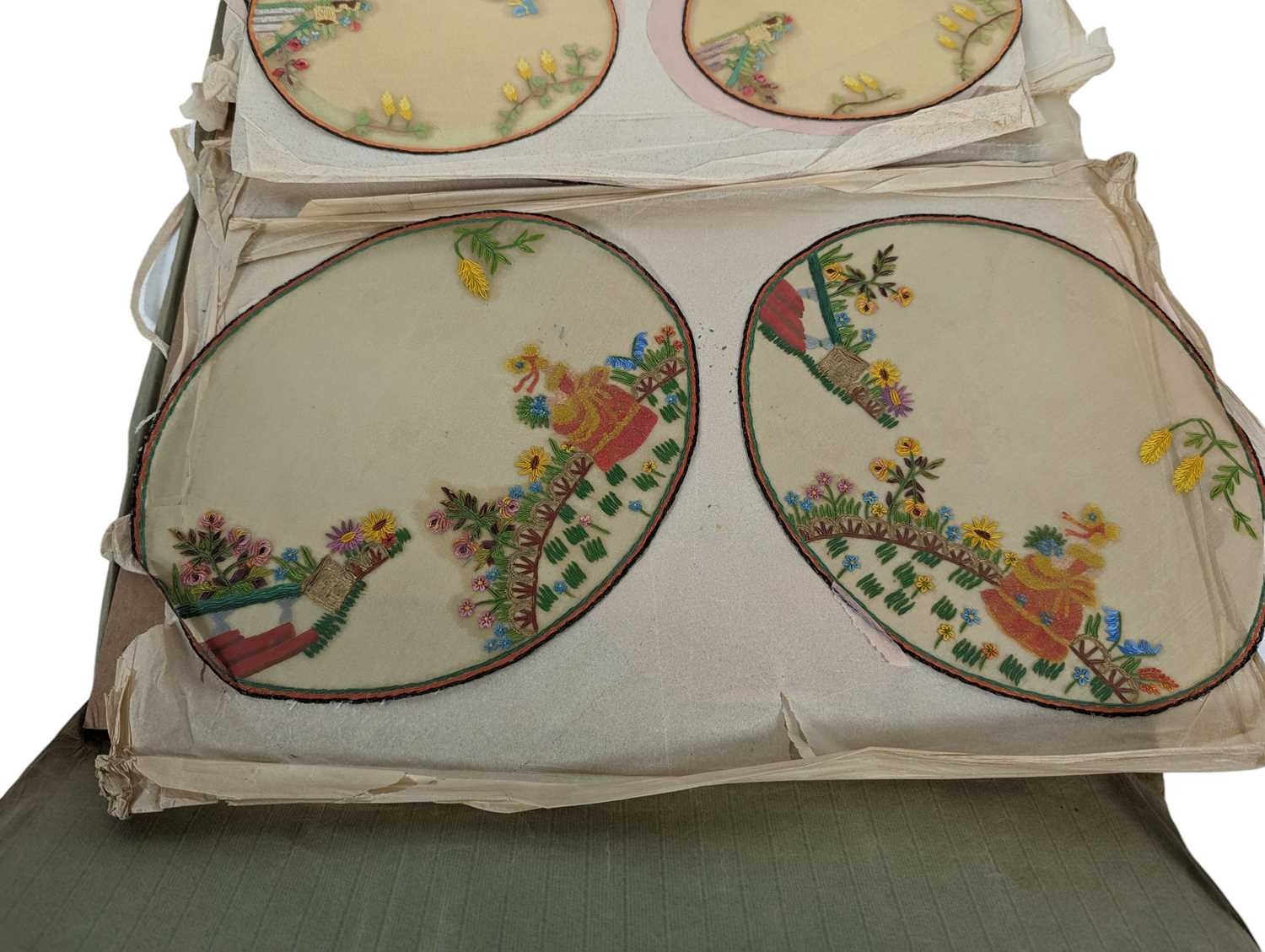 Collection of 20th century vintage hand painted oval Chinese silk dressing table mats / toppers. Varying in sizes, each depicting a lady dressed in yellow and blue against a floral background. Housed within a paper folder. Largest panel measuring approx. 38cm x 28cm.