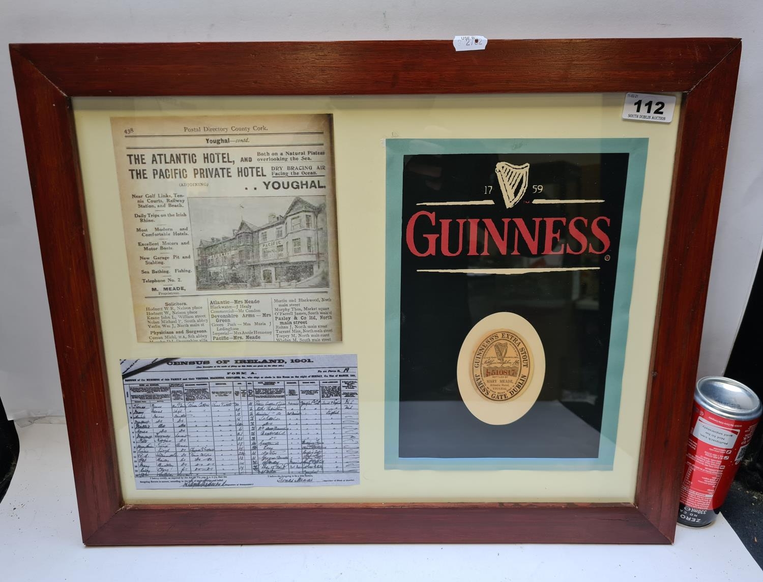 Guinness framed label, Inc a Census of Ireland 1901 document and an article regarding the The Atlantic Hotel in Cork. All related.