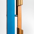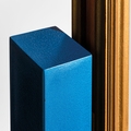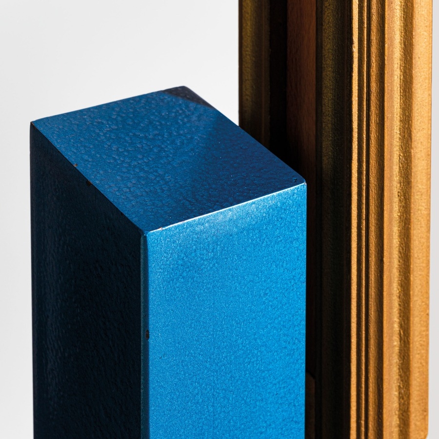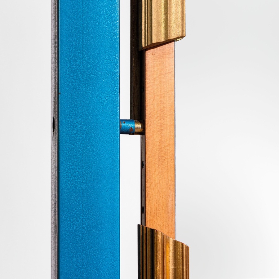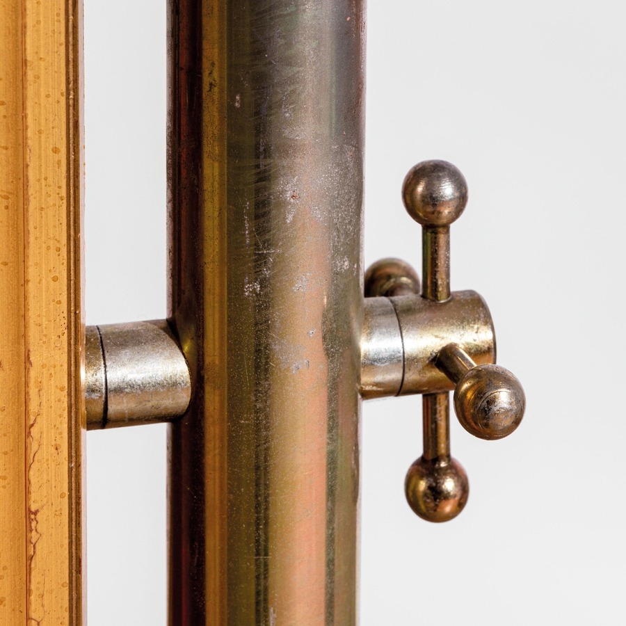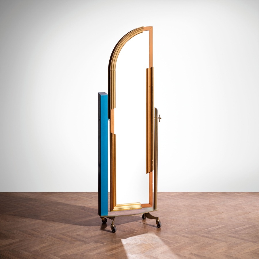 Psiche da centro per TopTen, Torino. Metallo zincato, legno di frutto, legno di faggio, metallo smaltato, vetro specchiato. Italia, 1990 ca.