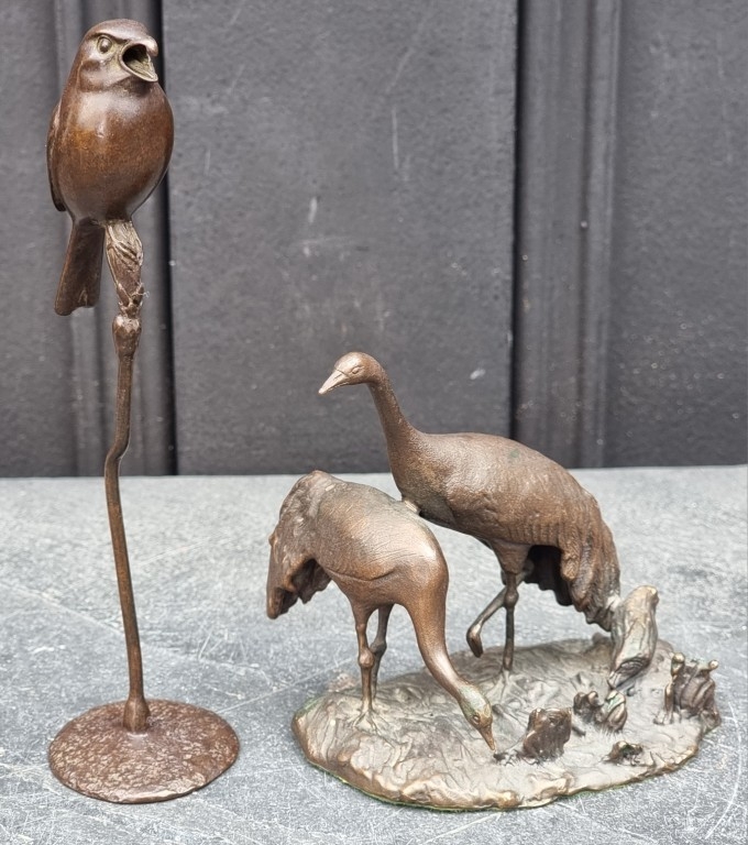 A small bronze figure group of cranes, 9.5cm high; together with another bronze bird, 16cm high.