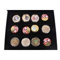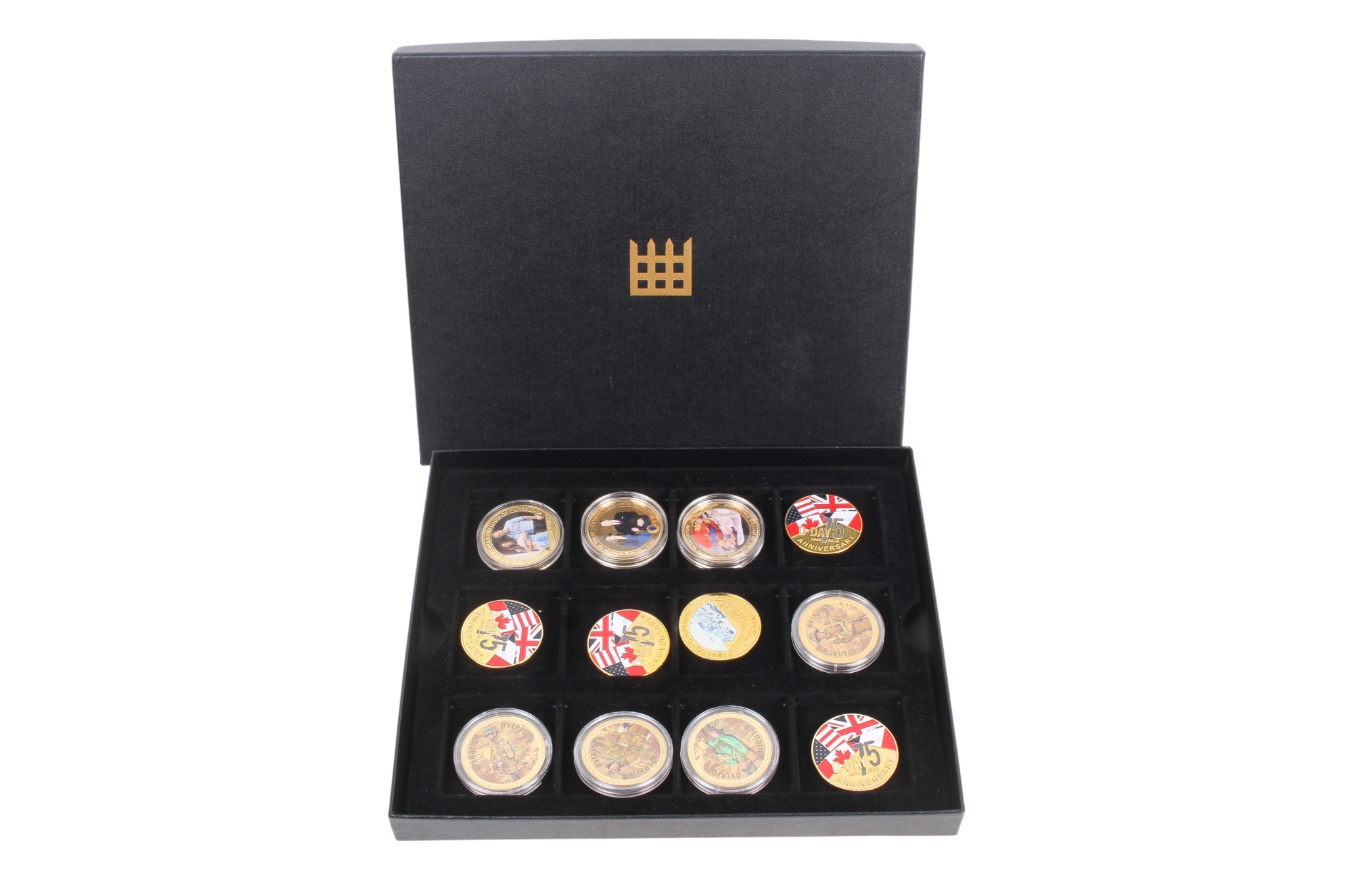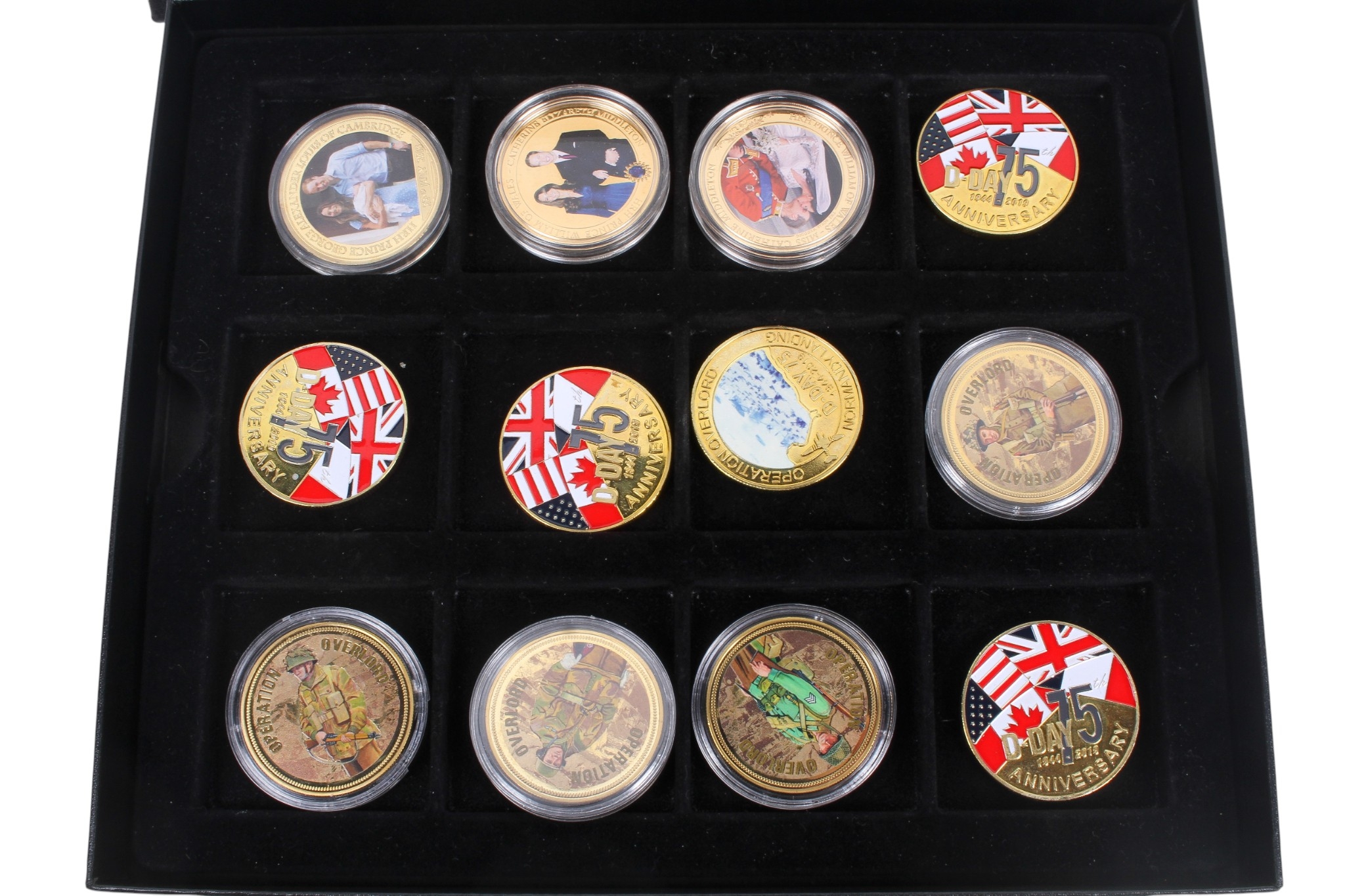 Boxed set of twelve 24K gold plated coins. Comprising of nine assorted Operation Overlord and three William and Kate. 40mm diameter