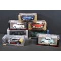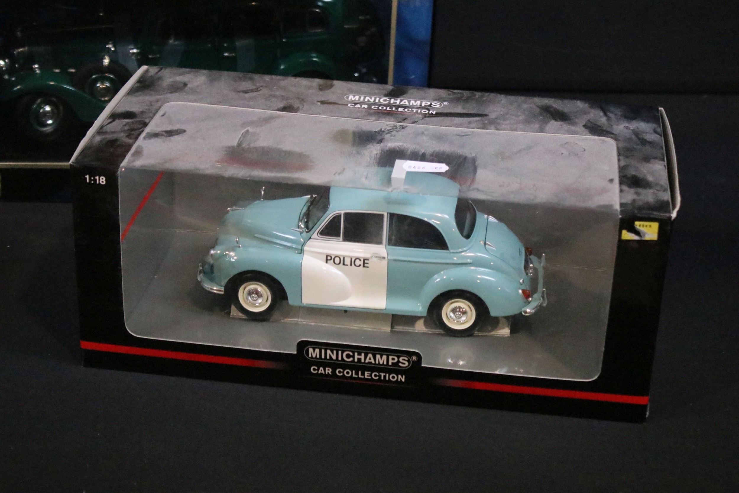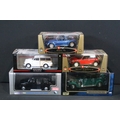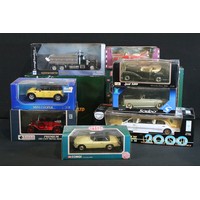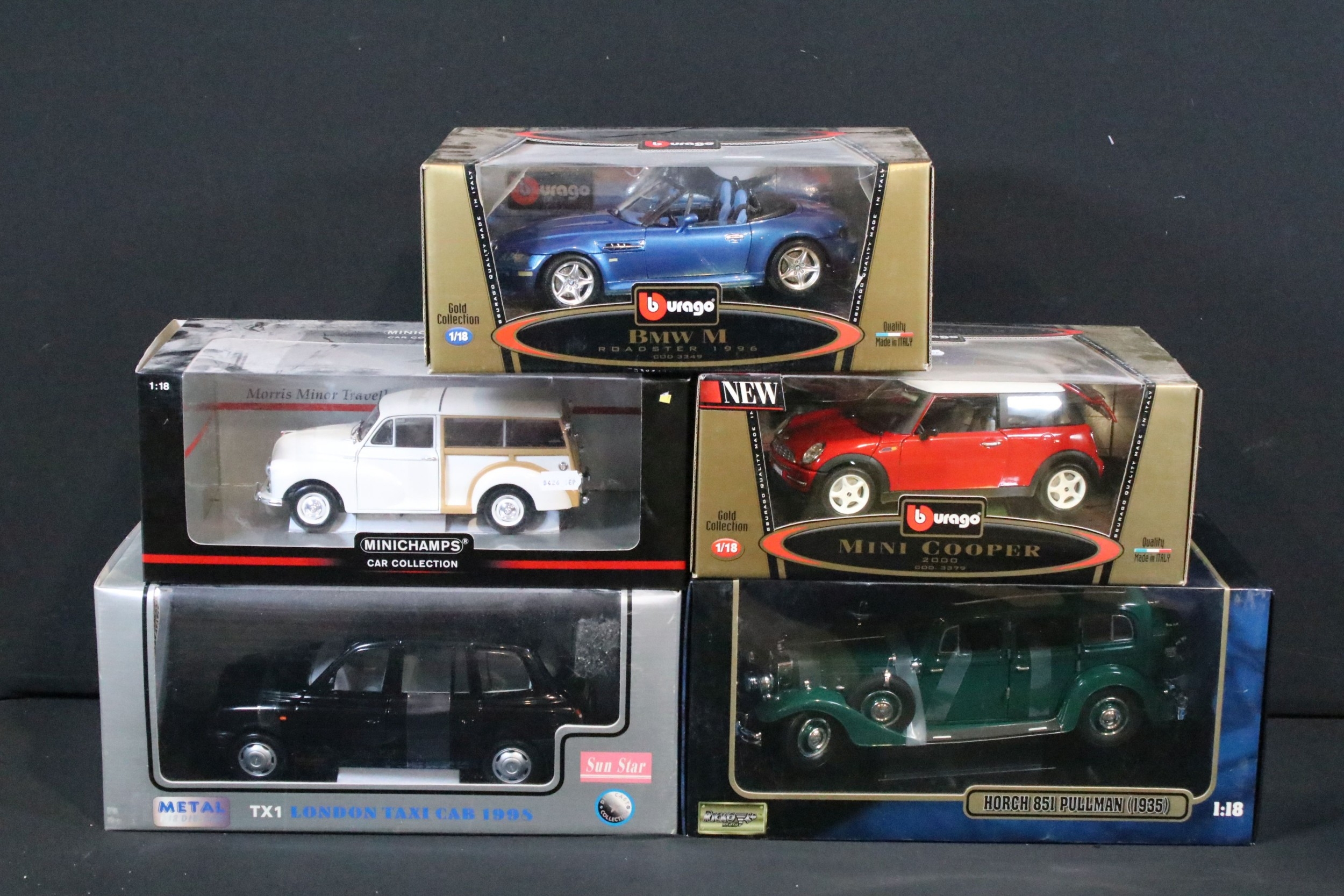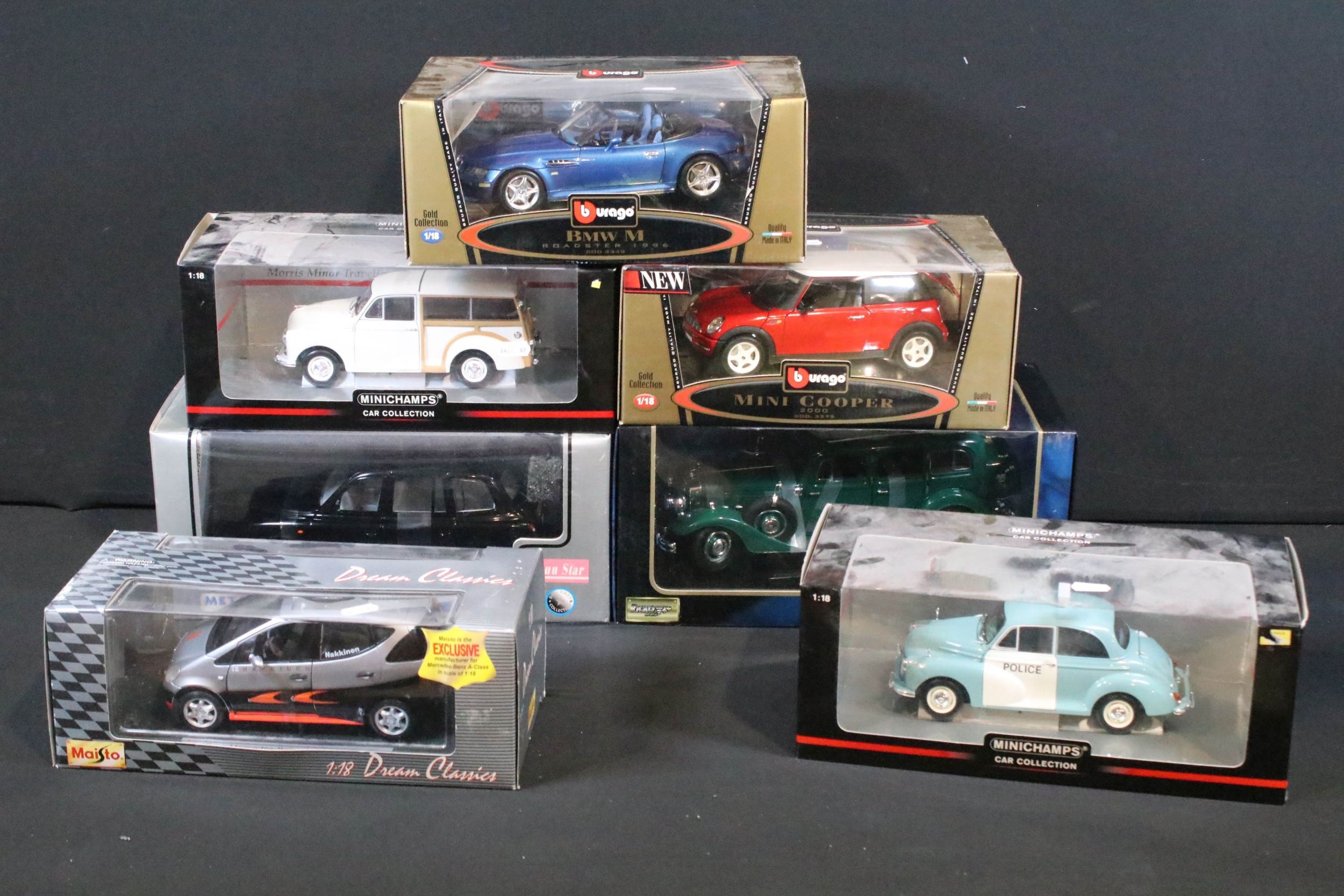 Seven boxed 1/18 scale diecast models to include Minichamps Car Collection 150137010 Morris Minor Traveller, Minichamps Car Collection 150137090 Morris Minor Police, Burago Gold Collection Mini Cooper 2000, Burago Gold Collection BMW M Roadster 1996, Sun Star London Taxi Cab 1998, etc, all diecast ex, boxes vg overall with some dustiness
